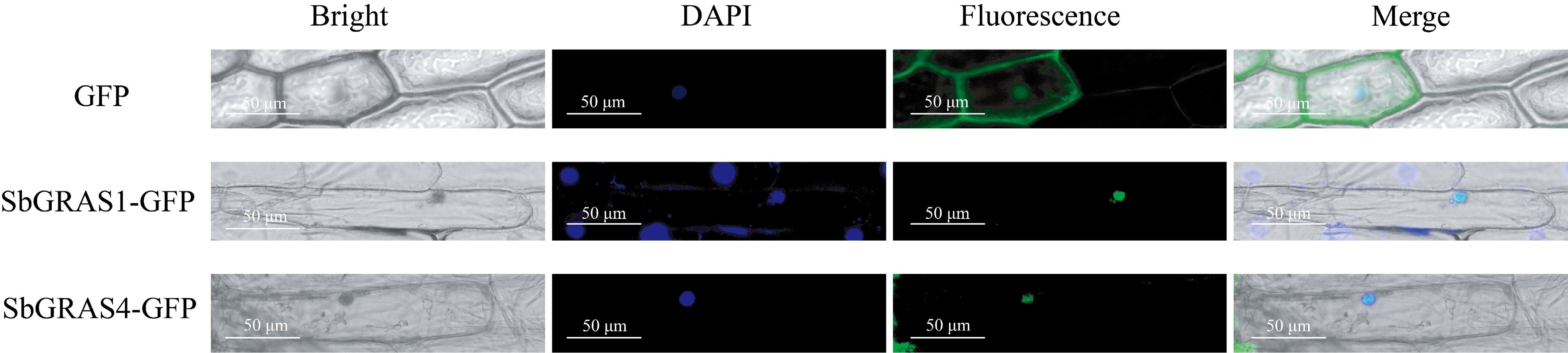 • To determine the localization of SbGRAS in cells, SbGRAS1/4-GFP vectors were constructed. The onion epidermis was impregnated via Agrobacterium transformation, observed the transient expression of SbGRASs-GFP by fluorescence microscopy (Leica DM6000B, Wetzlar, Germany), and observed the nucleus with DAPI.