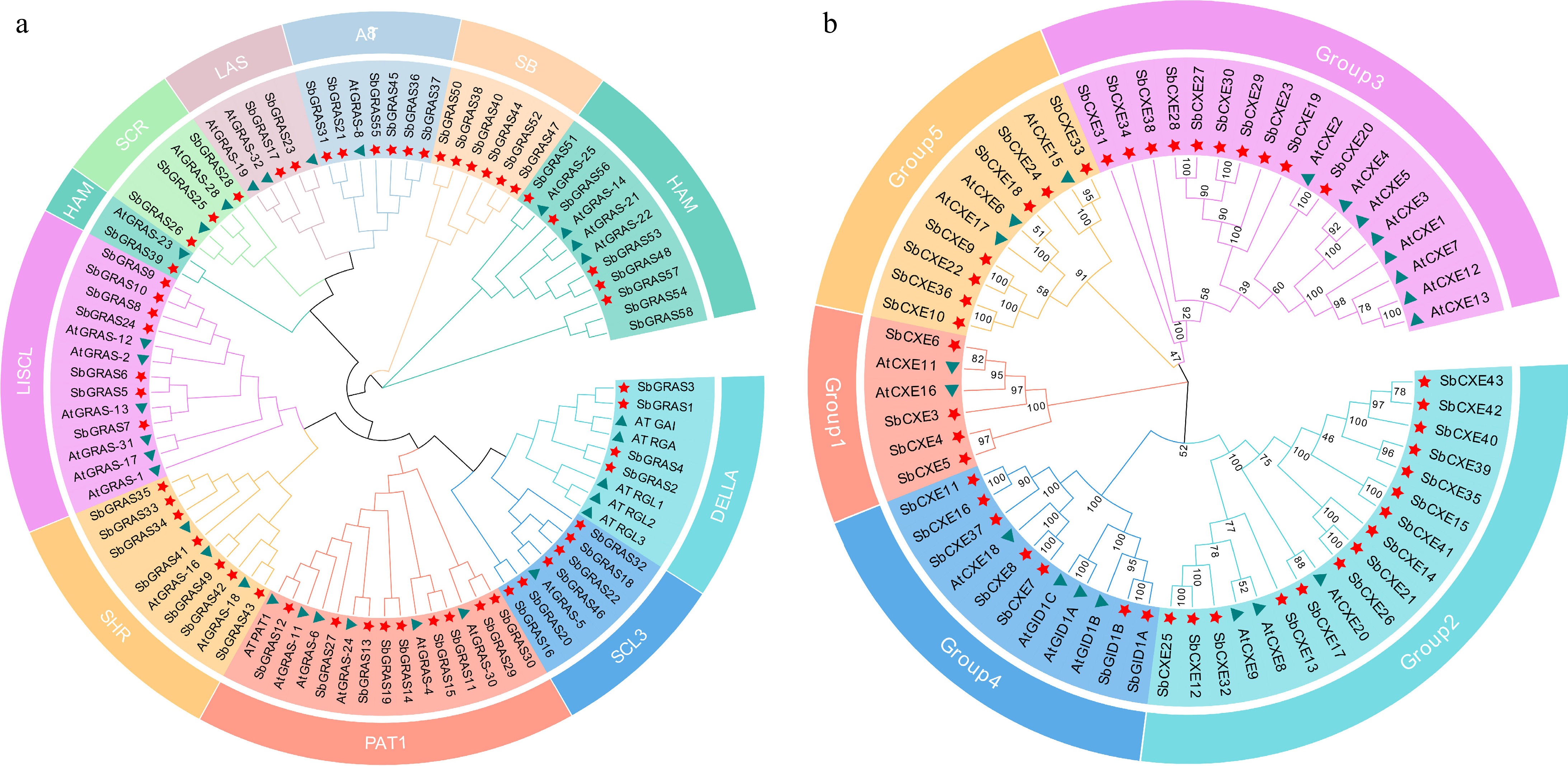 • To investigate the evolutionary relationships of the GRAS and CXE gene families, the protein sequences of the A. thaliana GRAS and CXE families were identified and the cluster analysis was performed using MEGA X to classify SbGRAS into ten subfamilies (DELLA, SCL3, PAT1, SHR, LISCL, HAM, SCR, LAS, AT8, and SB) with reference to the classification method of AtGRAS. The PAT1 family had the highest number of members, with nine, whereas the LAS family had the fewest, with only three. Phylogenetic tree and conserved domain analyses revealed that SbGRAS1 (SbDELLA1), SbGRAS2 (SbDELLA2), SbGRAS3 (SbDELLA3), SbGRAS4 (SbDELLA4) belong to the DELLA subfamily (Fig. 2a). The CXE members were divided into five groups (Group1-5), where SbGID1A, SbGID1B, and AtGID1A, AtGID1B belong to the same evolutionary branch. The sequence agreement of the six genes was 89.22% (Fig. 2b).