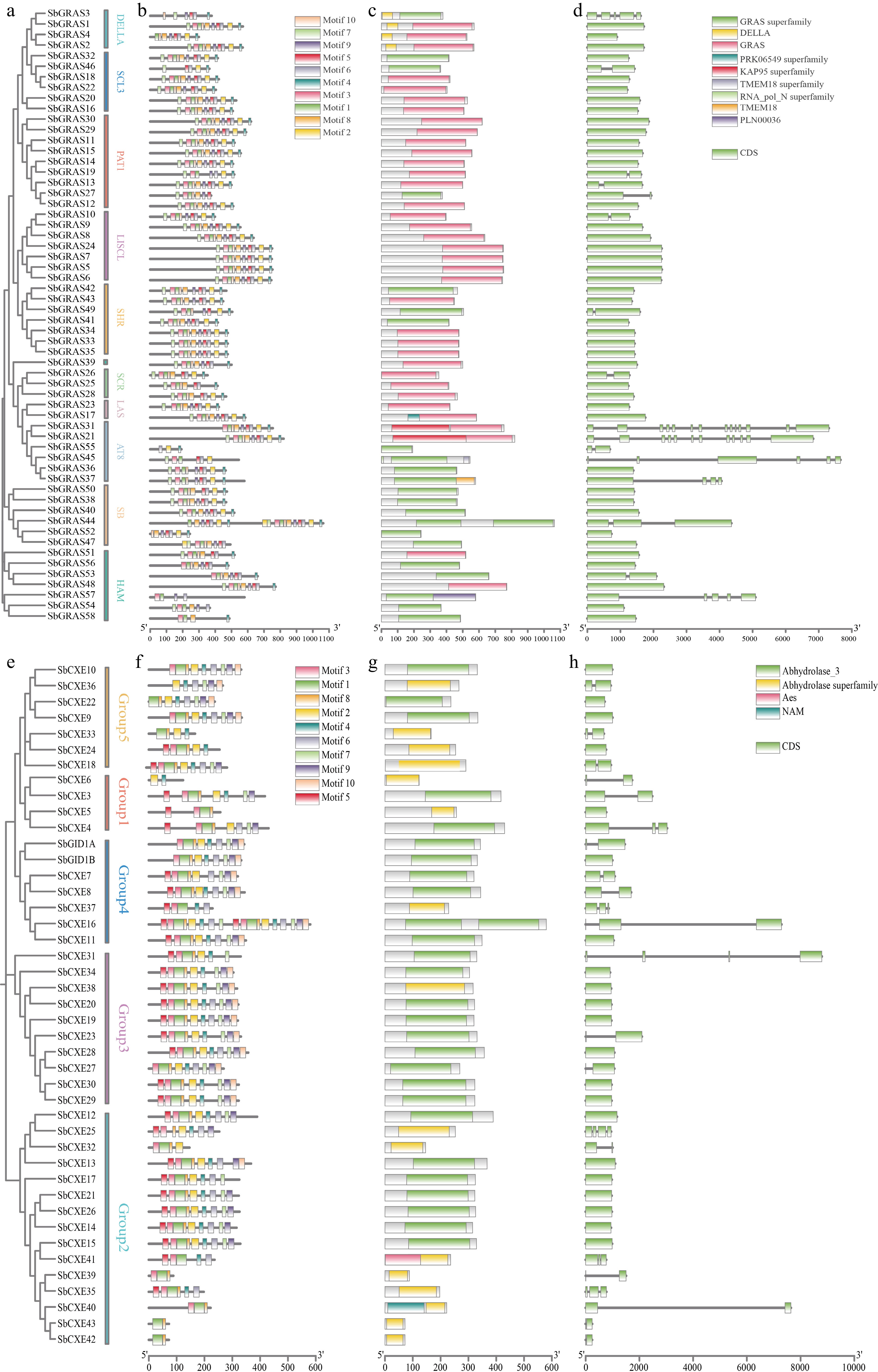 Phylogeny, gene motifs, domains, and structural analyses of the S. baicalensis GRAS and CXE families. (a) Phylogenetic tree and grouping of the S. baicalensis GRAS family. (b) Gene motifs of GRAS in S. baicalensis. (c) GRAS family domains of S. baicalensis. (d) Gene structures of GRAS family in S. baicalensis. (e) Phylogenetic tree and grouping of the S. baicalensis CXE family. (f) Gene motifs of CXE in S. baicalensis. (g) CXE family domains of S. baicalensis. (h) Gene structures of CXE family in S. baicalensis.