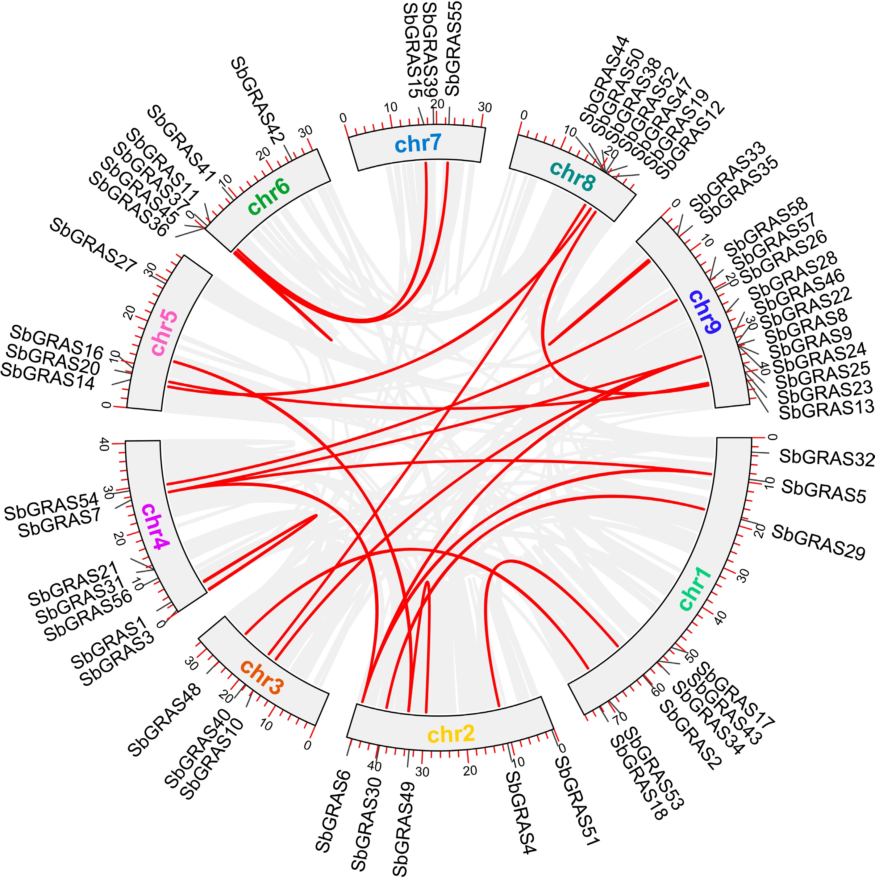 SbGRAS chromosomal duplication analysis. Red lines represent SbGRAS gene pairs.