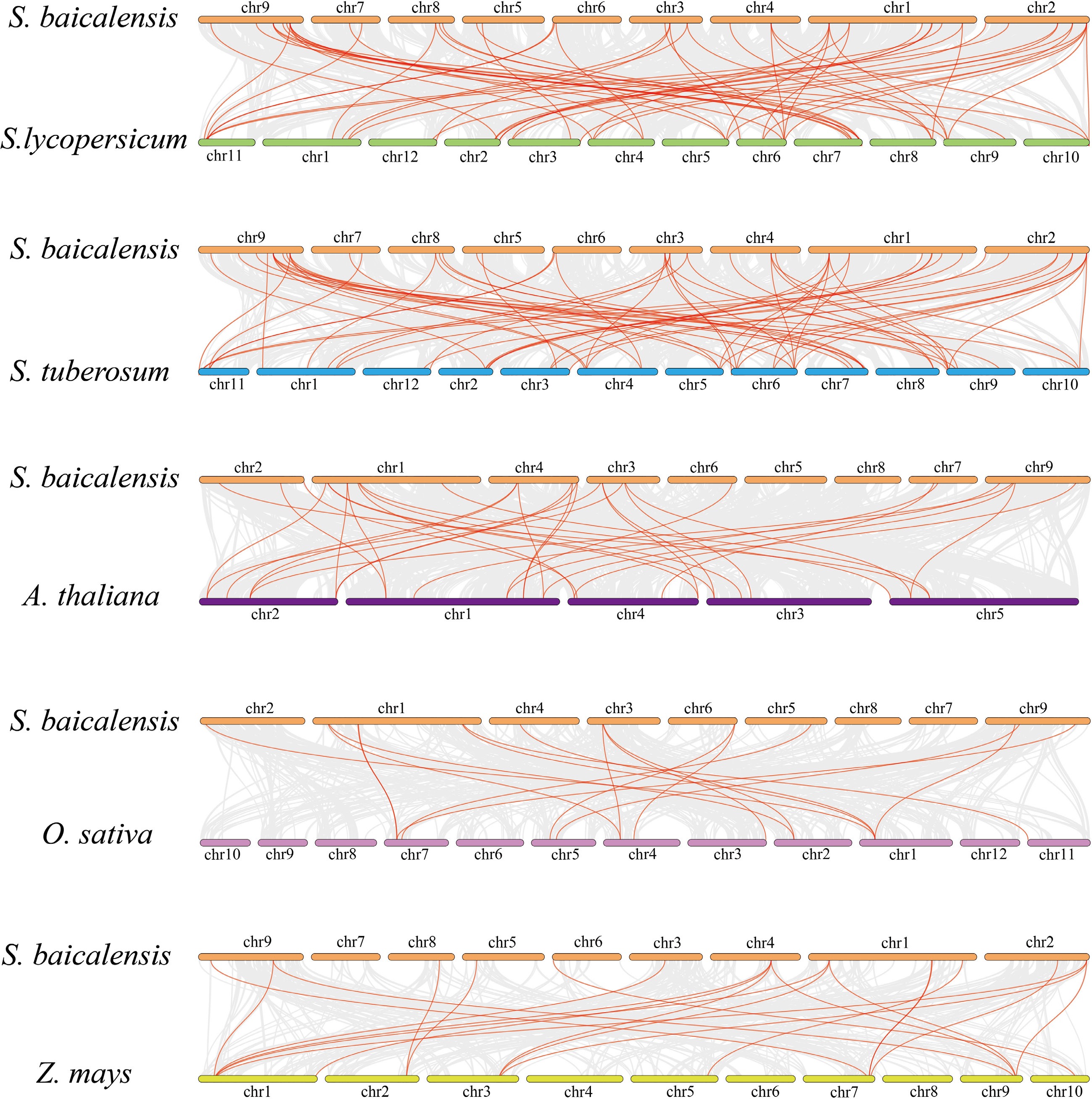 Homology analysis of S. bacalensis and the remaining four plants. Gray lines indicate the homology genes of S. bacalensis and other species, and red lines indicate the GRAS of S. baicalensis and other species.