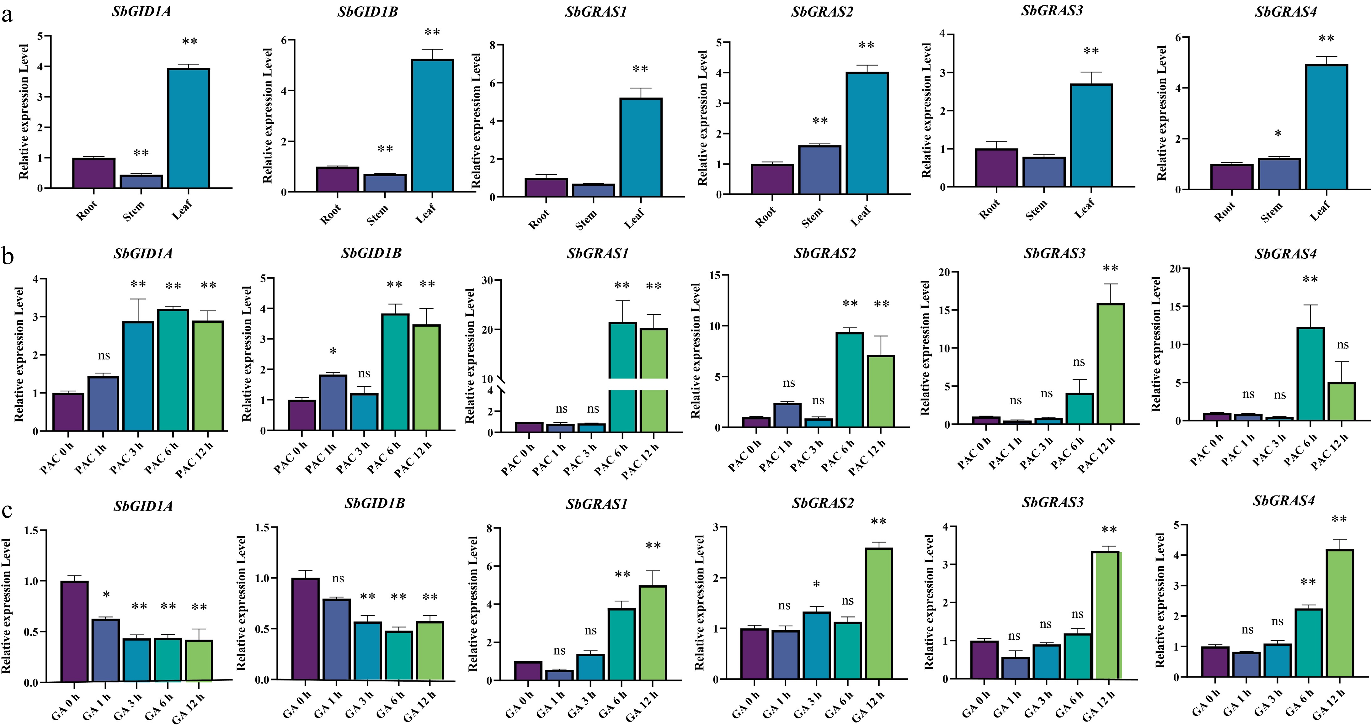 • The RNA was initially extracted from three S. baicalensis tissues: roots, stems, and leaves, and used RT-qPCR to investigate the expression patterns of SbGRAS and SbGID1 in different tissues (Fig. 6a). It was found that both SbGRAS and SbGID1 were highly expressed in the leaves.