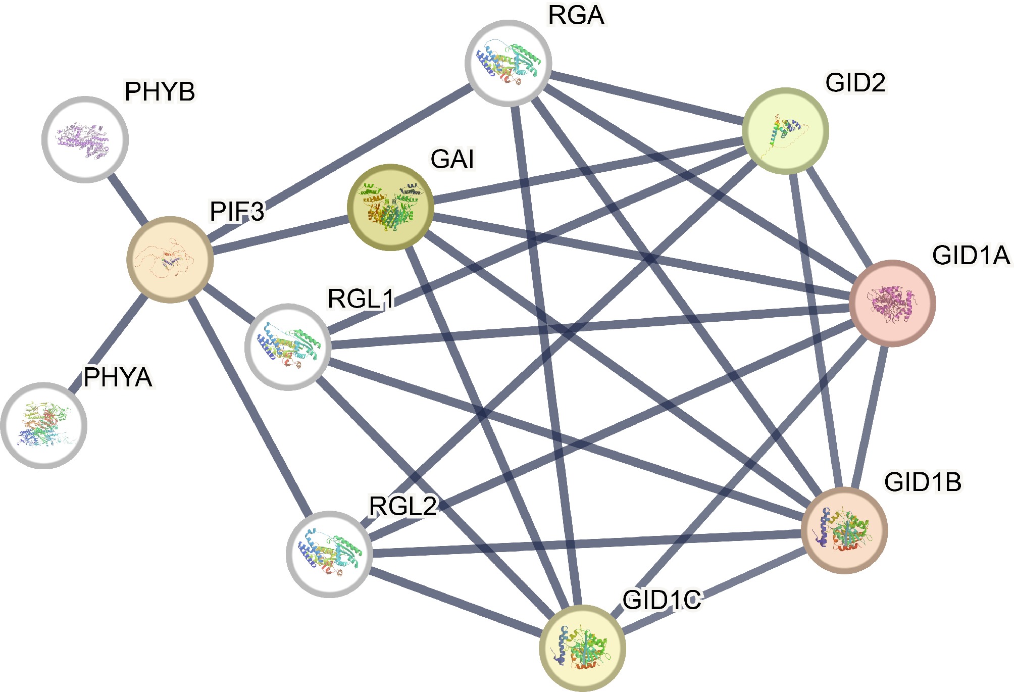 • The homologous genes of S. baicalensis and A. thaliana was obtained using the orthovenn2 online website, and then constructed the protein interaction network of GRAS using the STRING protein interaction online website. In A. thaliana, four GIDs (GID1A, GID1B, GID1C, and GID2) and four DELLAs (RGA/GAI/RGL1/RGL2) had complex interactions with each other, specially GIDs only had effects with DELLAs and other GIDs. DELLAs, in addition to interacting with GIDs, also interact with other transcription factors to perform broader functions, the result revealed that DELLAs and GID1s proteins had complex interactions (Fig. 7).