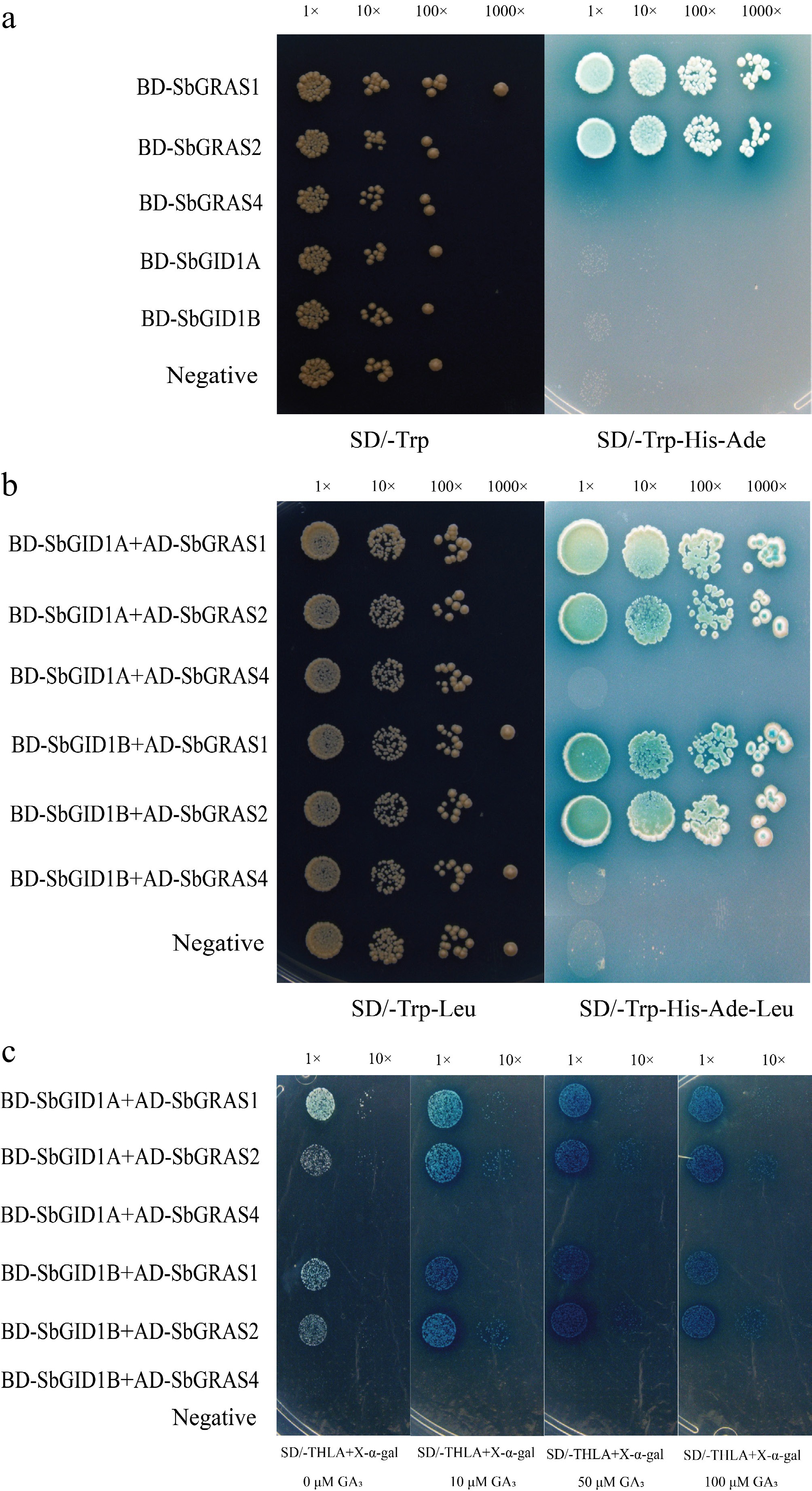Self-activating SbGRASs were incorporated into the pGADT7 vectors, and the BD-SbGID1s and AD-SbGRASs plasmids were transformed into yeast AH109 competent cells in equal amounts. The interactions between SbGRASs and SbGID1s were detected by SD/-Trp-His-Leu-Ade containing X-α-gal, after SD/-Trp-Leu growth. GA3 was added to the SD/-Trp-His-Leu-Ade medium at final concentrations of 10, 50, and 100 μM, respectively.