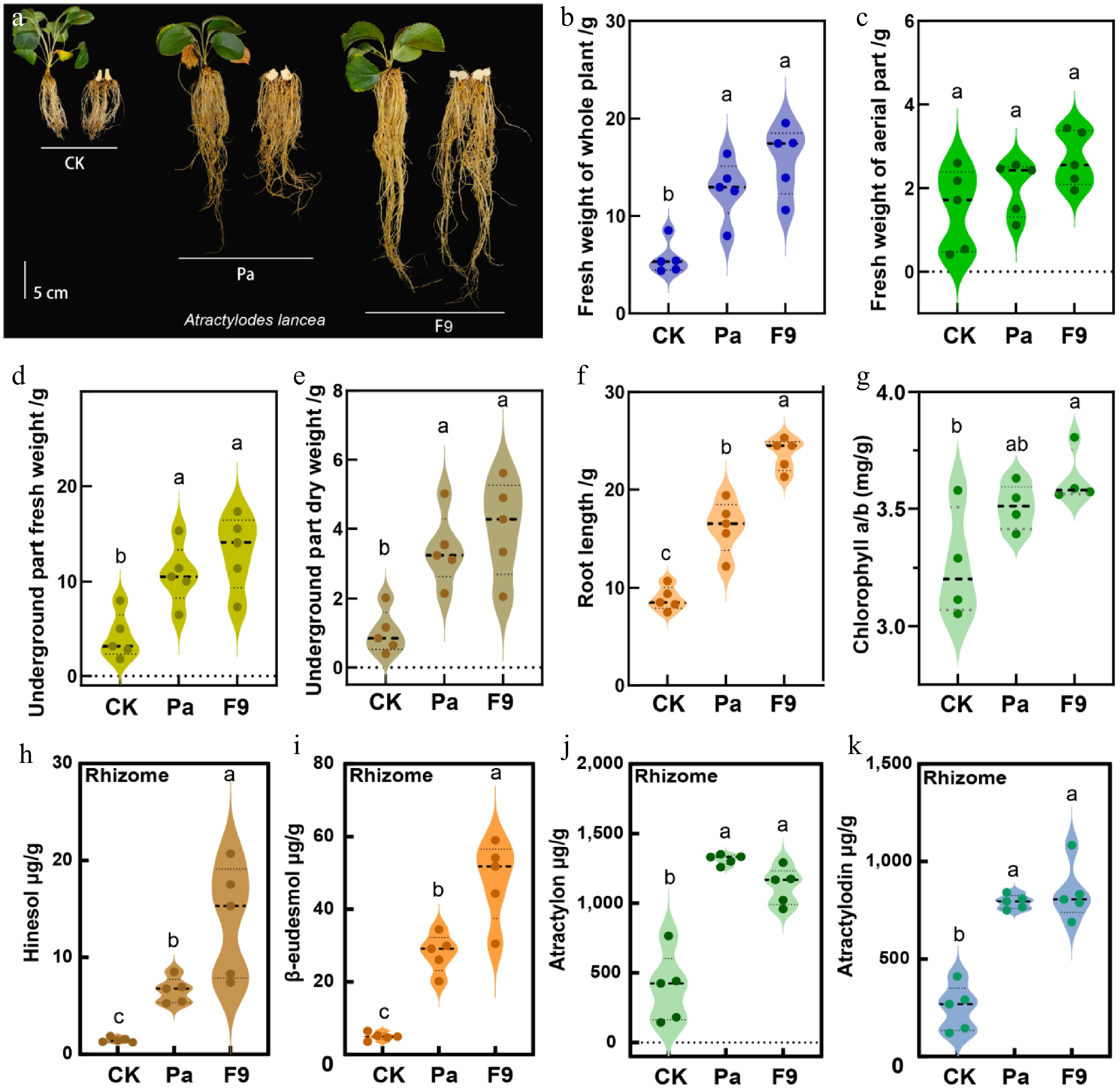The effect of inoculation with F9 and Pa on traits of A. lancea. The changes in (a) morphology and (b) fresh weight of the whole plant, (c) aerial part fresh weight, (d) underground part fresh weight, (e) underground part dry weight, (f) root length, (g) chlorophyll a/b ratio. The concentration of four medical compounds in A. lancea rhizomes, including (h) hinesol, (i) β-eudesmol, (j) atractylon, and (k) atractylodin, caused by F9 and Pa inoculation are shown. Different lowercase letters indicate significant differences (one-way ANOVA, p < 0.05, n = 5).