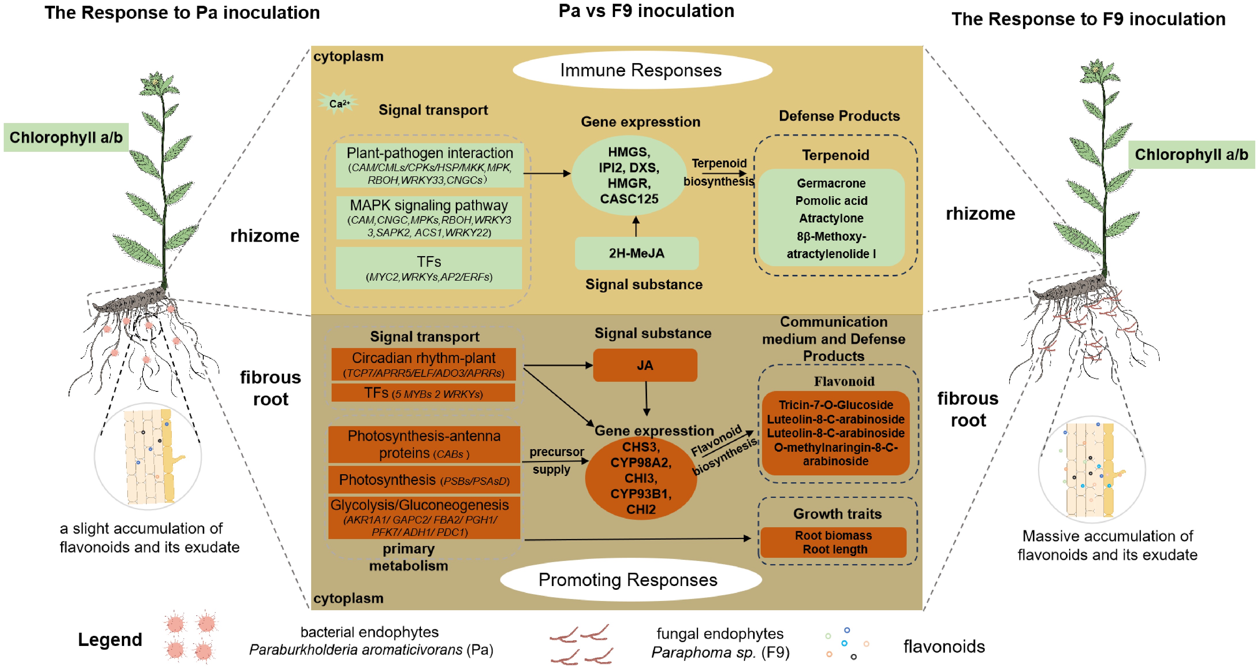 Simplified schematic summary of the differential mechanisms promoting host growth and metabolism in A. lancea at the transcriptional level in response to the endophytic fungus Paraphoma sp. (F9) and the endophytic bacterium Paraburkholderia aromaticivorans (Pa). The white oval box represents the primary transcriptional responses, including immune and growth-promoting responses, following endophyte inoculation. The mint green box highlights a significant increase in immune response and terpenoid production in A. lancea rhizomes after inoculation with F9 or Pa, compared to the control (F9-free and Pa-free inoculation). However, the magnitude of the immune response is similar between the F9 and Pa treatments. The brownish-red box indicates that F9 inoculation leads to stronger signal transduction, primary metabolism, gene expression, flavonoid accumulation, and overall growth compared to Pa inoculation. The black solid arrow represents promotion. TFs: transcription factors, JA: jasmonic acid, 2H_MeJA: methyl dihydrojasmonate.