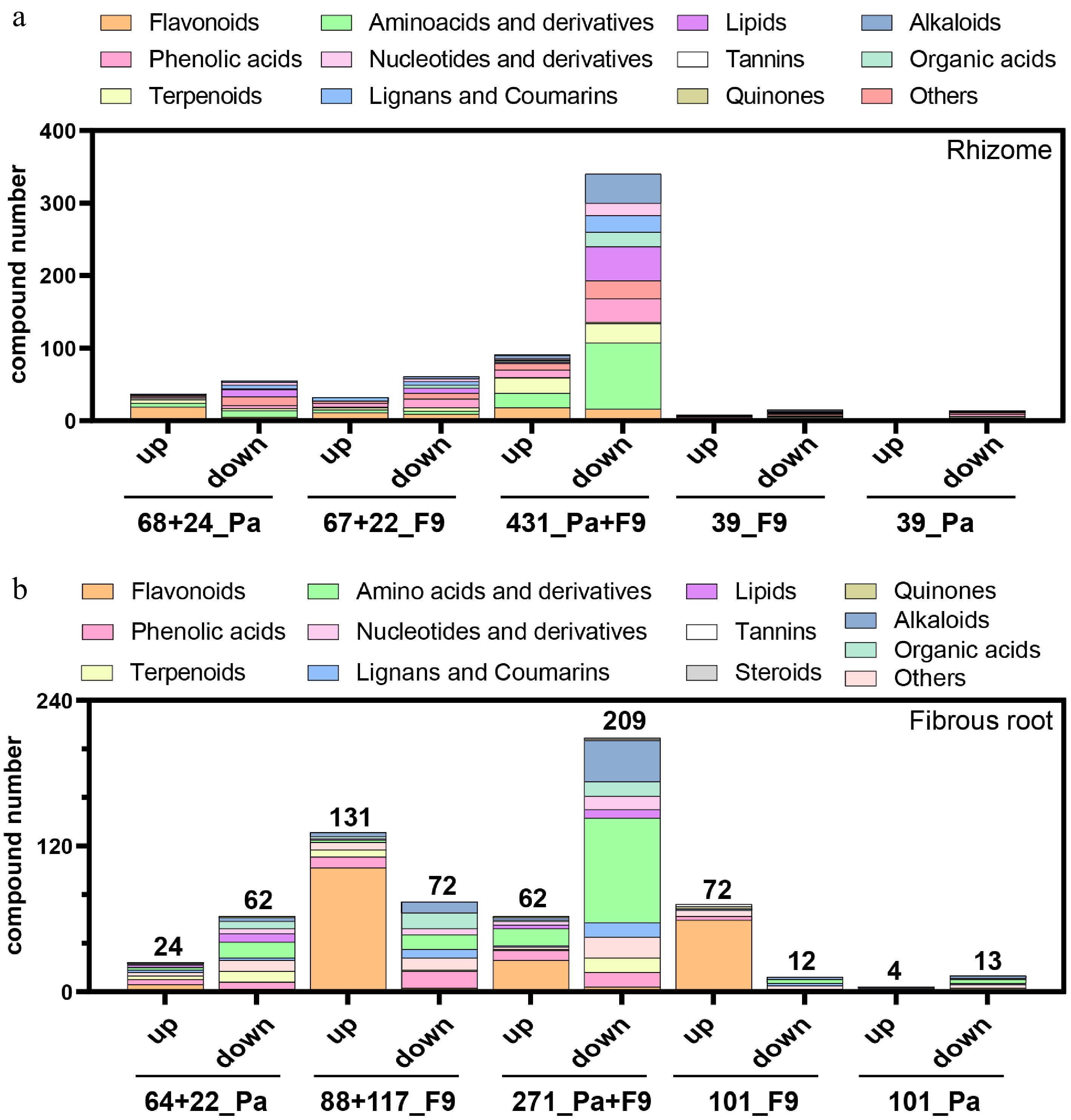 The distribution of differentially accumulated metabolites (DAMs) in A. lancea (a) rhizomes, or (b) fibrous roots, caused by inoculation with F9 and Pa. (a) 68+24_Pa: the distribution of 92 (68+24) DAMs specifically associated with Pa treatment. 67+24_F9: the distribution of 91 (67+24) DAMs specifically associated with F9 treatment. 431_Pa+F9: the distribution of 431 common DAMs that were influenced by F9 treatment and Pa treatment compared to the control (CK). 39_F9 and 39_Pa: the distribution of 39 DAMs specifically caused by F9 or Pa inoculation, which obtained by pairwise comparison (F9r vs CKr, Par vs CKr, and Par vs F9r). The above numbers for (a) refer to Supplementary Fig. S4. (b) The meaning represented by the horizontal axis from left to right is the same as that in (a) except that the samples in (b) comes from A. lancea fibrous roots instead of the rhizomes. The above numbers for (b) refer to Supplementary Fig. S5. 'r', rhizome; 'fr', fibrous root; 'up', metabolite contents increased by F9 treatment or Pa treatment compared to the control; 'down', metabolite contents reduced by F9 treatment or Pa treatment compared to the control.
