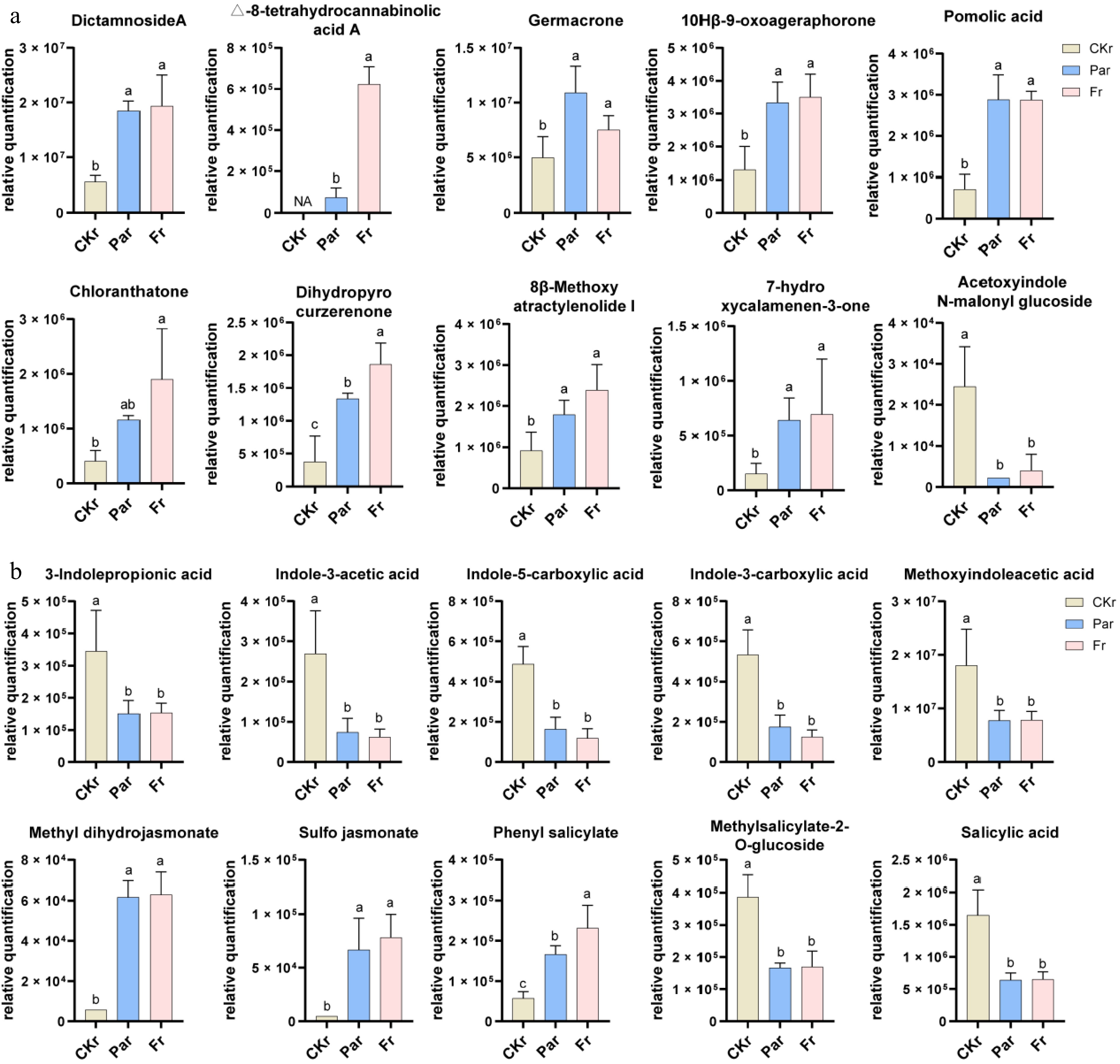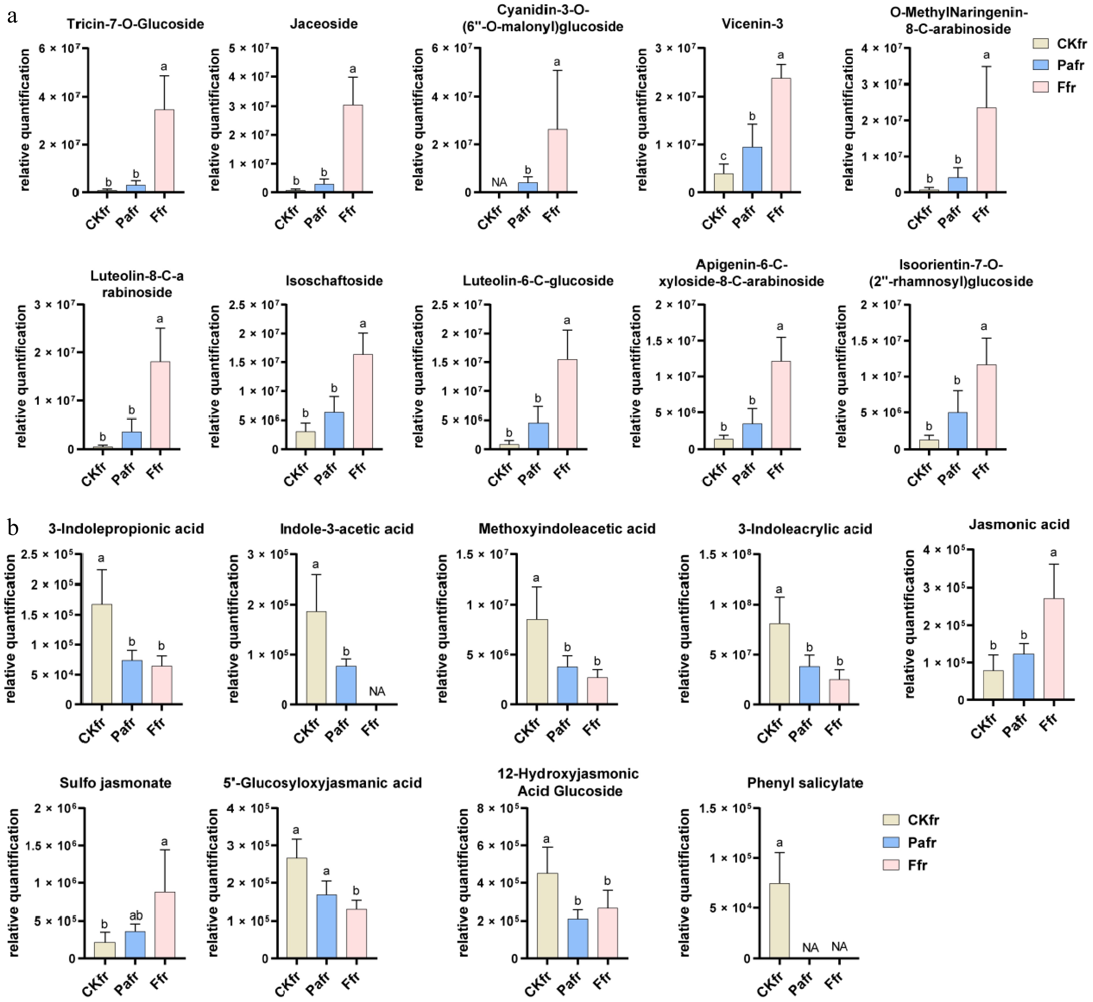 Among flavonoids, the top 10 compounds ranked by peak area were more influenced by F9 than Pa across CKfr, F9fr, and Pafr groups (Fig. 4a). Additionally, the peak areas of nine hormones were analyzed, revealing that jasmonic acid and sulfo jasmonate displayed similar trends to 11 flavonoids (Fig. 4a and b).