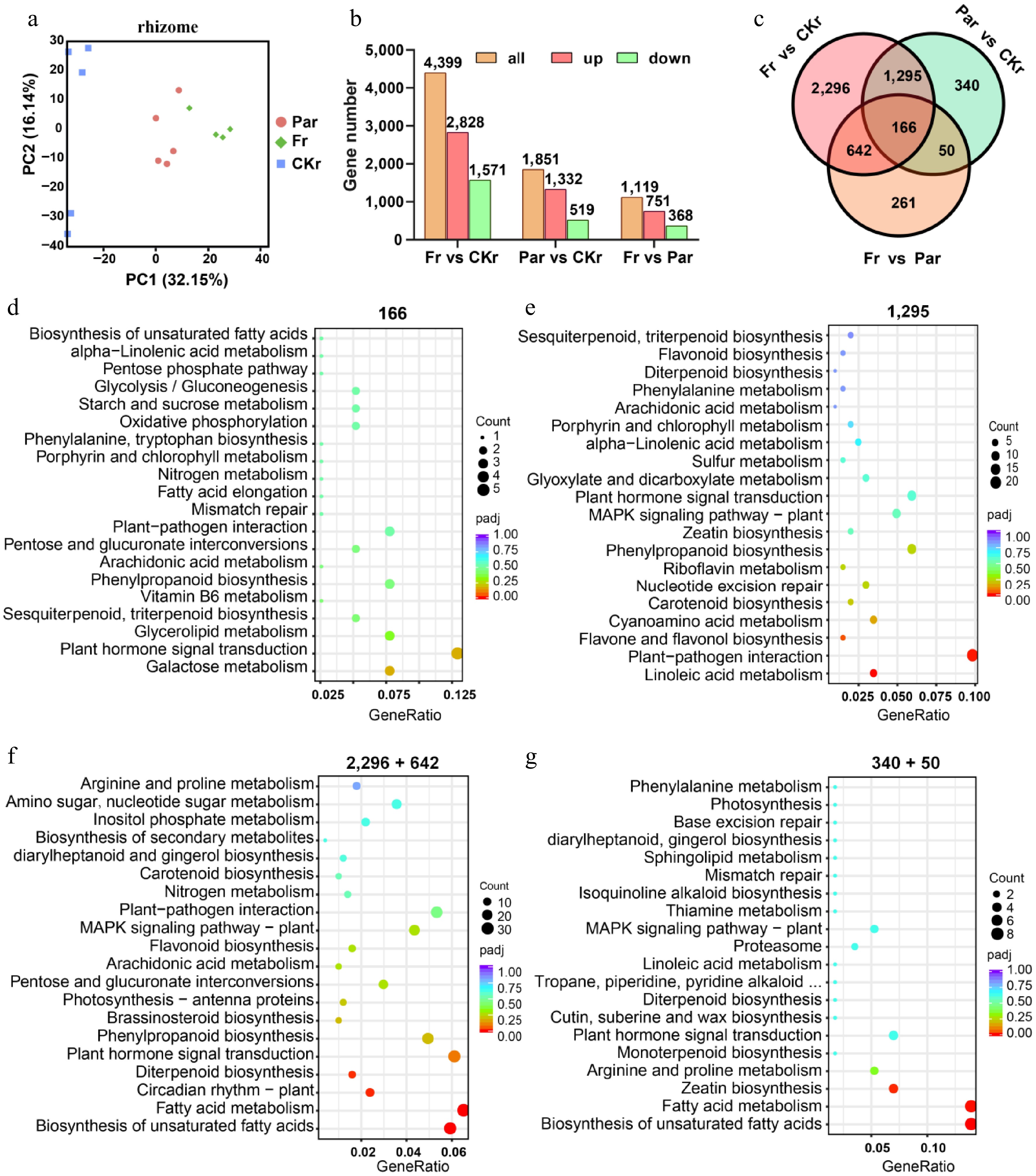 Differentially expressed genes (DEGs) and Kyoto Encyclopedia of Genes and Genomes (KEGG) pathway enrichment analysis of transcriptional levels in A. lancea rhizome following F9 and Pa inoculation. (a) Principal component analysis (PCA) based on transcriptional data from samples treated with F9 inoculation (Fr), Pa inoculation (Par), or without inoculation (CKr). (b) Statistical analysis of DEGs (p < 0.05, |Log2Foldchange| > 1) comparing Fr vs CKr, Par vs CKr, and Fr vs Par, revealing a total of 5,050 DEGs. (c) Venn diagram classifying DEGs into seven groups based on their expression levels across the three treatment conditions. (d)–(g) KEGG pathway enrichment analysis was performed on six of the seven categories, including 1,295, 166, 2,296 and 642, 340 and 50. The 1,295 genes showed similar expression levels between the F9 and Pa inoculation groups; 166 genes exhibit significant differences in expression between these two groups; 2,296 and 642 genes are specifically affected by F9 but not by Pa inoculation; 340 and 50 genes are specifically affected by Pa but not by F9 inoculation.