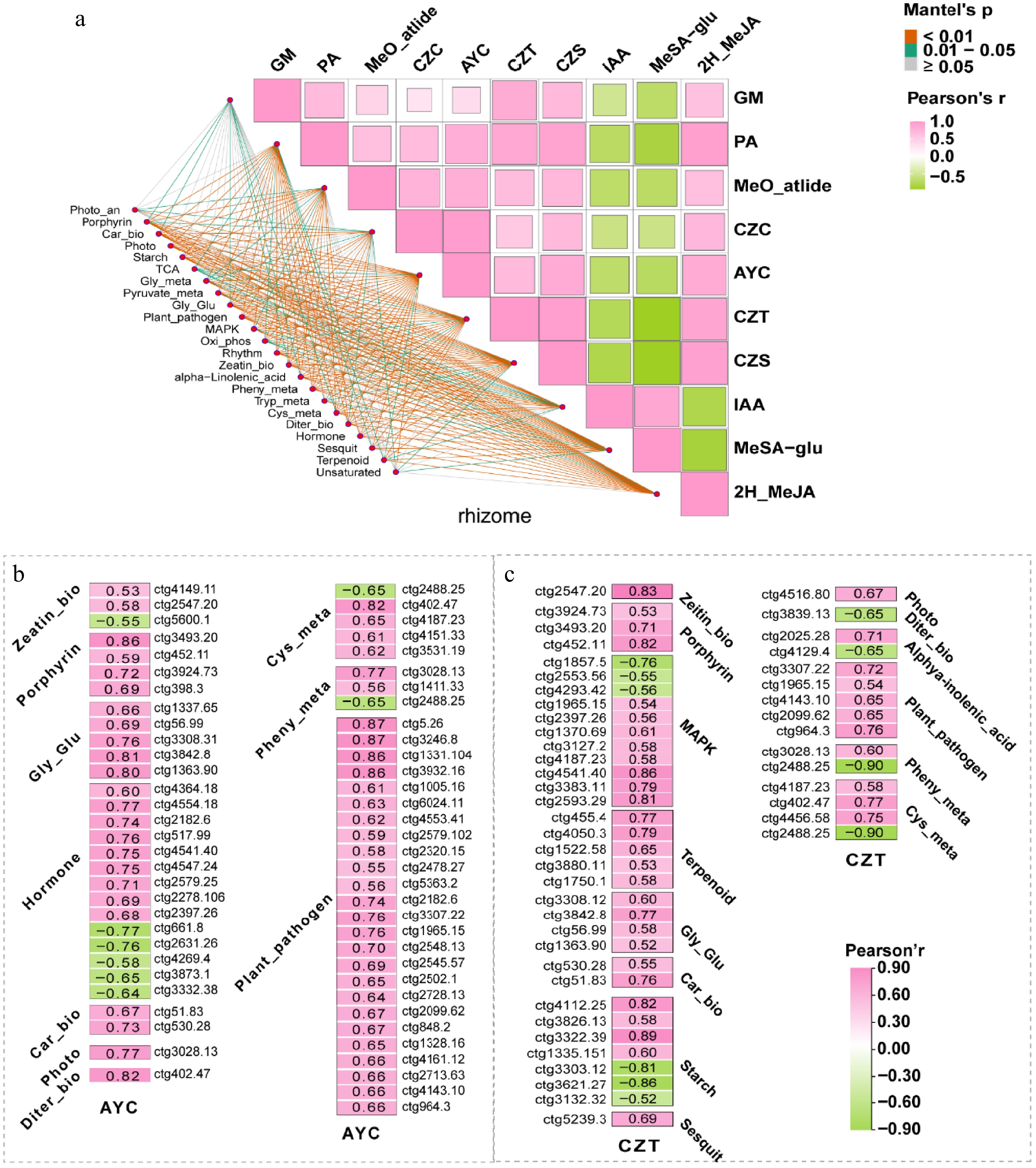 (a) Matrix correlation analysis between traits, including metabolites and growth phenotypes, in response to F9 and Pa inoculation, and the KEGG enrichment pathway in A. lancea rhiozme. (b) Pearson correlation analysis was also performed between two medicinal terpenoids (AYC and CZT) and the genes within the screened KEGG enrichment pathway in the rhizome of A. lancea. Abbreviation: GM: Germacrone; PA: Pomolic acid; CZC: Hinesol; AYC: β-eudesmol; CZT: Atractylon; CZS: Atractylodin; IAA: Indole-3-acetic acid; MeSA-glu: Methylsalicylate-2-O-glucoside; 2H_MeJA: Methyl dihydrojasmonate. Zeatin_bio: Zeatin biosynthesis, Porphyrin: Porphyrin and chlorophyll metabolism, Gly_Glu: Glycolysis/Gluconeogenesis, Hormone: Plant hormone signal transduction, Car_bio: Carotenoids biosynthesis, Photo: Photosynthesis, Diter_bio: Diterpenoid biosynthesis, Cys_meta: Cysteine and methionine metabolism, Plant-pathogen: Plant-pathogen interaction, MAPK: MAPK signaling pathway, Terpenoid: Terpenoid backbone biosynthesis, Pheny_bio: Phenylpropanoid biosynthesis, Starch: Starch and sucrose metabolism, Sesquit: Sesquiterpenoid and triterpenoid biosynthesis, Alpha-Linolenic_acid: alpha-Linolenic acid metabolism.