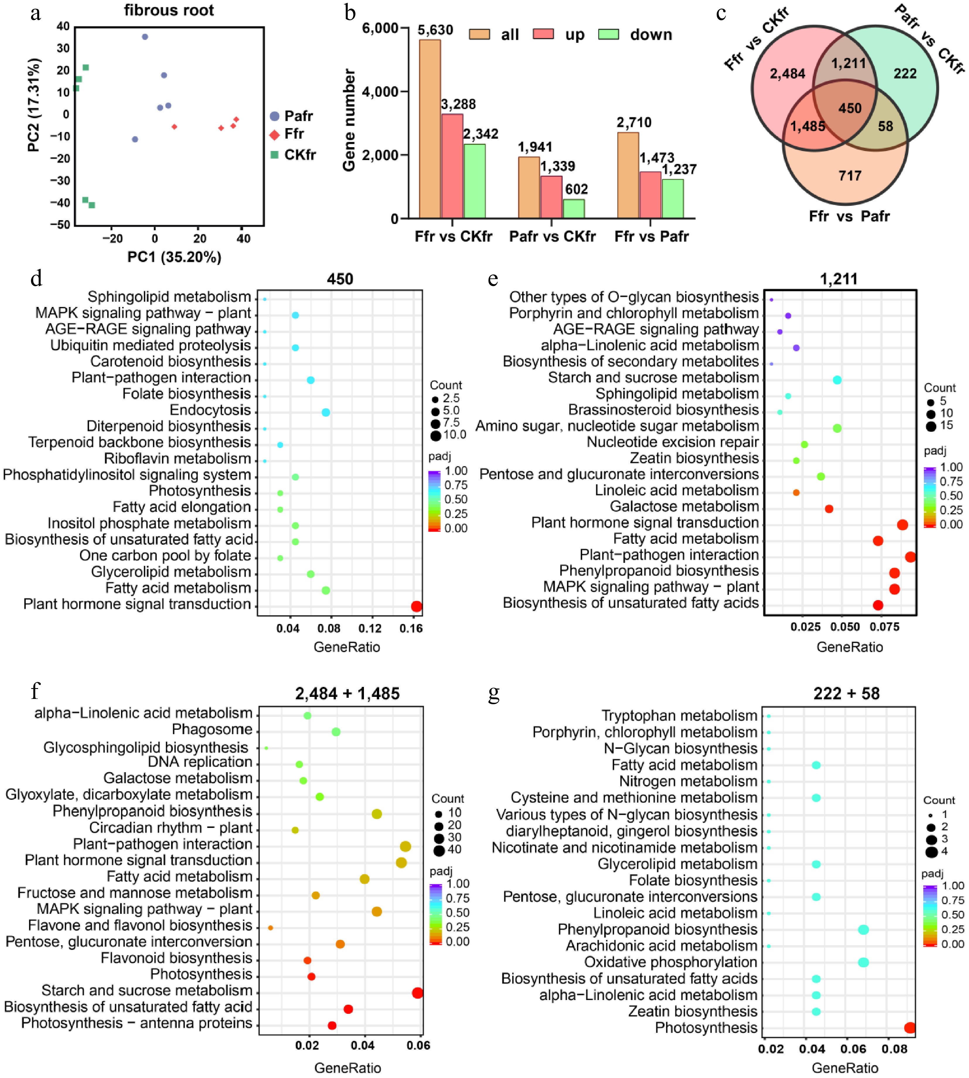 Differentially expressed genes (DEGs) and enrichment analysis of Kyoto Encyclopedia of Genes and Genomes (KEGG) pathways in A. lancea fibrous roots affected by F9 and Pa inoculation. (a) Principal component analysis (PCA) of transcriptional data from samples treated with F9 inoculation (Ffr), Pa inoculation (Pafr), and without inoculation (CKfr). (b) Statistical analysis of DEGs (p < 0.05, |Log2Foldchange| > 1) from comparisons of Fr vs CKfr, Pafr vs CKfr, and Ffr vs Pafr, identifying a total of 6,627 DEGs. (c) Venn diagram classifying DEGs into seven groups based on their expression patterns across the three treatments. (d)–(g) Kyoto Encyclopedia of Genes and Genomes (KEGG) pathway enrichment analysis was performed on six of the seven categories, representing 1,211, 450, 2,484 and 1,485, 222, and 58 DEGs. The 1,211 DEGs show similar expression levels between the F9 and Pa inoculation groups; 450 DEGs show significant differences between these groups; 2,484 and 1,485 DEGs are specifically affected by F9 but not by Pa inoculation; 222 and 58 DEGs are specifically affected by Pa but not by F9 inoculation.