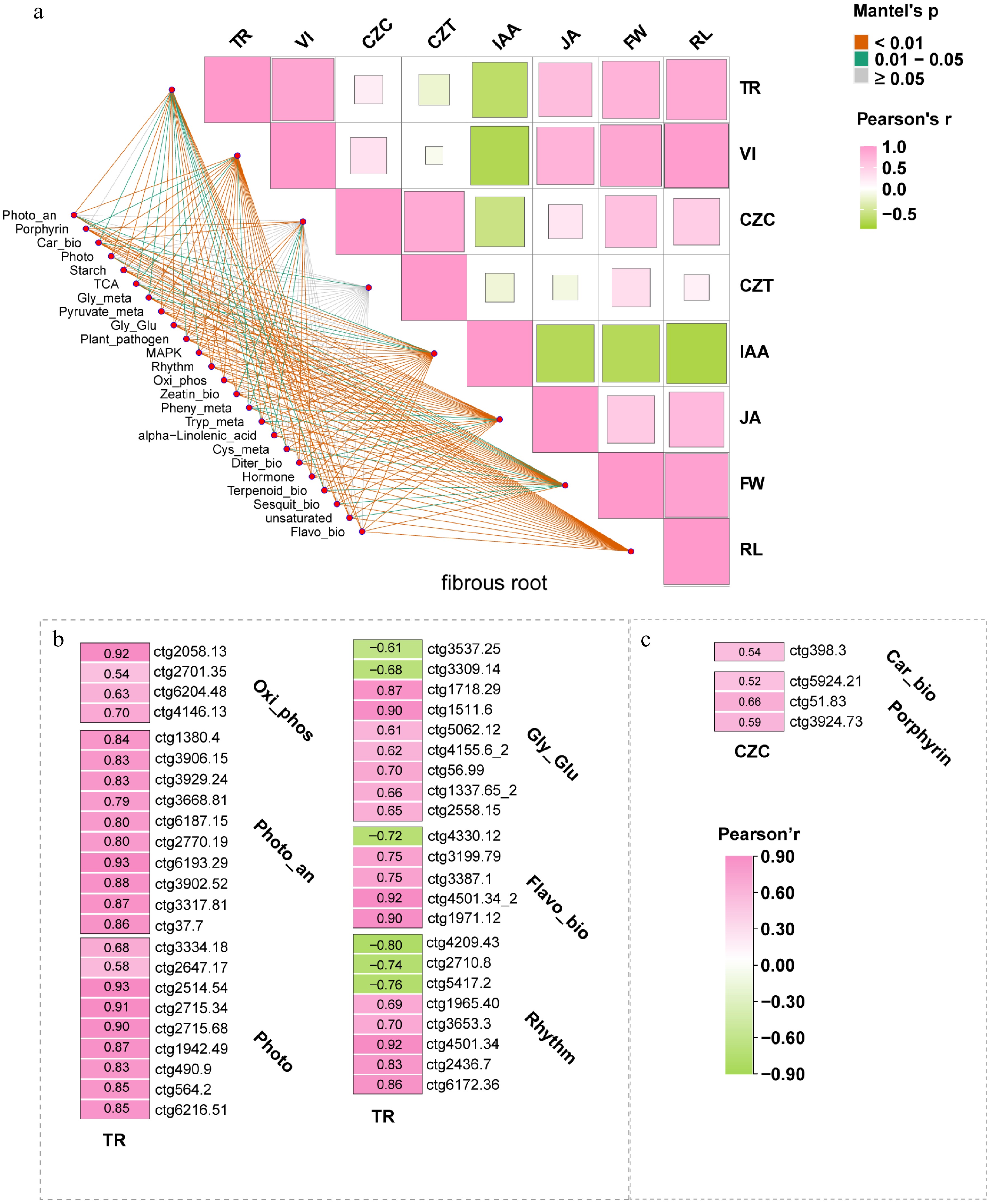 (a) Matrix correlation analysis between traits, including metabolites and growth phenotypes, in response to F9 and Pa inoculation, and the KEGG enrichment pathway in A. lancea fibrous roots. (b) Pearson correlation analysis was also performed between two key metabolites (TR and CZC) and the genes within the screened KEGG enrichment pathway in the fibrous roots of A. lancea. Abbreviation: TR: Tricin-7-O-Glucoside; VI: Vicenin-3; CZC: Hinesol; CZT: Atractylon; IAA: Indole-3-acetic acid; JA: Jasmonic acid; FW: fresh weight of the whole plant; RL: root lengths; Oxi_phos: Oxidative phosphorylation; Photo-an: Photosynthesis-antenna proteins; Photo: Photosynthesis; Gly_Glu: Glycolysis/Gluconeogenesis; Flavo_bio: Flavonoid biosynthesis; Rhythm: Circadian rhythm-plant; Car_bio: Carotenoids biosynthesis; Porphyrin: Porphyrin and chlorophyll metabolism.