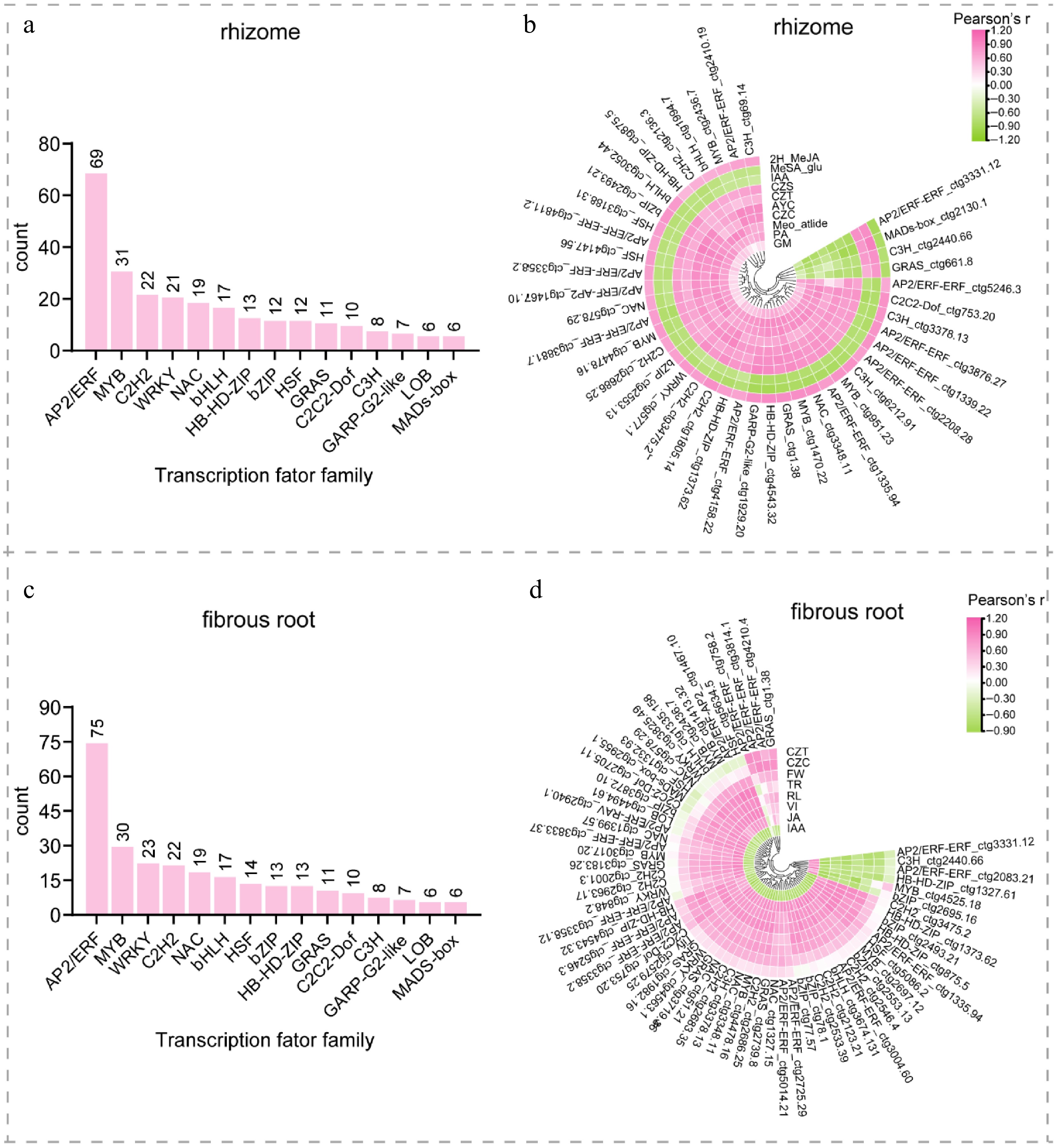Similarly, from the fibrous root's 6,628 DEGs, 432 transcription factors from 36 transcription factor families were identified. From the top 15 transcription factor families, 338 genes were selected for further analysis (Fig. 9c). A correlation analysis was conducted between these genes and six components: CZT, CZC, FW, TR, RL, VI, JA, and IAA. Genes with a correlation coefficient |r| ≥ 0.8 and a p-value < 0.05 were considered significantly correlated, resulting in 65 transcription factor genes (Fig. 9d).