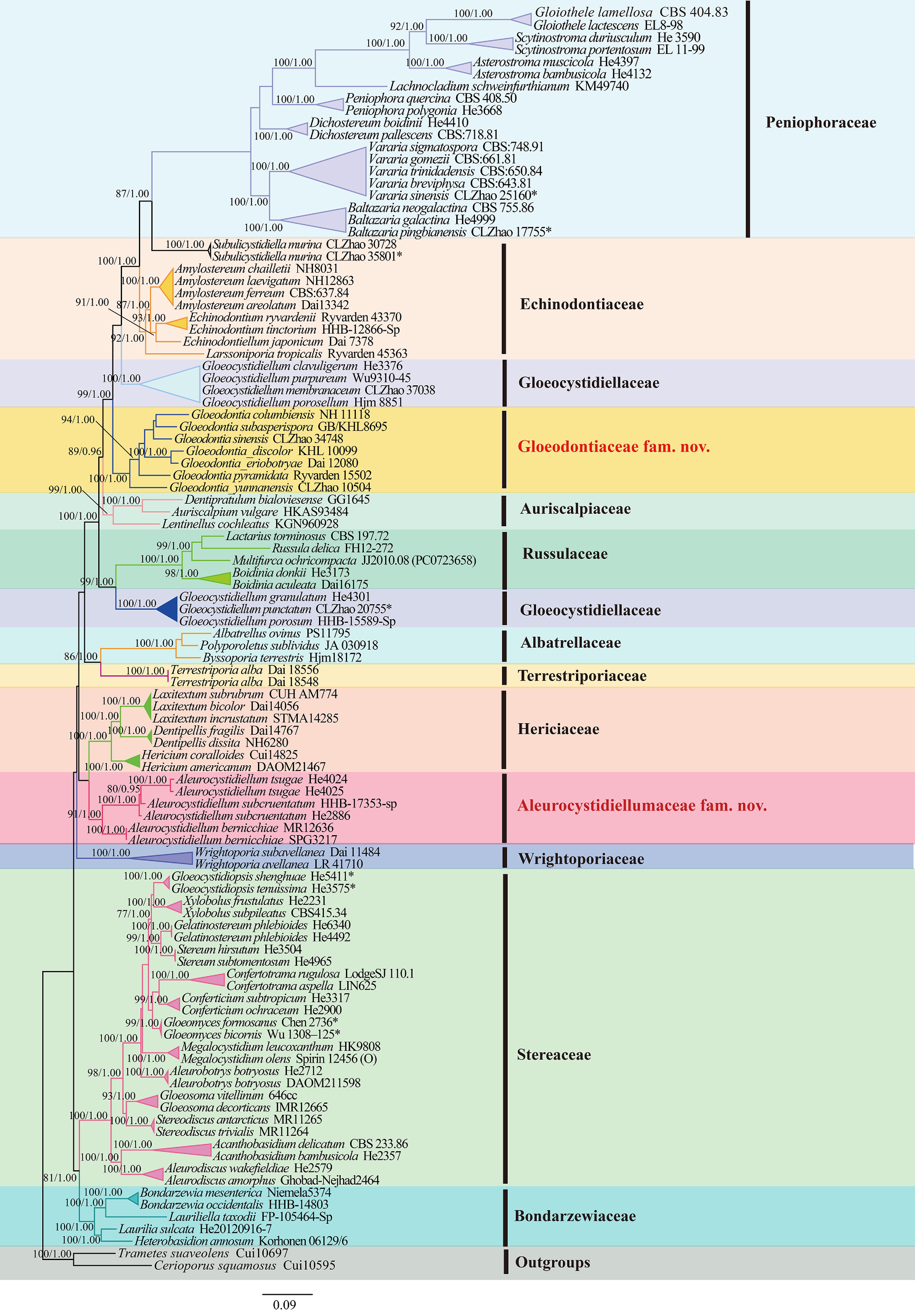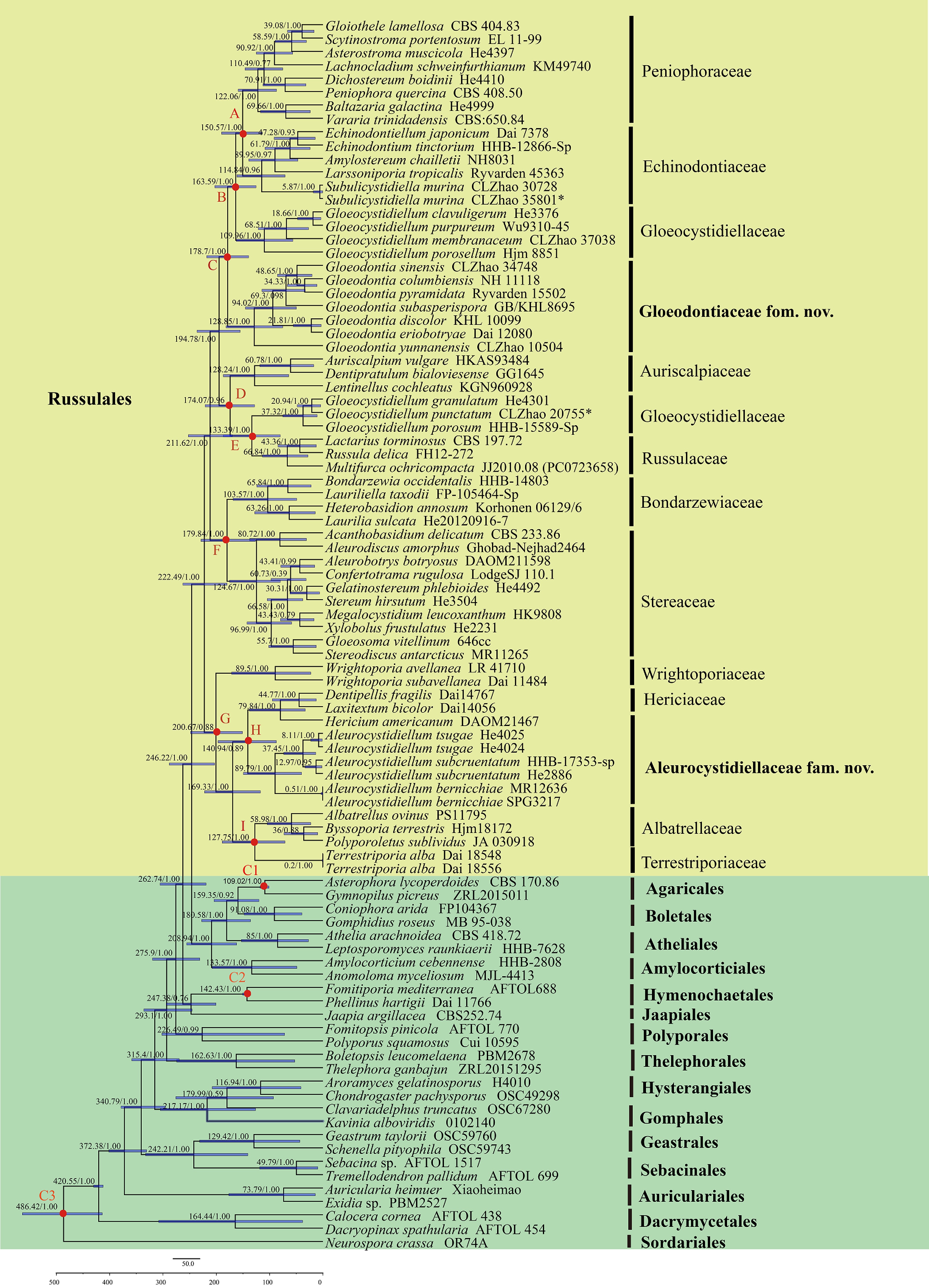 Fungi include model systems for cell and molecular biology and they represent one of the few clades that has evolved complex multicellularity, which they have done at least eight times during their billion-year history [ 277] . Fruiting bodies (sporocarps, sporophores or basidiomata) of Russulales are among the most complex structures produced by fungi and these sexual reproductive organs facilitate efficient spore dispersal. While in simple Basidiomycota have spores that are born on naked basidia, mushroom-forming fungi have evolved complex three-dimensional structures that offer tremendous advantages in effective spore dispersal [ 278] . Ancestral basidiomata of the Agaricomycotina were probably crust-like, ‘resupinate’ forms [ 279, 280] , which then evolved into increasingly more complex forms, including derived ‘pileate-stipitate’ types, which are differentiated into a cap, stipe, and hymenophore (spore-bearing surface) [ 280] . Extensive mycological studies have confirmed that the species of Russulales exhibit pileate, clavarioid, and gasteroid basidiomata [ 1] . The diversity of Russulaceae is extremely rich, including discoid, claviform, resupinate-effuse and gasteroid basidiomata, with smooth, pleated, poroid, and odontoid hyphal surface [ 17, 281] . The distribution of corticioid basidiomata in Russulales was early studied by Larsson [ 45] . According to He et al. [ 1] , the resupinate basidiomata are present in seven families Echinodontiaceae, Hericiaceae, Peniophoraceae, Russulaceae ( Boidinia and Gloeopeniophorella were separate from Gloeocystidiellum s.l.), Stereaceae and Terrestriporiaceae. Surprisingly, in the present summary, the resupinate basidiomata type of Russulales, are distributed in 13 branches (families), In addition to the above families, Albatrellaceae, Aleurocystidiellaceae fam. nov., Auriscalpiaceae, Bondarzewiaceae ( Laurilia and Lauriliella), Gloeocystidiellaceae, Gloeodontiaceae fam. nov., and Wrightoporiaceae are included. Meanwhile, In the present study, we propose a new genus and two new families, and we introduce 26 new species with resupinate basidiomata. These taxa belong to six families, Amylostereaceae, Gloeocystidiellaceae, Gloeodontiaceae, Hericiaceae, Peniophoraceae, and Stereaceae, based on morphology, molecular phylogenetic analyses, and divergence time estimates.