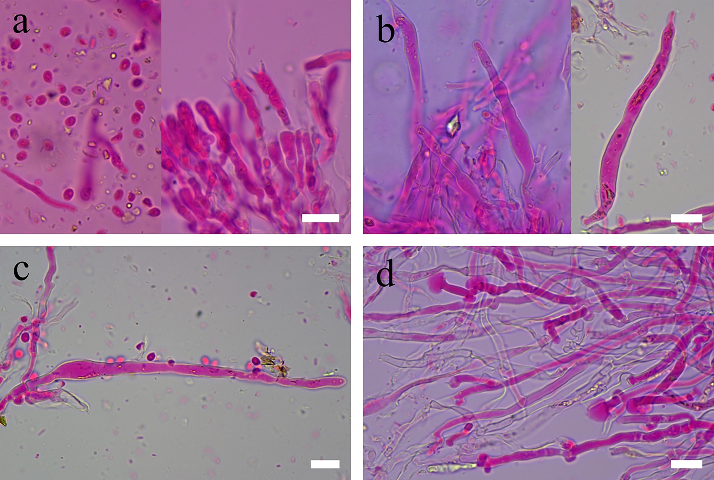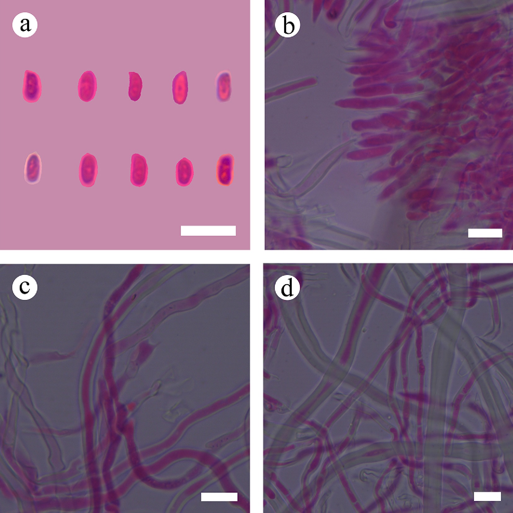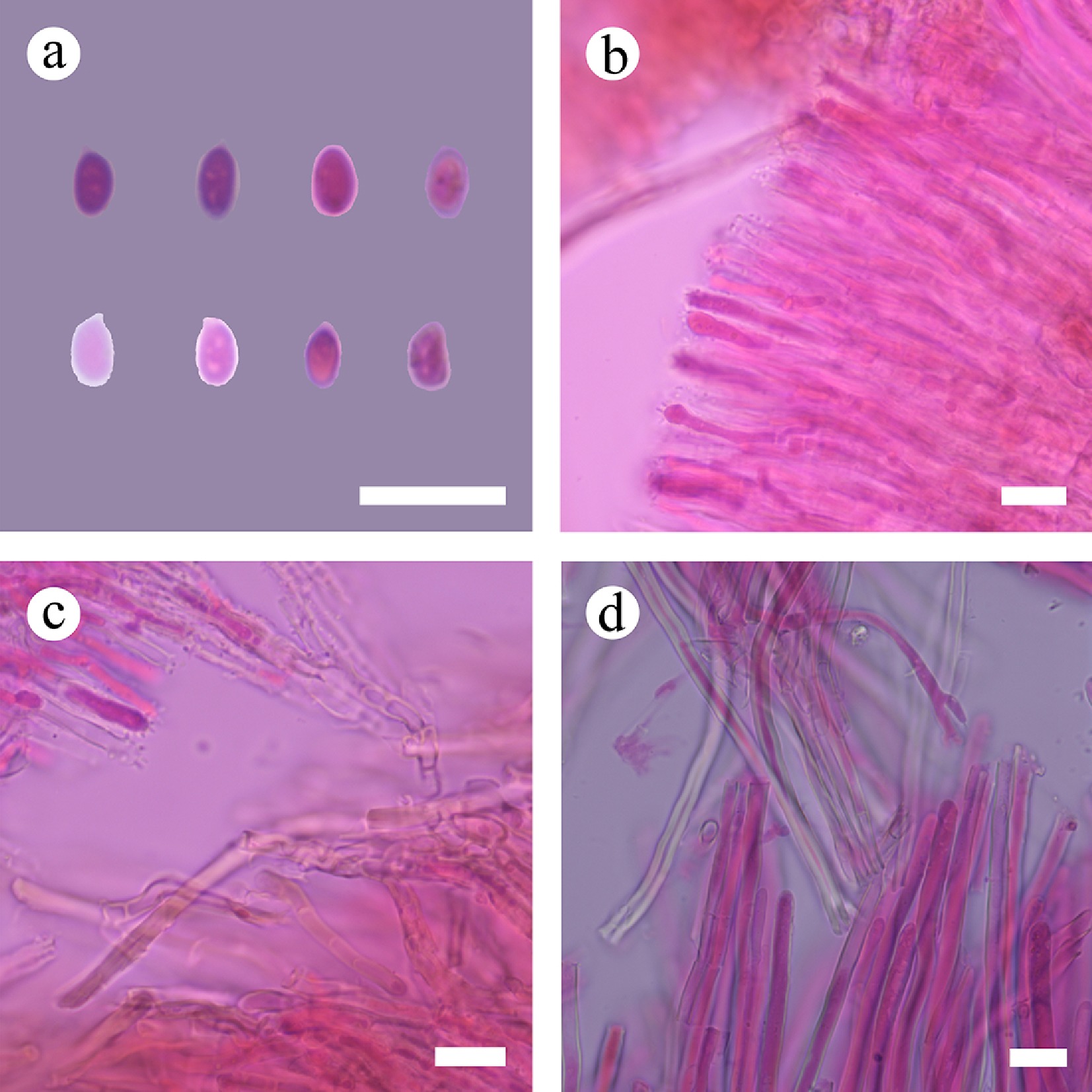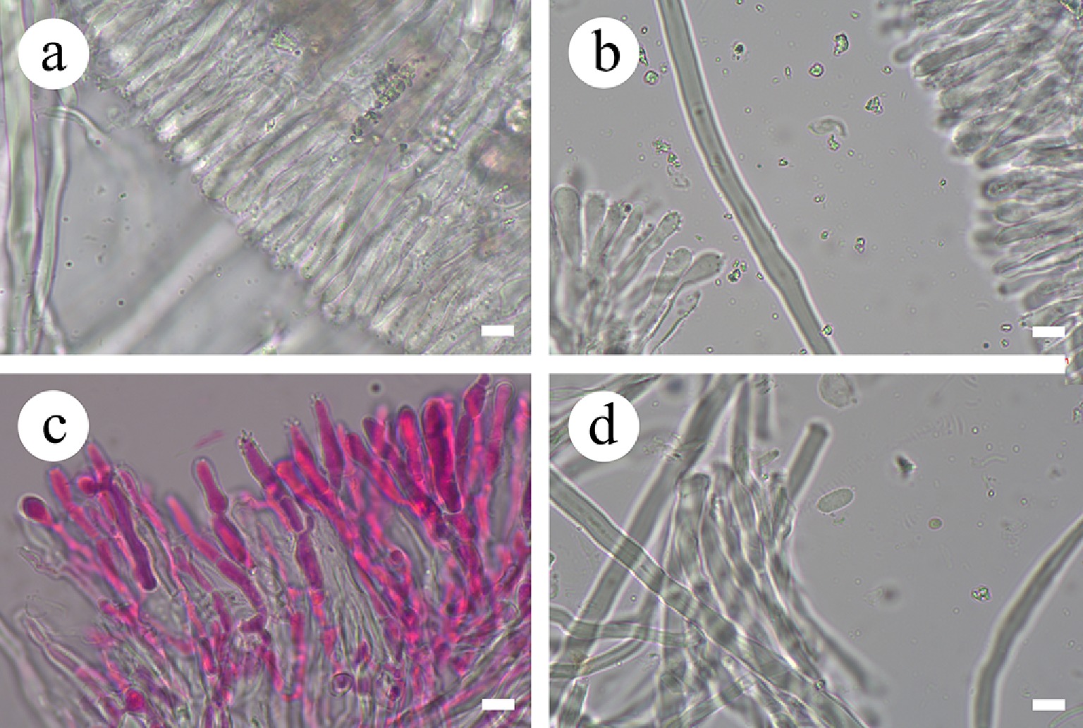 Sections of hymenium of Stereum convolutomarginatum (holotype). (a), (c) Section of hymenium. (b) Skeletal hyphae. (d) Basidiospores. Scale bars: (a)–(d) = 10 µm.