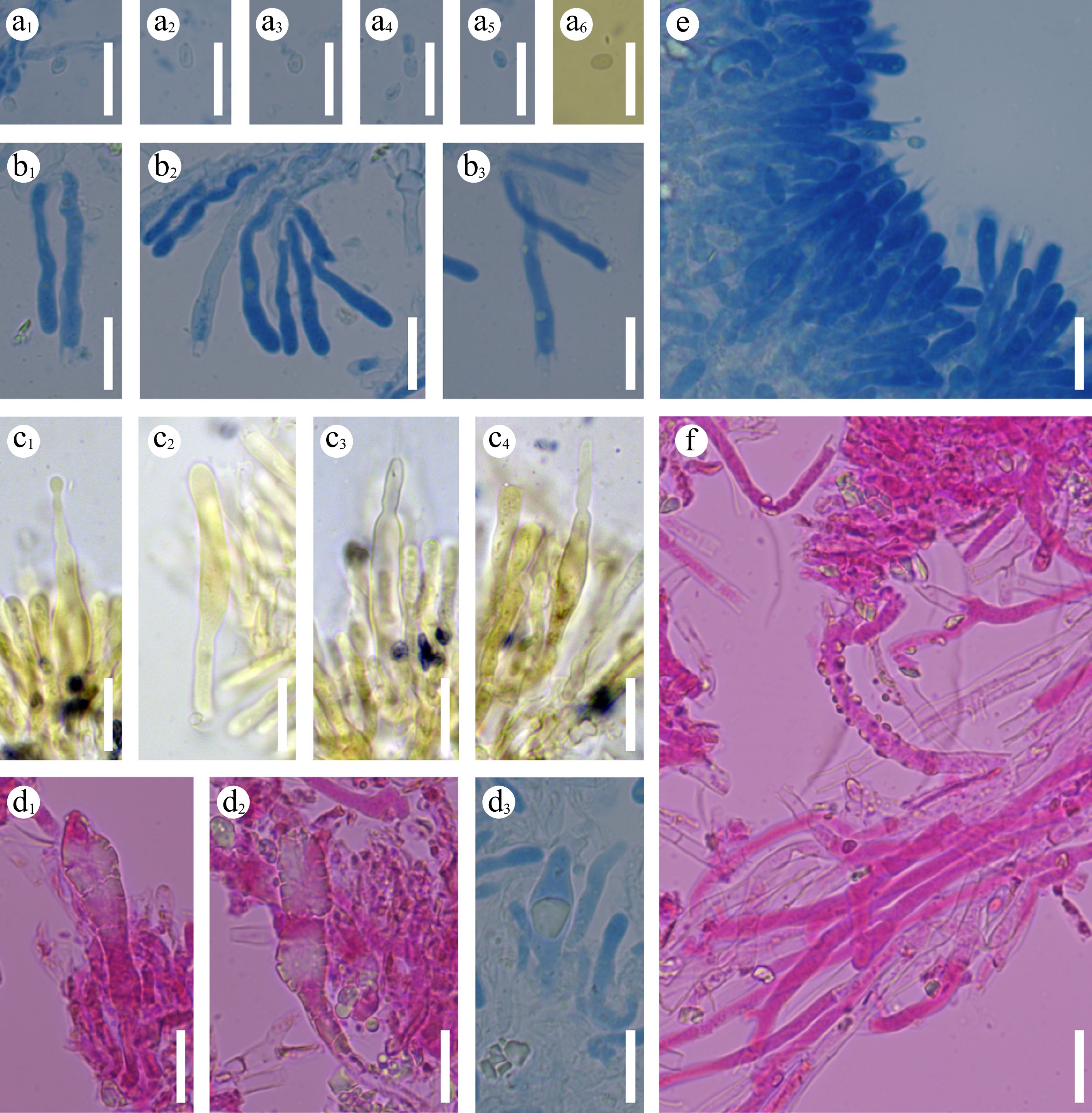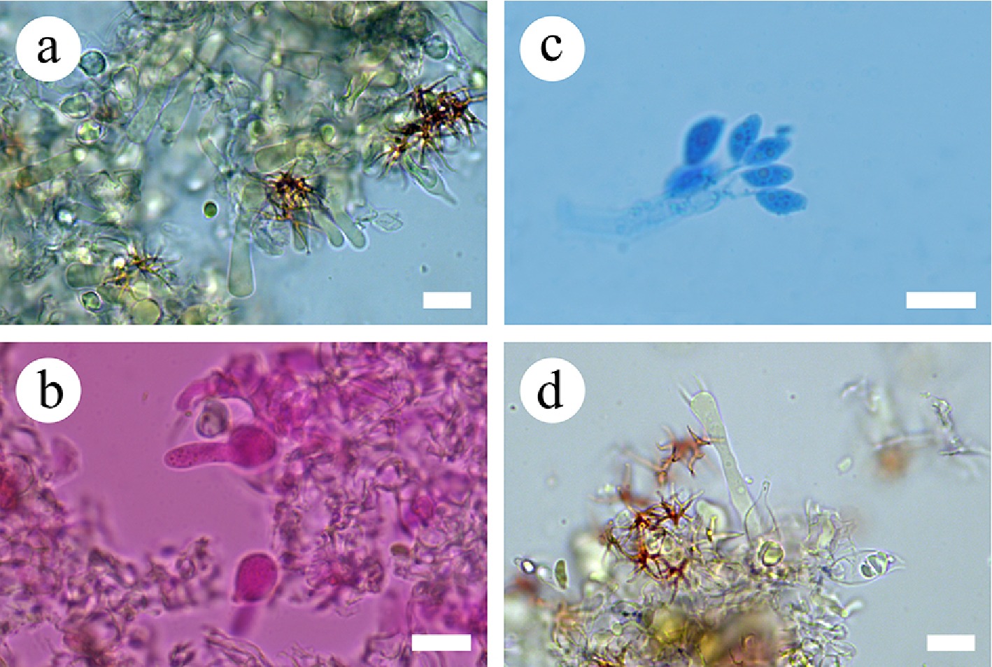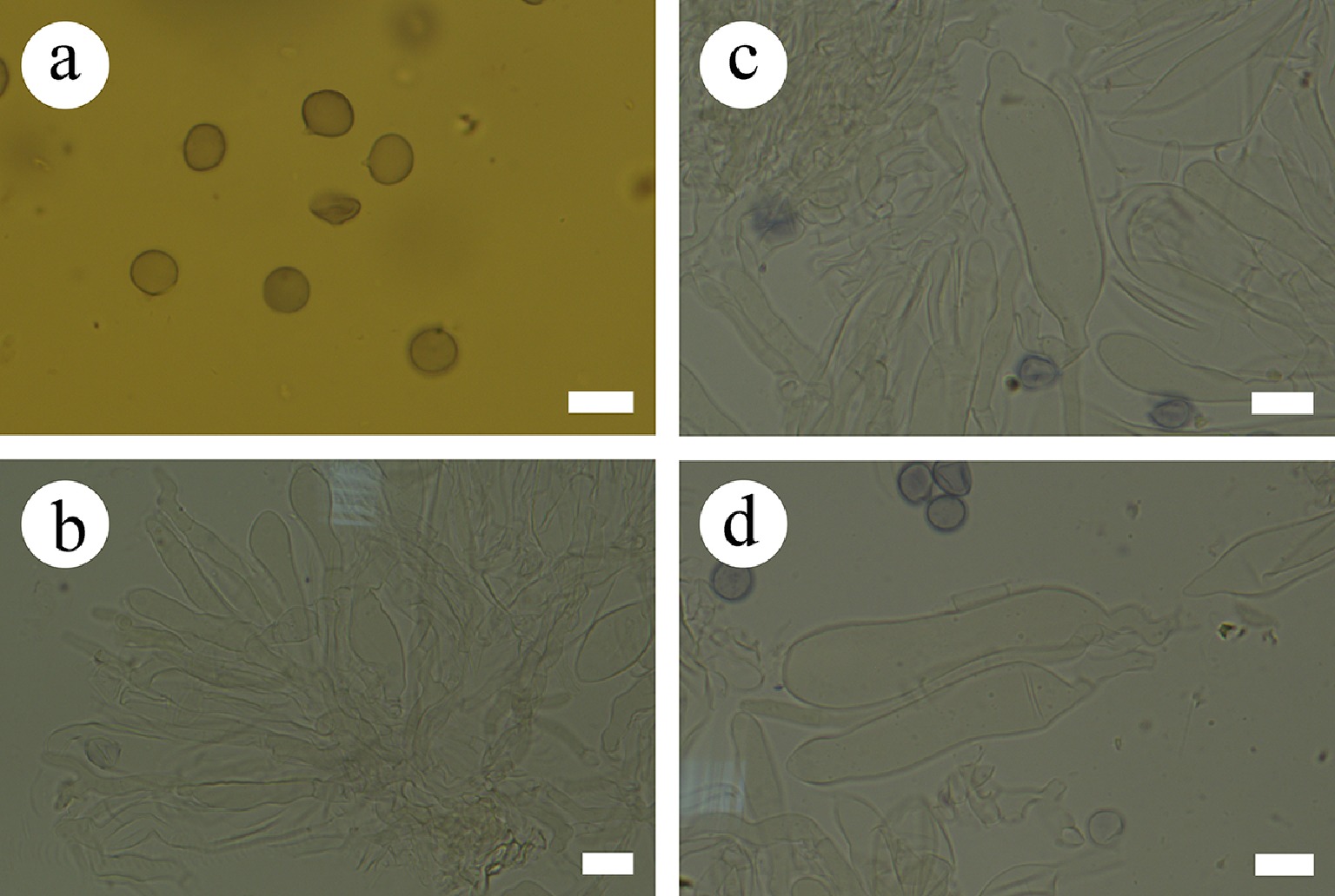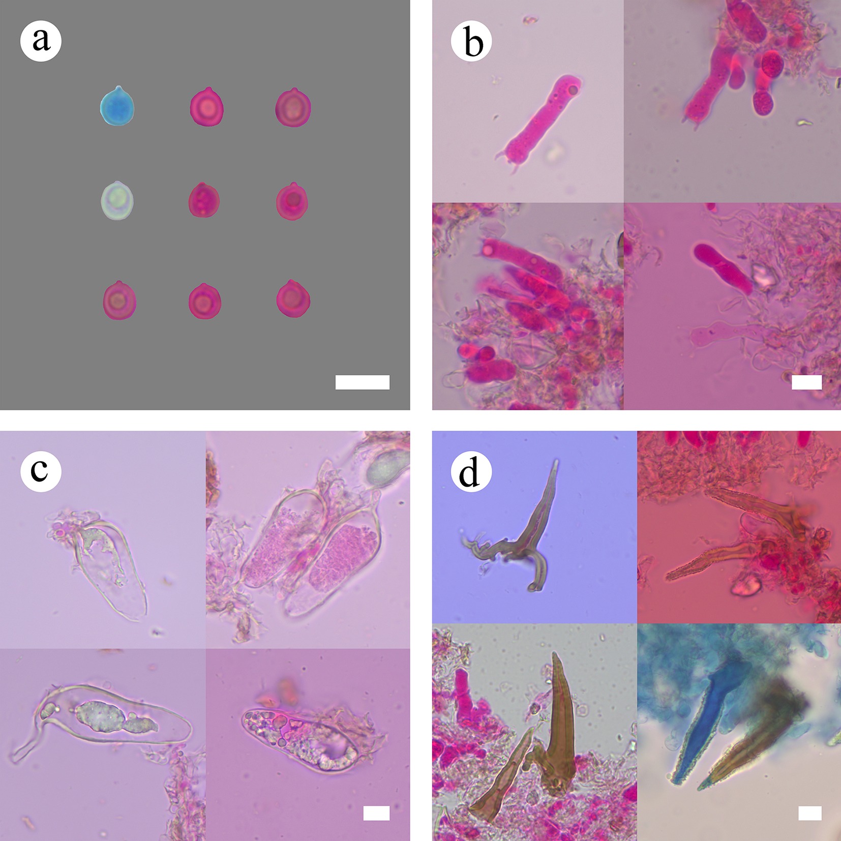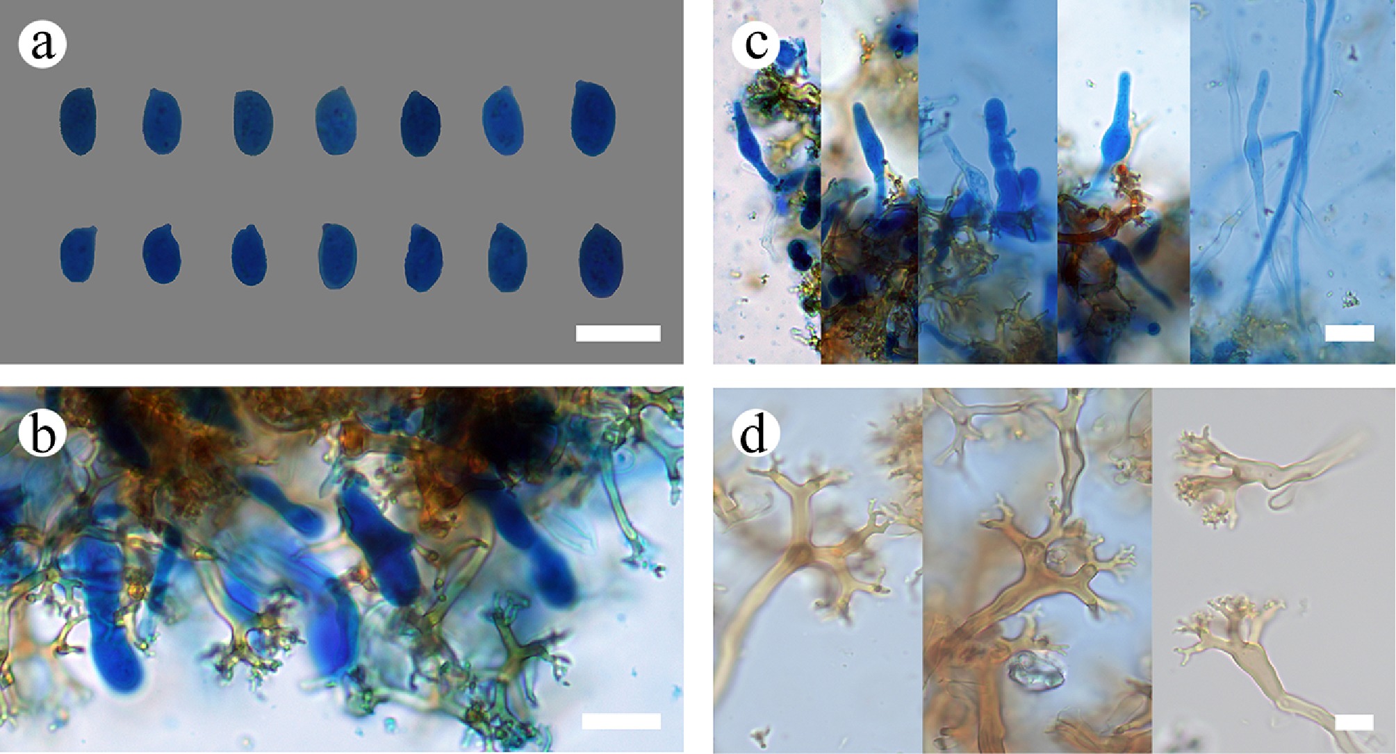 Sections of hymenium of Stereum convolutomarginatum (holotype). (a), (c) Section of hymenium. (b) Skeletal hyphae. (d) Basidiospores. Scale bars: (a)–(d) = 10 µm.