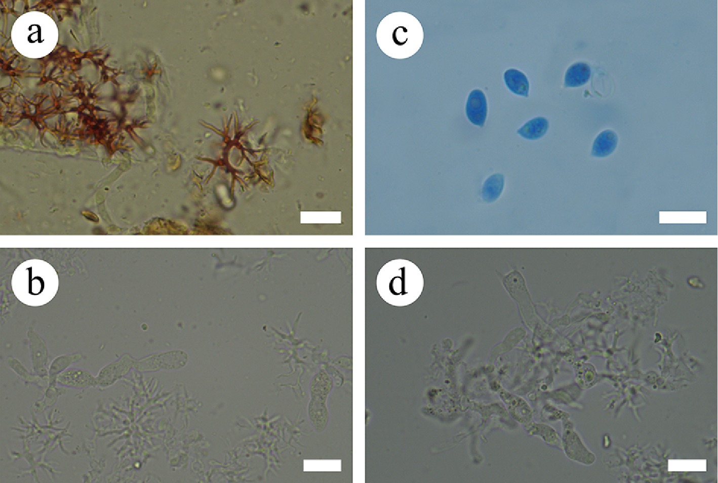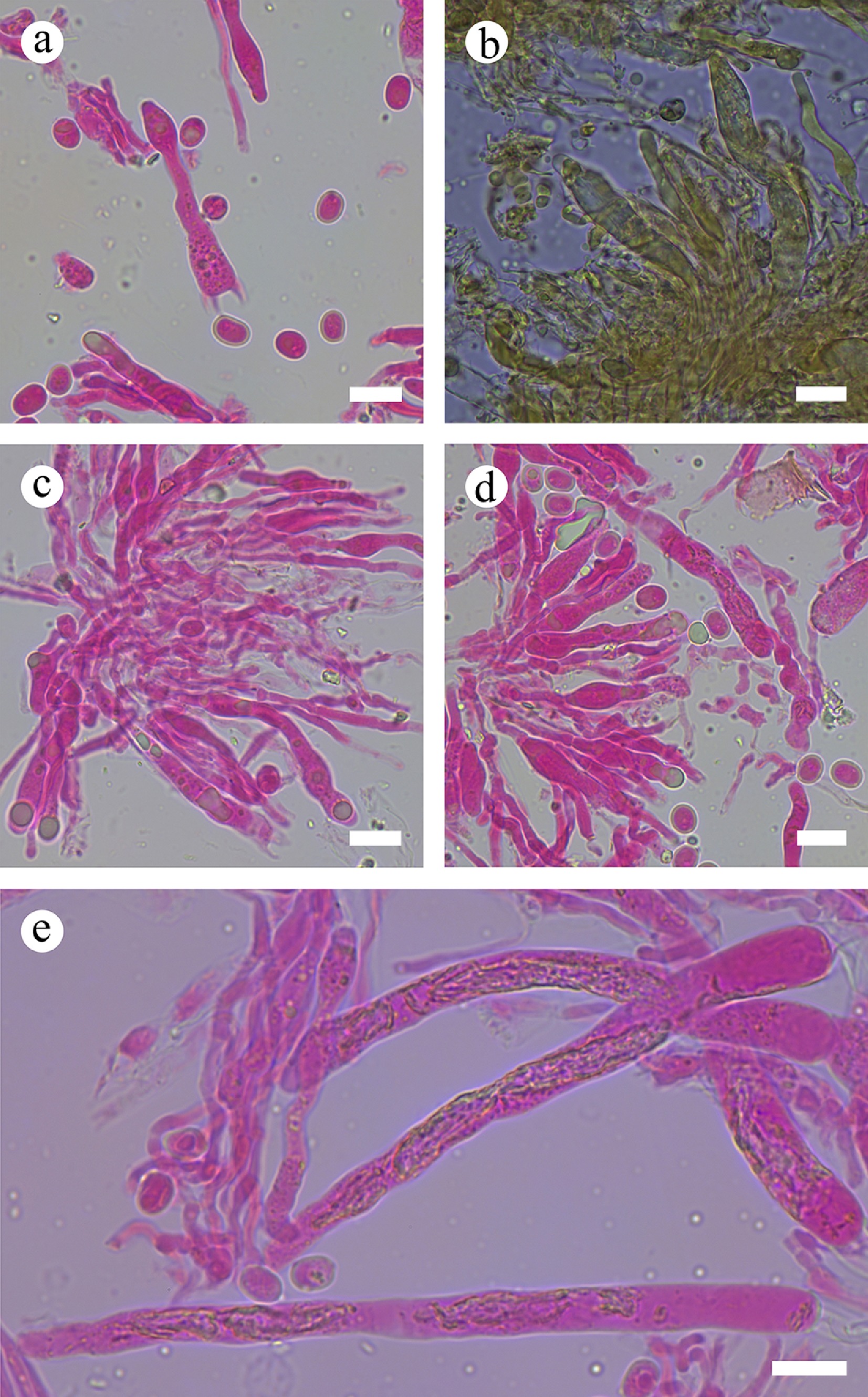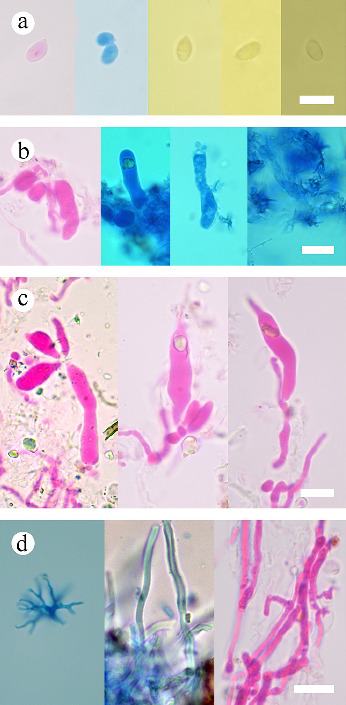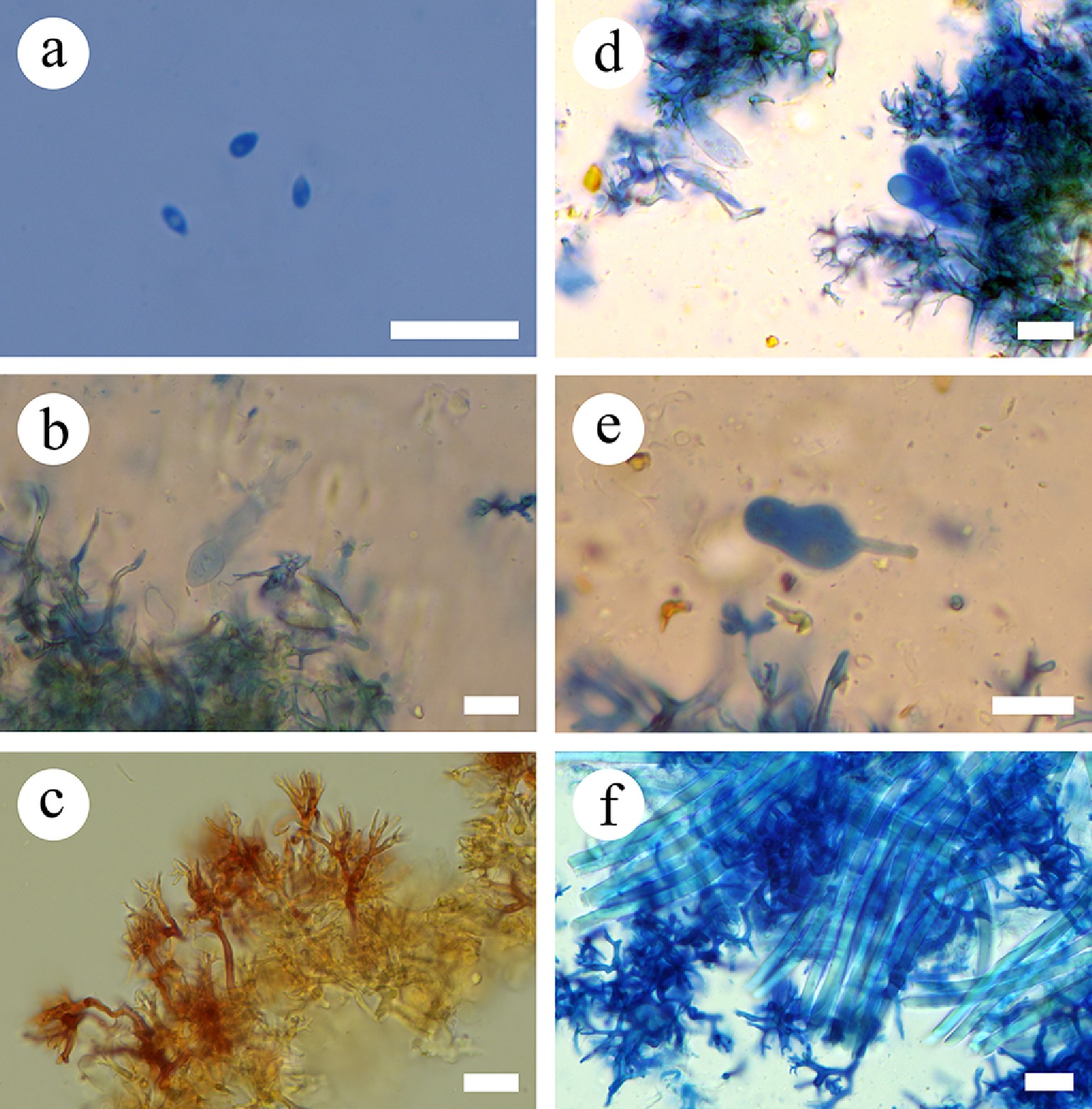 Sections of hymenium of Stereum convolutomarginatum (holotype). (a), (c) Section of hymenium. (b) Skeletal hyphae. (d) Basidiospores. Scale bars: (a)–(d) = 10 µm.