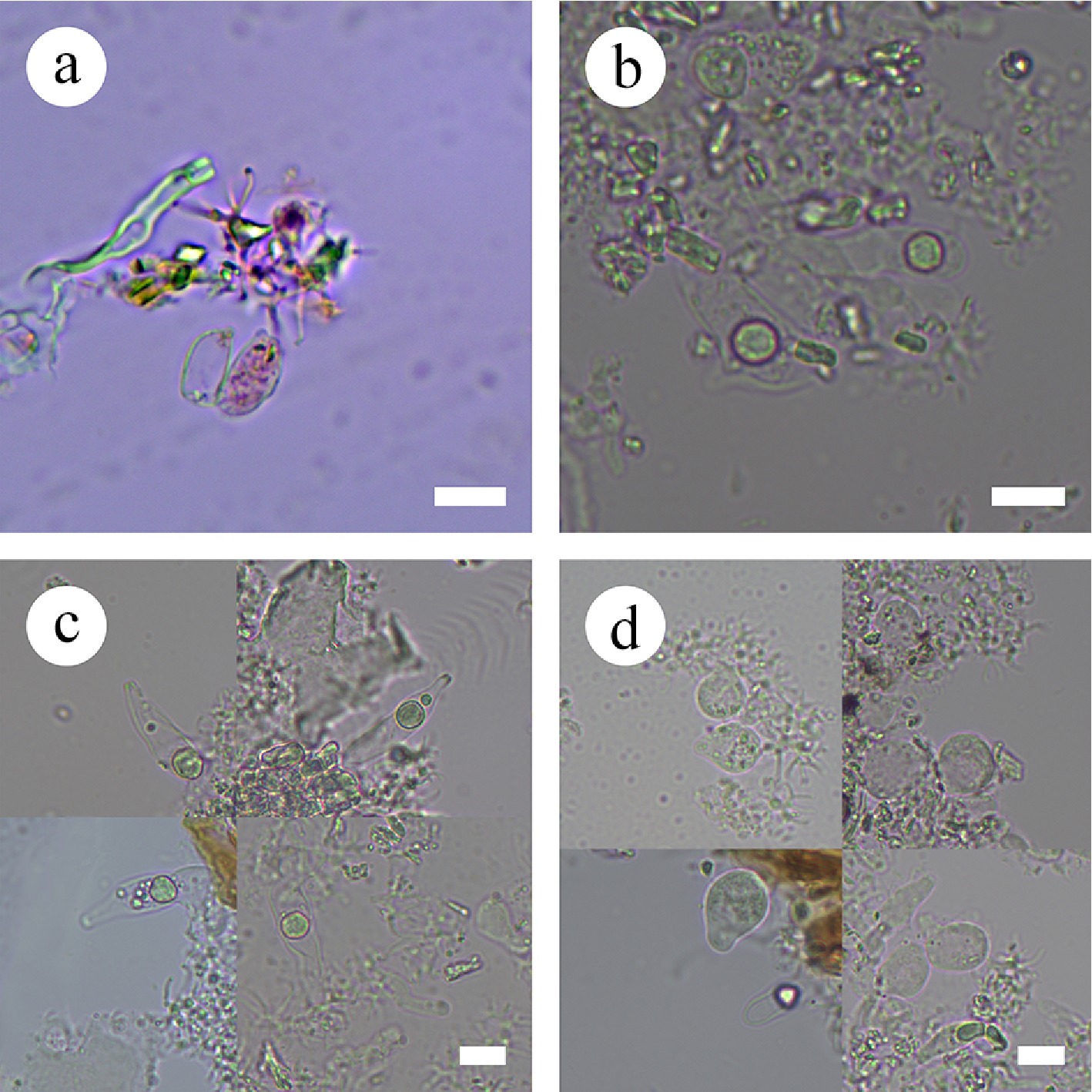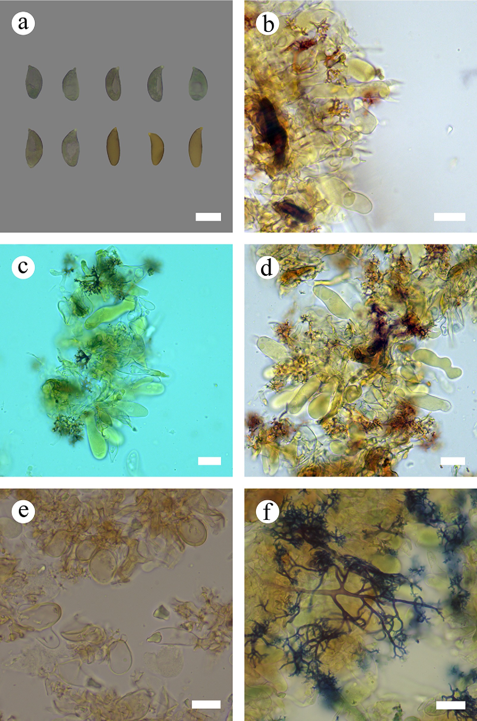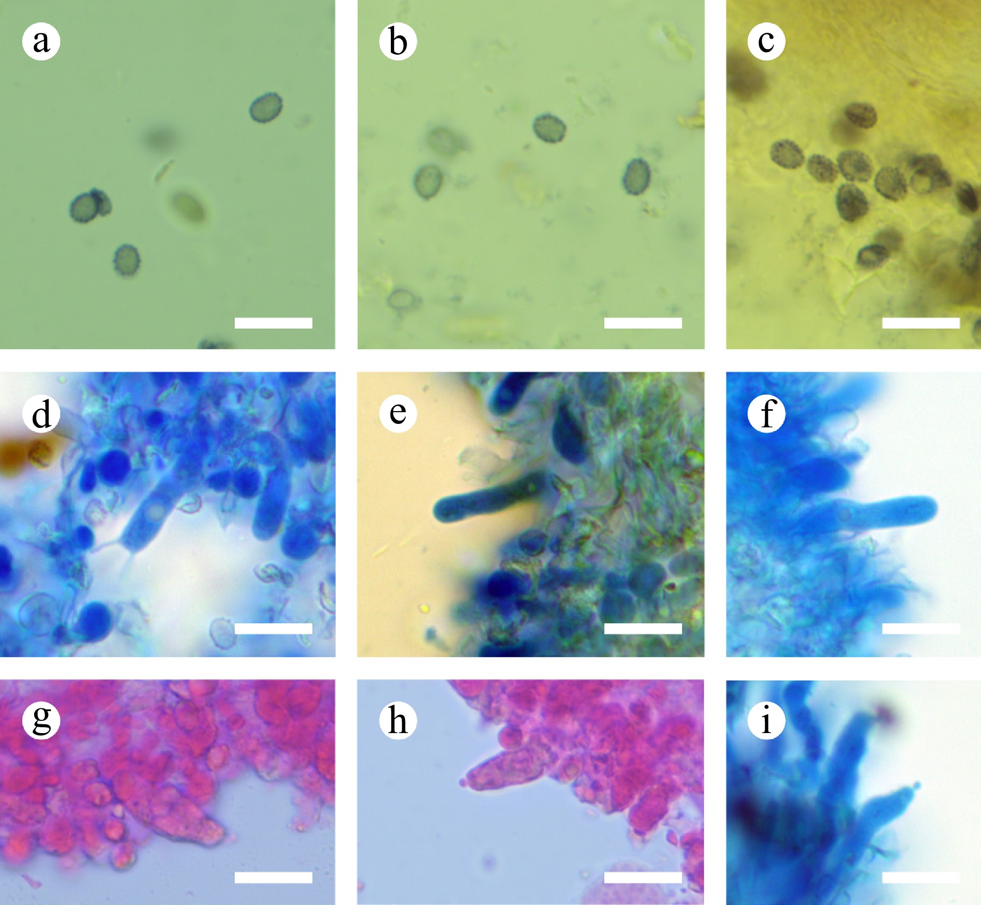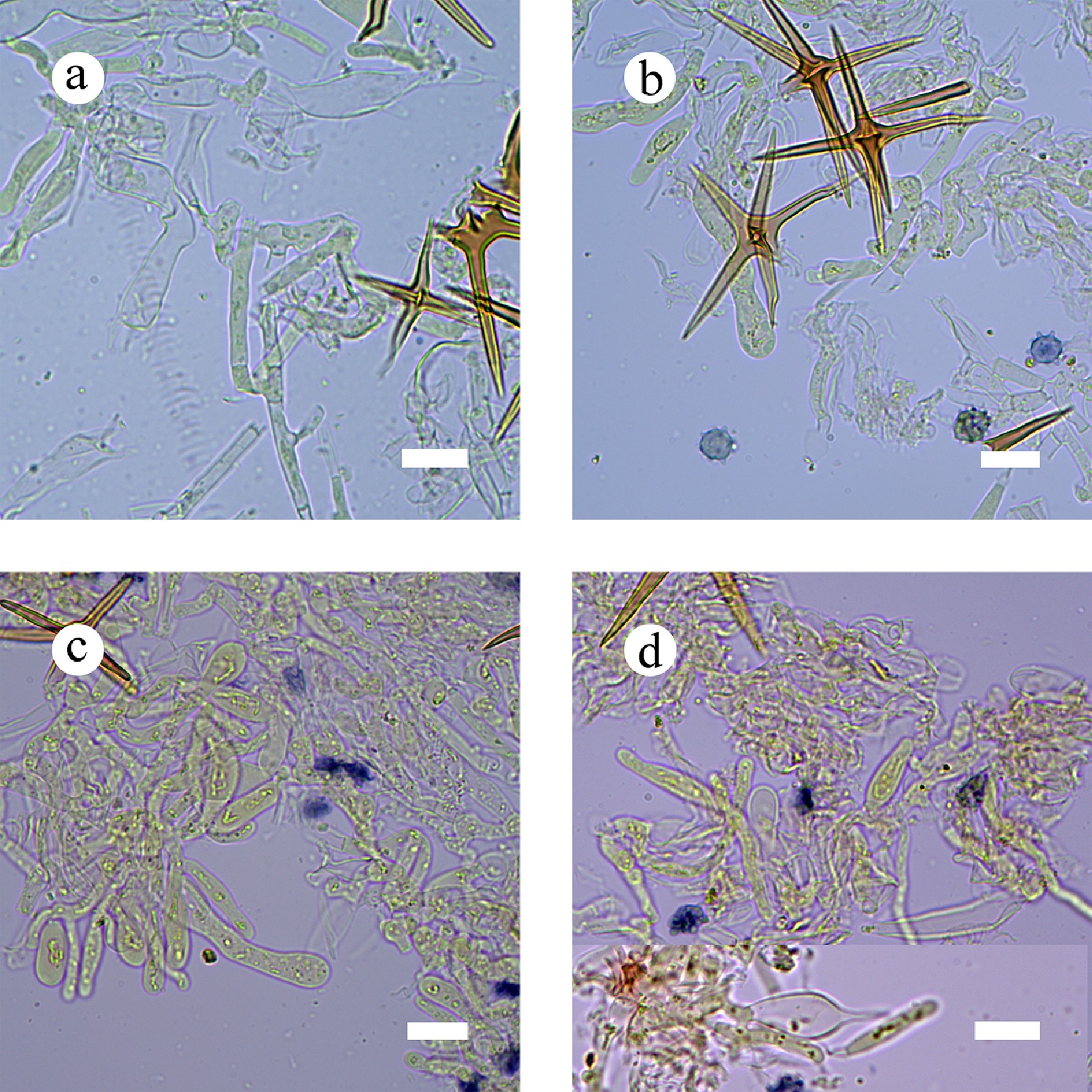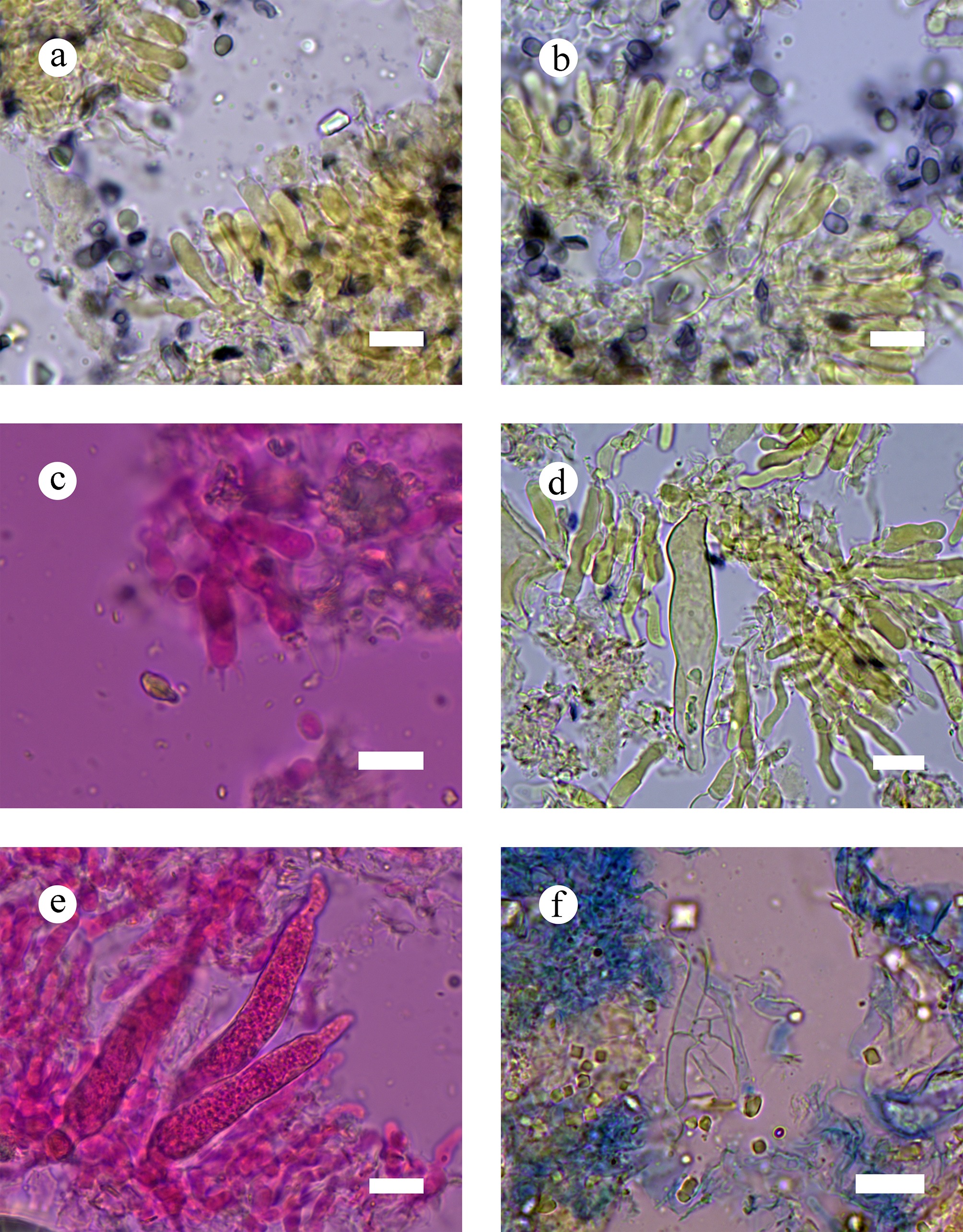 Sections of hymenium of Stereum convolutomarginatum (holotype). (a), (c) Section of hymenium. (b) Skeletal hyphae. (d) Basidiospores. Scale bars: (a)–(d) = 10 µm.
