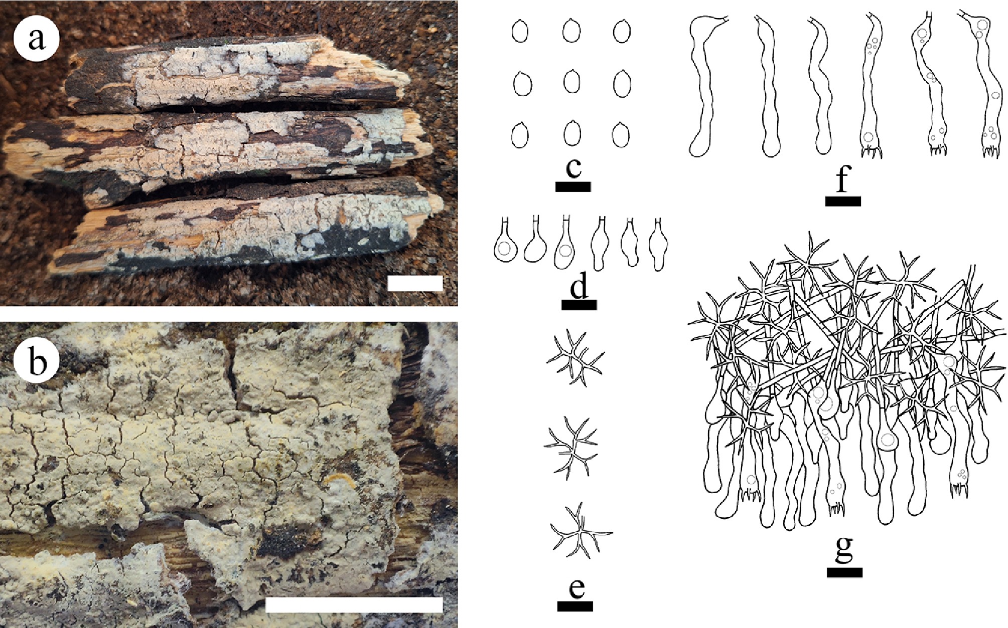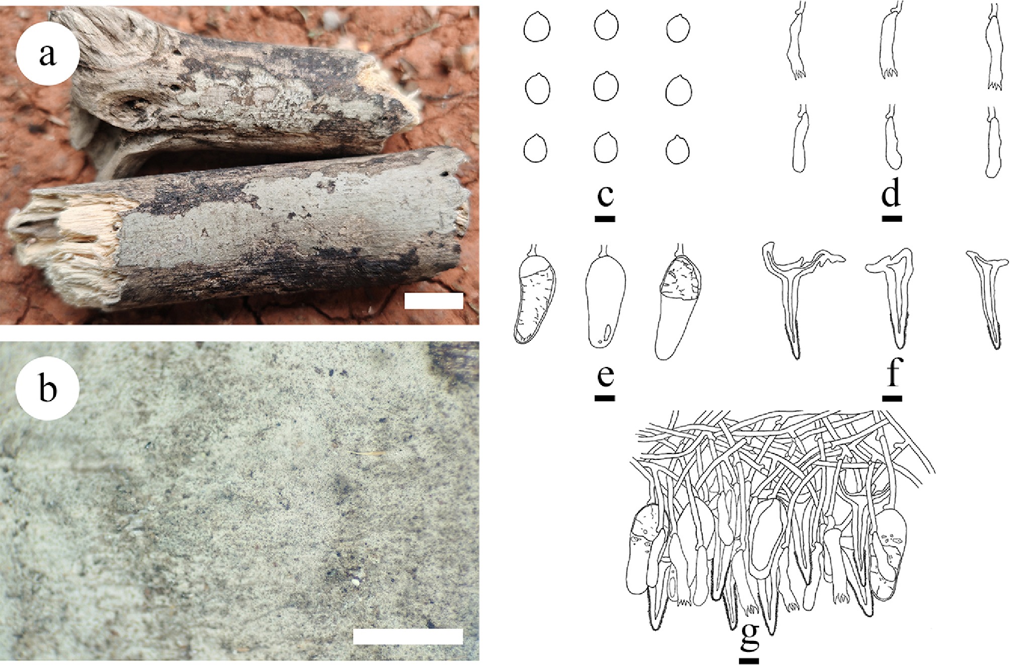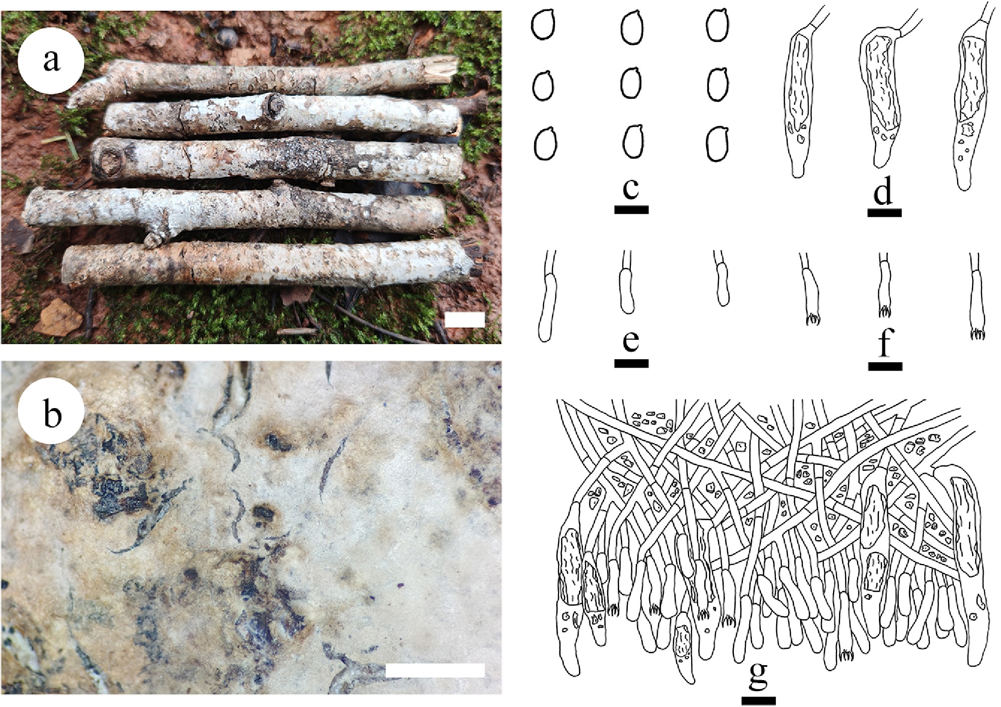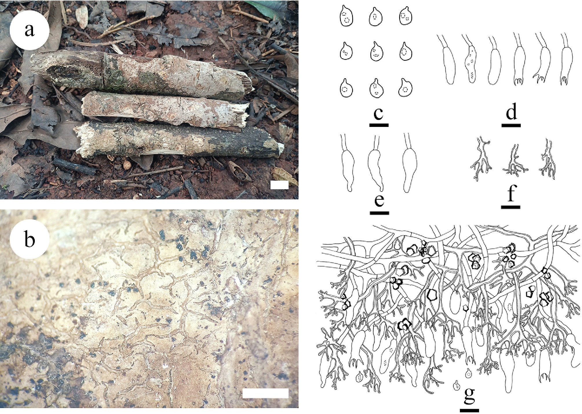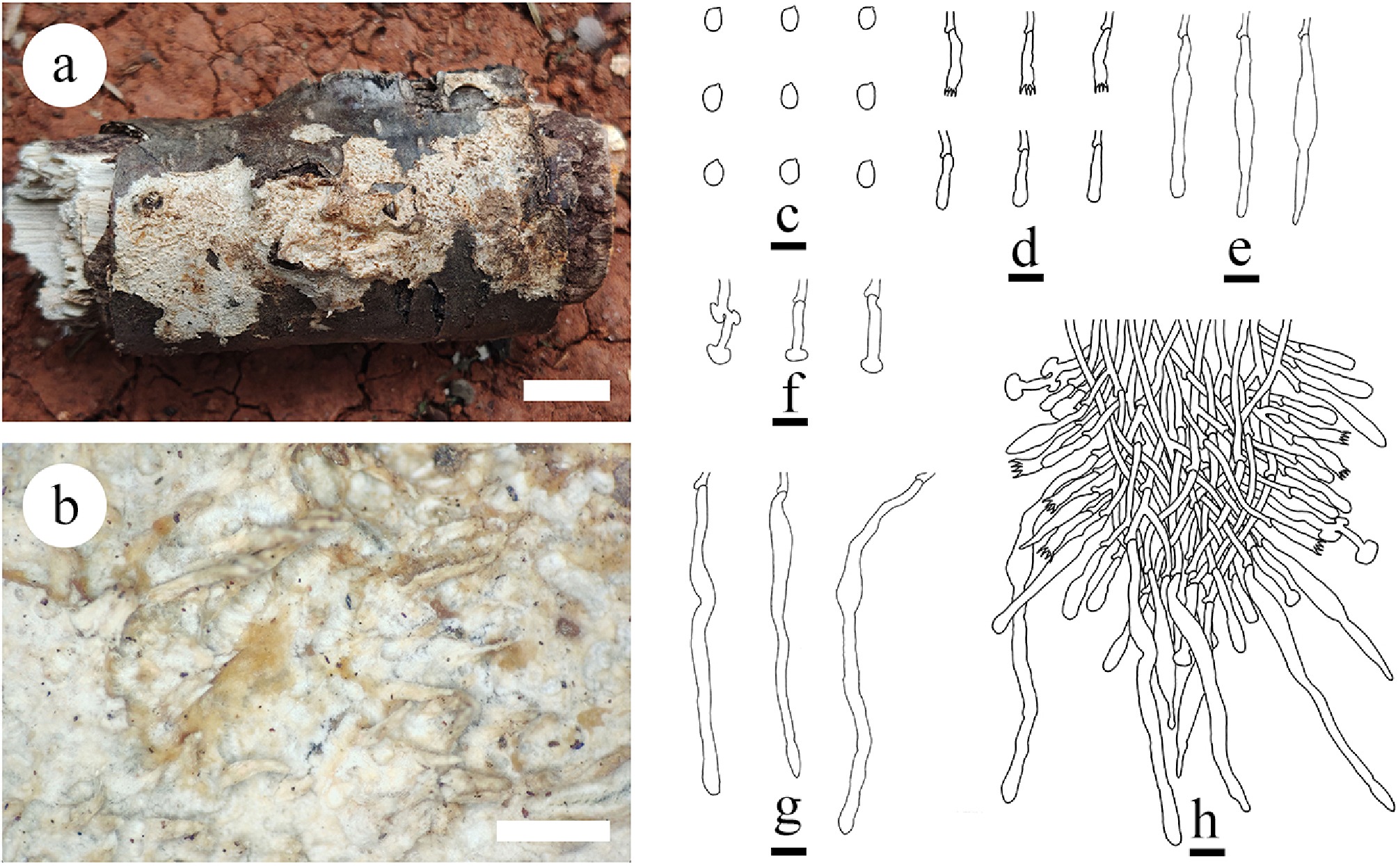 Additional material examined – China, Yunnan Province, Dali, Nanjian County, Lingbao Mountain National Forest Park, 100°30' E, 24°46' N, 2,000 m asl, on fallen angiosperm branch, leg. C.L. Zhao, 9 January, 2019, CLZhao 10241 (SWFC); Wenshan, Malipo County, Pingzhai Village, Forest farm, 104°42' E, 23°7' N, 1,057 m asl., on fallen angiosperm branch, leg. C.L. Zhao, 18 January, 2019, CLZhao 11416, CLZhao 11435, CLZhao 11449, CLZhao 11453, CLZhao 11455, CLZhao 11463, CLZhao 11501, CLZhao 11557, and CLZhao 11575; on angiosperm trunk, CLZhao 11399, CLZhao 11457 and CLZhao 11516 (SWFC); Dehong, Yingjiang County, Tongbiguan Provincial Nature Reserve, 24°71′ N, 94°52′ E, 1,500 m asl, on fallen angiosperm branch, leg. C.L. Zhao, 4 July, 2024, CLZhao 37604 and CLZhao 37696 (SWFC).
