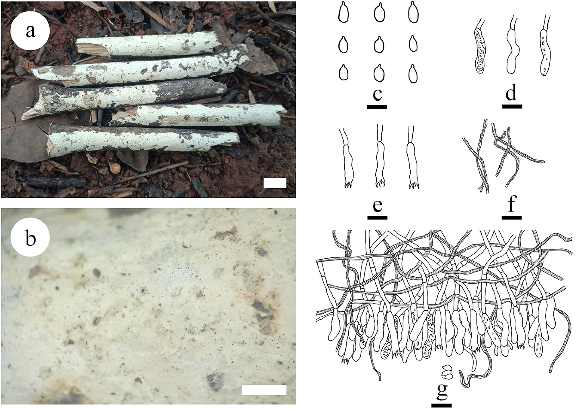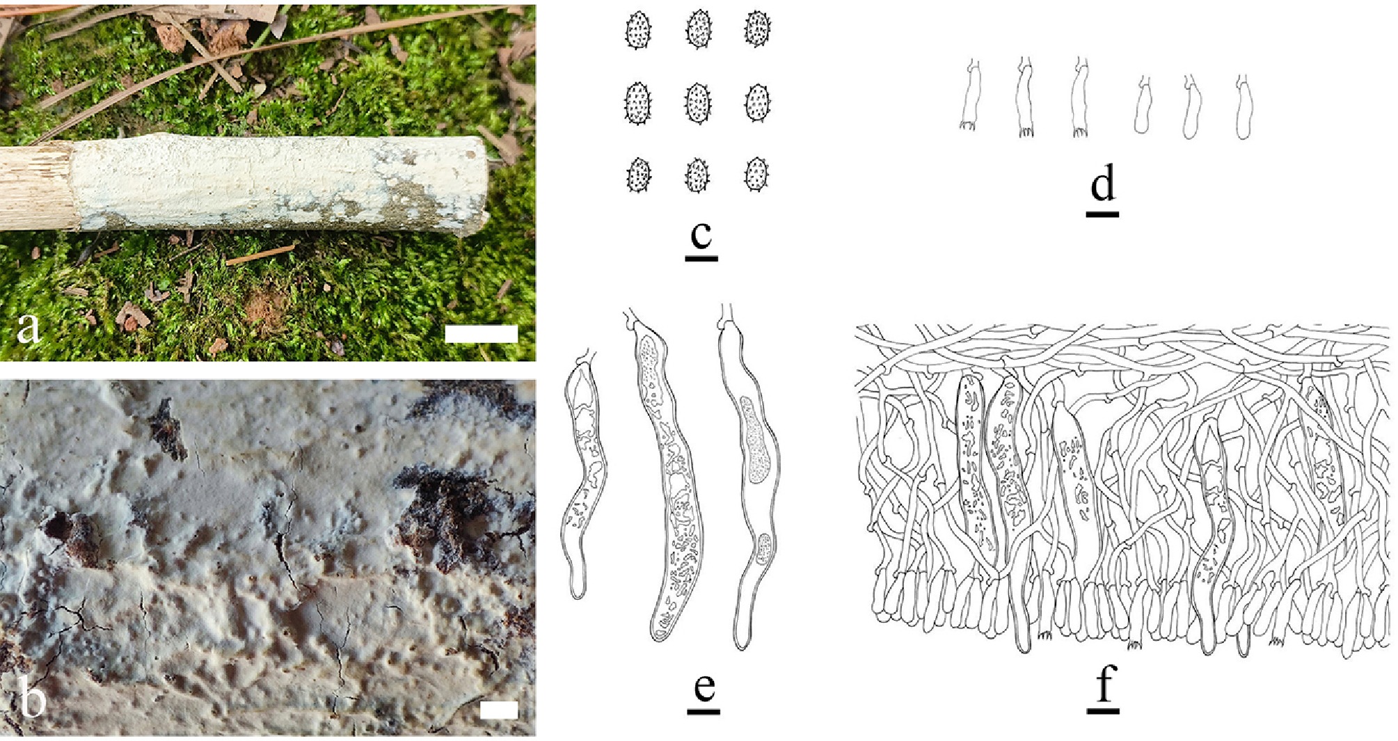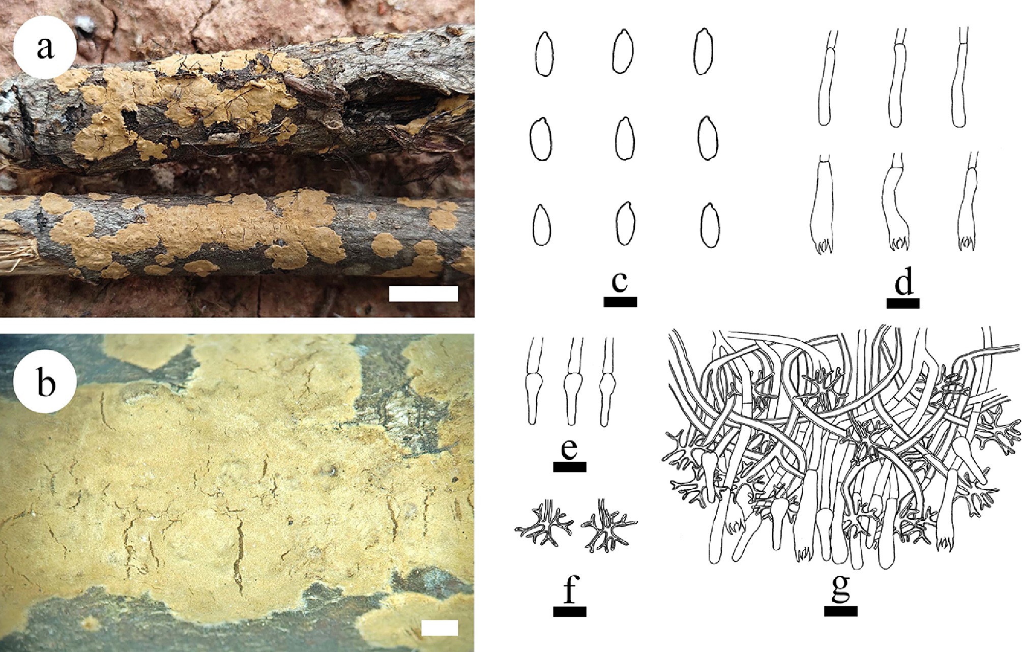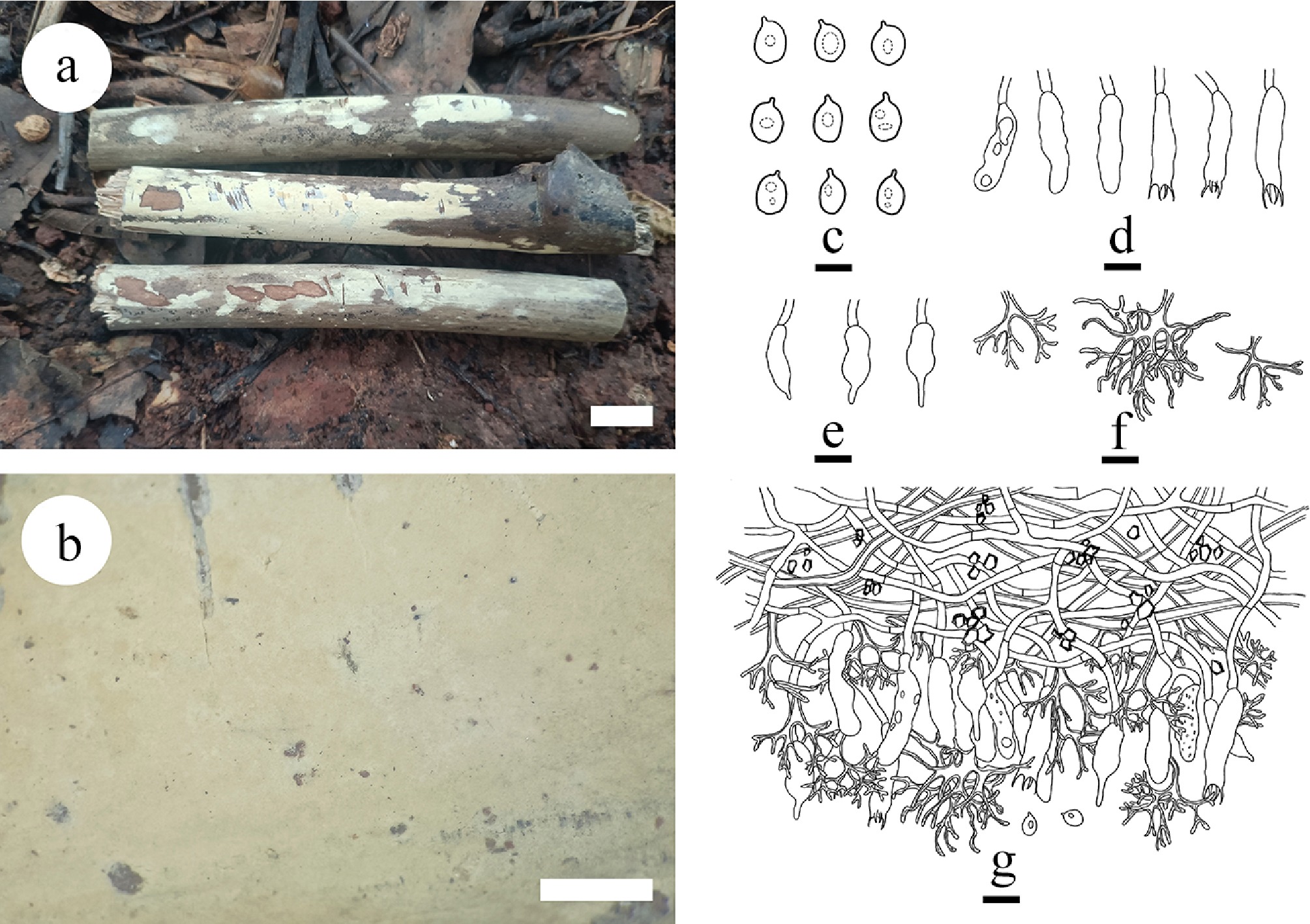Additional material examined – China, Yunnan Province, Dali, Nanjian County, Lingbao Mountain National Forest Park, 100°30' E, 24°46' N, 2,000 m asl, on fallen angiosperm branch, leg. C.L. Zhao, 9 January, 2019, CLZhao 10241 (SWFC); Wenshan, Malipo County, Pingzhai Village, Forest farm, 104°42' E, 23°7' N, 1,057 m asl., on fallen angiosperm branch, leg. C.L. Zhao, 18 January, 2019, CLZhao 11416, CLZhao 11435, CLZhao 11449, CLZhao 11453, CLZhao 11455, CLZhao 11463, CLZhao 11501, CLZhao 11557, and CLZhao 11575; on angiosperm trunk, CLZhao 11399, CLZhao 11457 and CLZhao 11516 (SWFC); Dehong, Yingjiang County, Tongbiguan Provincial Nature Reserve, 24°71′ N, 94°52′ E, 1,500 m asl, on fallen angiosperm branch, leg. C.L. Zhao, 4 July, 2024, CLZhao 37604 and CLZhao 37696 (SWFC).
