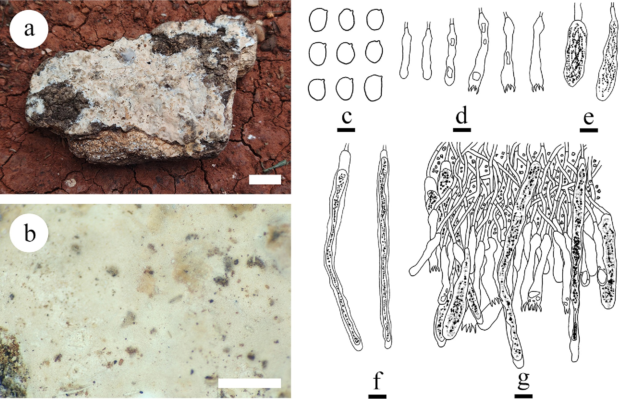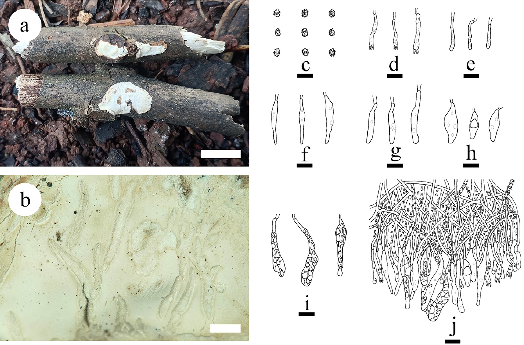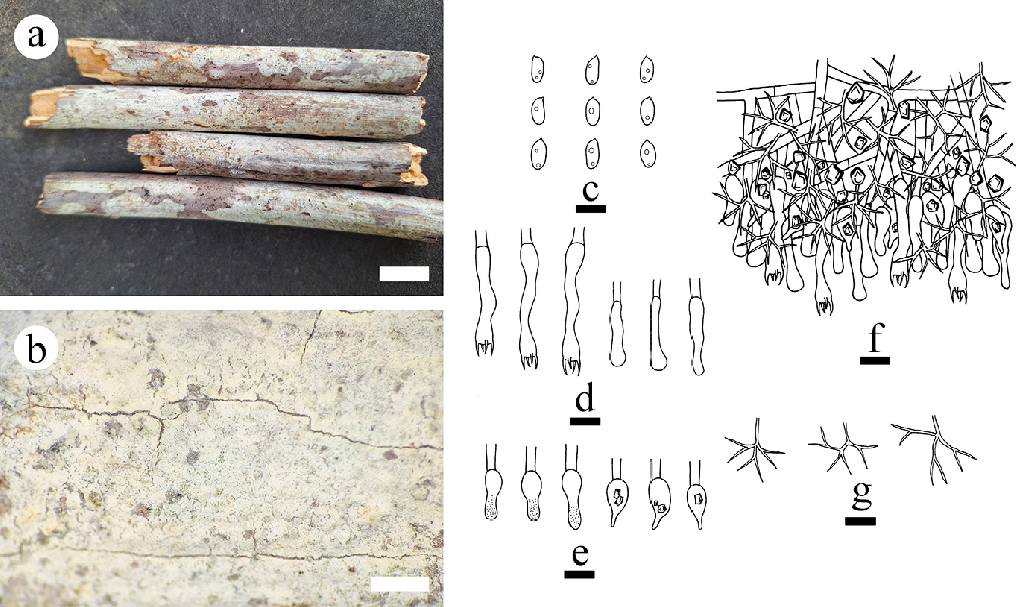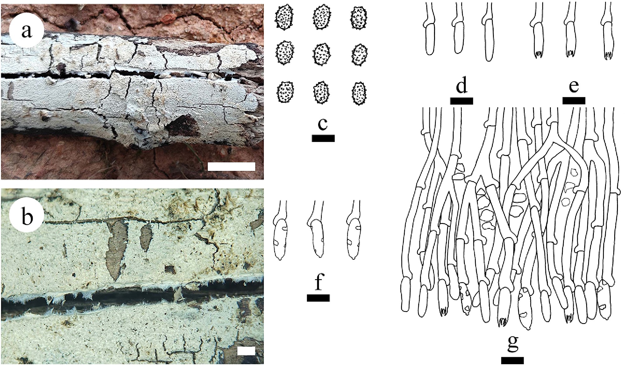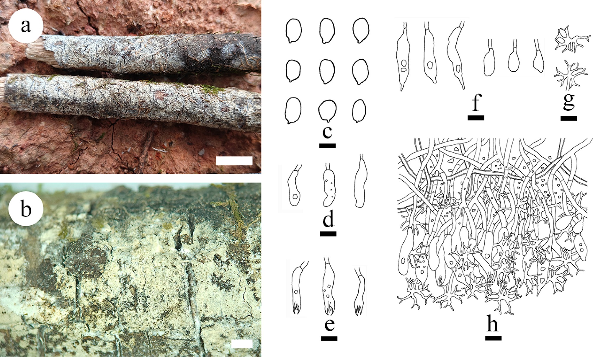 Additional material examined – China, Yunnan Province, Dali, Nanjian County, Lingbao Mountain National Forest Park, 100°30' E, 24°46' N, 2,000 m asl, on fallen angiosperm branch, leg. C.L. Zhao, 9 January, 2019, CLZhao 10241 (SWFC); Wenshan, Malipo County, Pingzhai Village, Forest farm, 104°42' E, 23°7' N, 1,057 m asl., on fallen angiosperm branch, leg. C.L. Zhao, 18 January, 2019, CLZhao 11416, CLZhao 11435, CLZhao 11449, CLZhao 11453, CLZhao 11455, CLZhao 11463, CLZhao 11501, CLZhao 11557, and CLZhao 11575; on angiosperm trunk, CLZhao 11399, CLZhao 11457 and CLZhao 11516 (SWFC); Dehong, Yingjiang County, Tongbiguan Provincial Nature Reserve, 24°71′ N, 94°52′ E, 1,500 m asl, on fallen angiosperm branch, leg. C.L. Zhao, 4 July, 2024, CLZhao 37604 and CLZhao 37696 (SWFC).