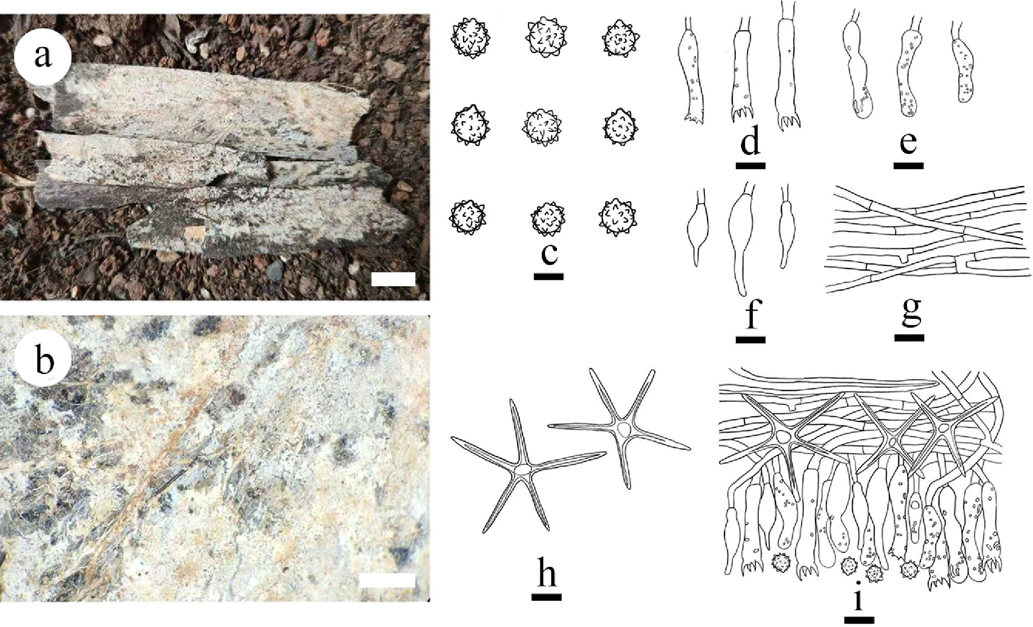 Diagnosis – Stereum rigidohymeneum differs from other species by the perennial, rigid basidiomata, effused to pileate, cream to light orange hymenial surface with tuberculate, a dimitic hyphal system, generative hyphae bearing simple septa, ellipsoid basidiospores.