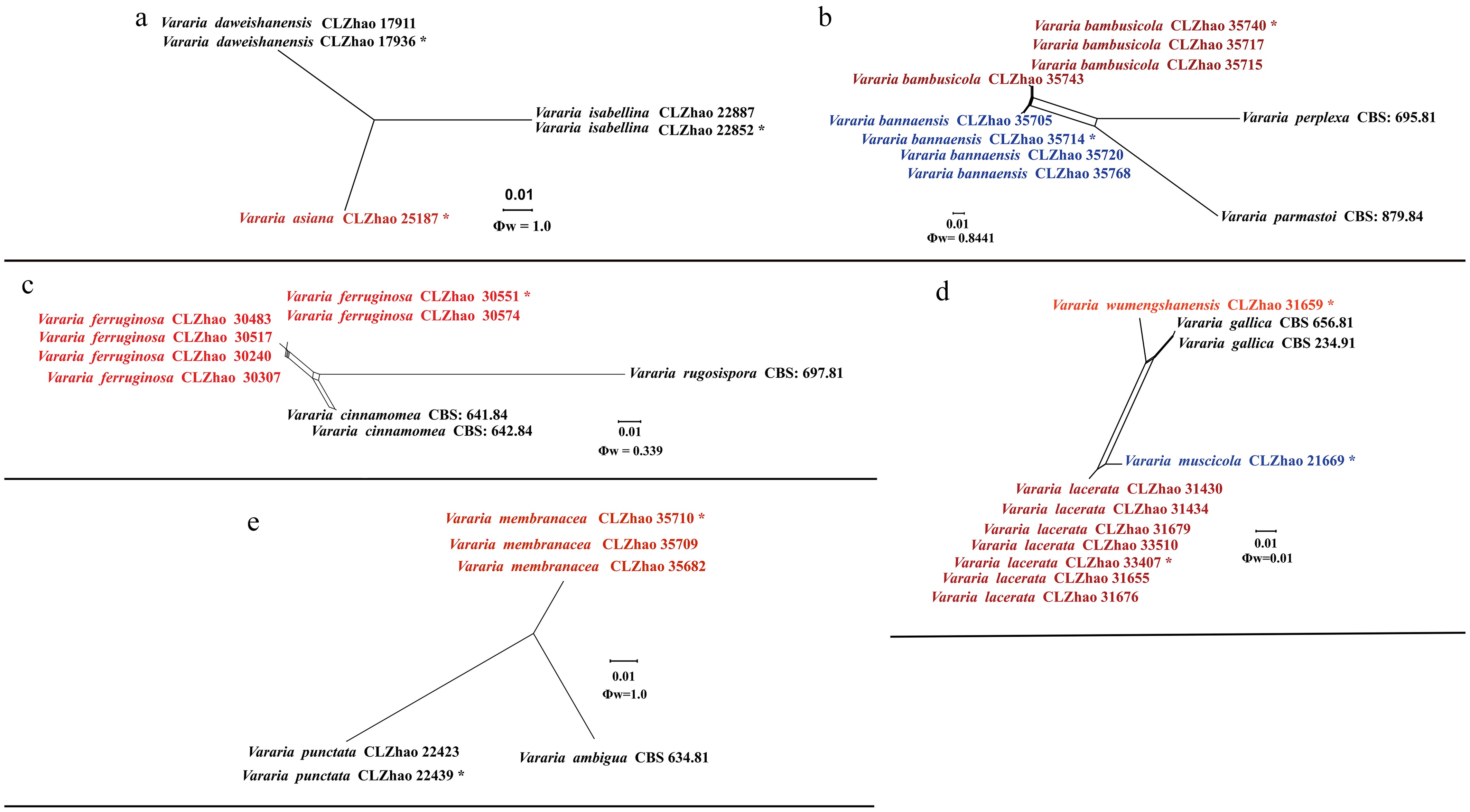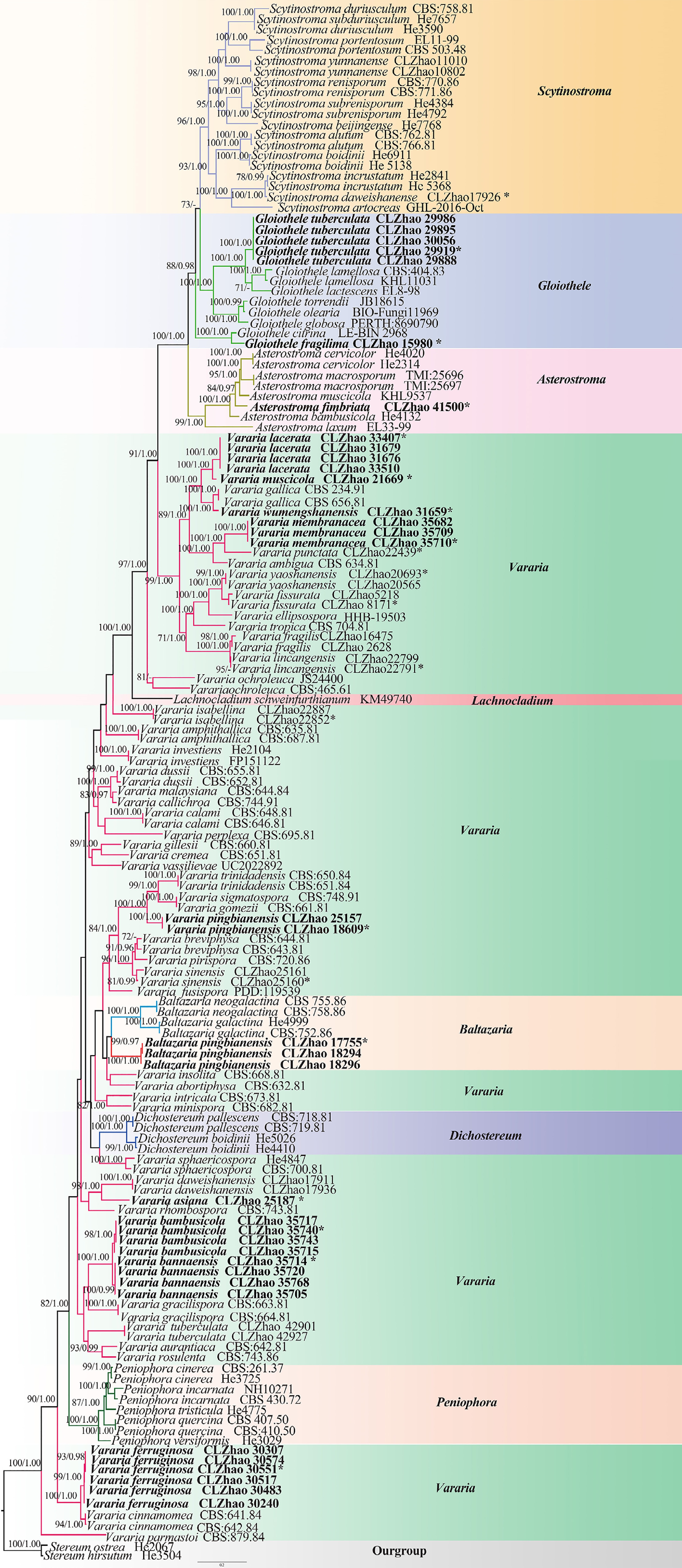 • Previous studies of family Peniophoraceae (Russulales) have shown that Vararia was closely related to Asterostroma, Baltazaria, Dichostereum, and Scytinostroma [ 33, 34, 43, 172, 219, 221] . In the present study, the phylogenetic analysis of Vararia and other related genera, inferred from the dataset of ITS + nLSU + mtSSU + rpb2 + tef1- α ( Fig. 1), reveals that Vararia forms different clades, and three genera Baltazaria, Dichostereum, and Peniophora are distributed within Vararia. According to the lineage delimitation, some genera are morphologically well-circumscribed, but some have wide ranges in several aspects, and most genera exhibit their specific characteristics. Asterostroma is strongly supported to a single clade characterized by asterosetae and ornamented basidiospores. Baltazaria and Dichostereum are both monotypic, in which the former is characterized by fibriform skeletal hyphae without simple septa and smooth basidiospores, the latter is characterized by dichohyphae and ornamented basidiospores. Scytinostroma s. str. comprises species with fibriform skeletal hyphae, abundant gloeocystidia and smooth basidiospores. Vararia s. str. remains a complex assemblage of species with diverse morphology characterized by dichohyphae, gloeocystidia and smooth basidiospores. At present, we prefer to treat it in a rather broad sense to avoid more lineages and new names. Peniophora s. str. is characterized by the numerous cystidia encrusted with crystals and smooth basidiospores.