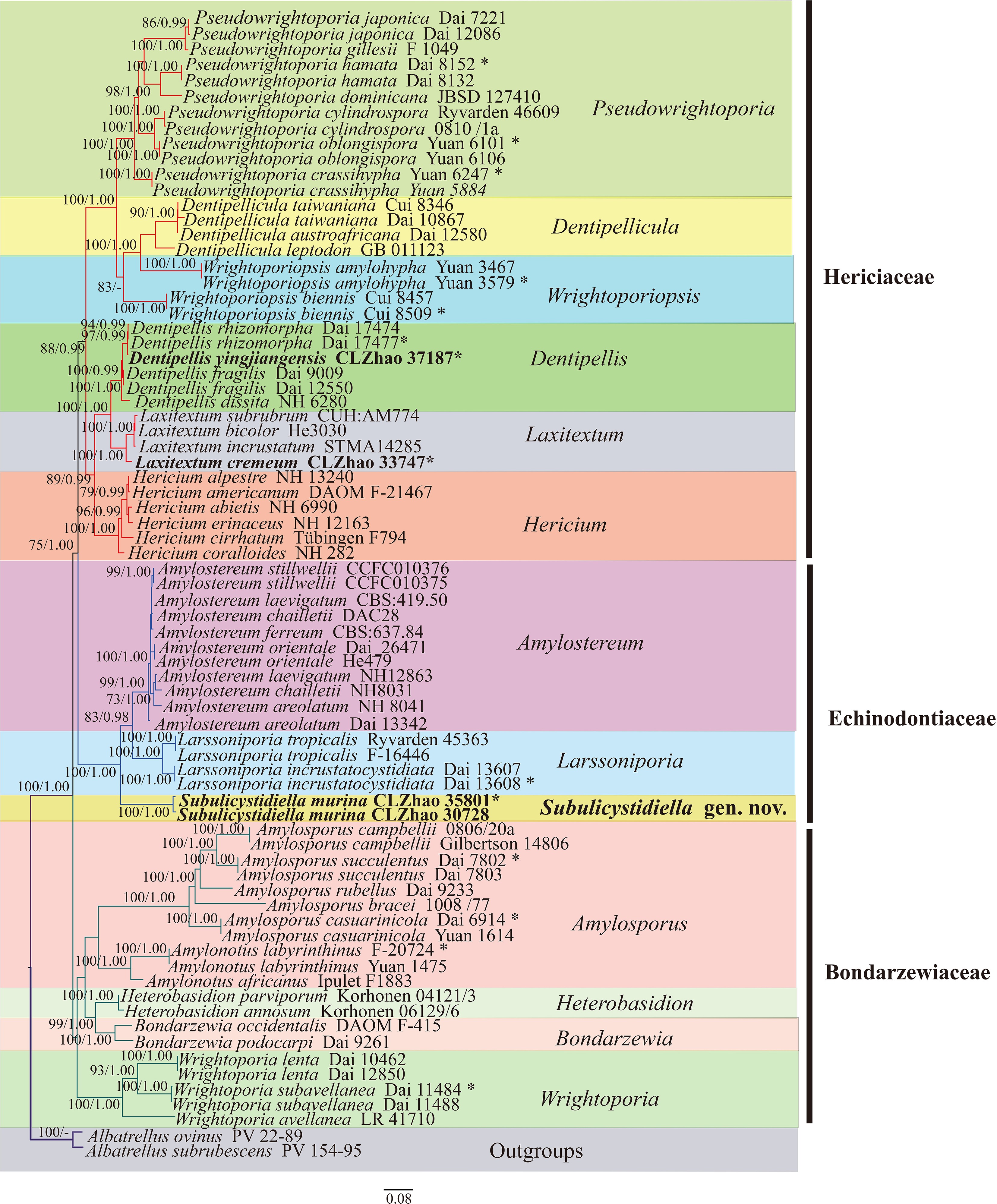 • The family Echinodontiaceae includes four genera, Amylostereum, Echinodontiellum, Echinodontium, and Larssoniporia. Except for Larssoniporia, which has a poroid basidiomata, the other three genera have corticioid basidiomata [ 10] . The divergence time of family Echinodontiaceae and the genus Subulicystidiella are at 150.57 Mya (113.56–190.2 Mya, 95% HPD), and 114.84 Mya (125.46–202.89 Mya, 95% HPD), based on ITS + nLSU + rpb2 + tef1- α sequence data ( Fig. 2). Inference from the ITS + nLSU + mtSSU + rpb2 + tef1- α ( Fig. 1) sequence data showed that Subulicystidiella formed a monophyletic clade with statistical support of 87/1.00, and the ITS + nLSU ( Fig. 4) sequence data showed that Subulicystidiella formed an alone clade with statistical support of 100/100. These indicate that S. murina is distinct from all other species sampled in the phylogenetic analysis. However, due to the limited taxa of Subulicystidiella, the topology may be influenced by taxon sampling. Meanwhile, morphologically, Subulicystidiella was similar to the genus Amylostereum (Echinodontiaceae) by its dimitic hyphal system, thick-walled, yellowish brown subulate, encrusted cystidia, and smooth basidiospores, but the latter has effused-reflexed basidiomata, first as small colonies, later confluent, azonate, pale mouse gray to grayish-brown hymenophore, and distinctly amyloid basidiospores [ 139] . In addition, the type genus Echinodontium of the family Echinodontiaceae is characterised by annual to perennial, resupinate, effused-reflexed to pileate-sessile basidiomata, dimitic hyphal system, generative hyphae with or without clamp-connections, skeletal hyphae inamyloid or dextrinoid, gloeocystidia present or incrusted cystidia absent or present, with smooth basidiospores [ 1] . The characteristics of the new genus Subulicystidiella are consistent with those of Echinodontiaceae. Thus, we introduce Subulicystidiella as a new genus and belongs to this family Echinodontiaceae based on phylogenetic analyses and morphological characteristics.