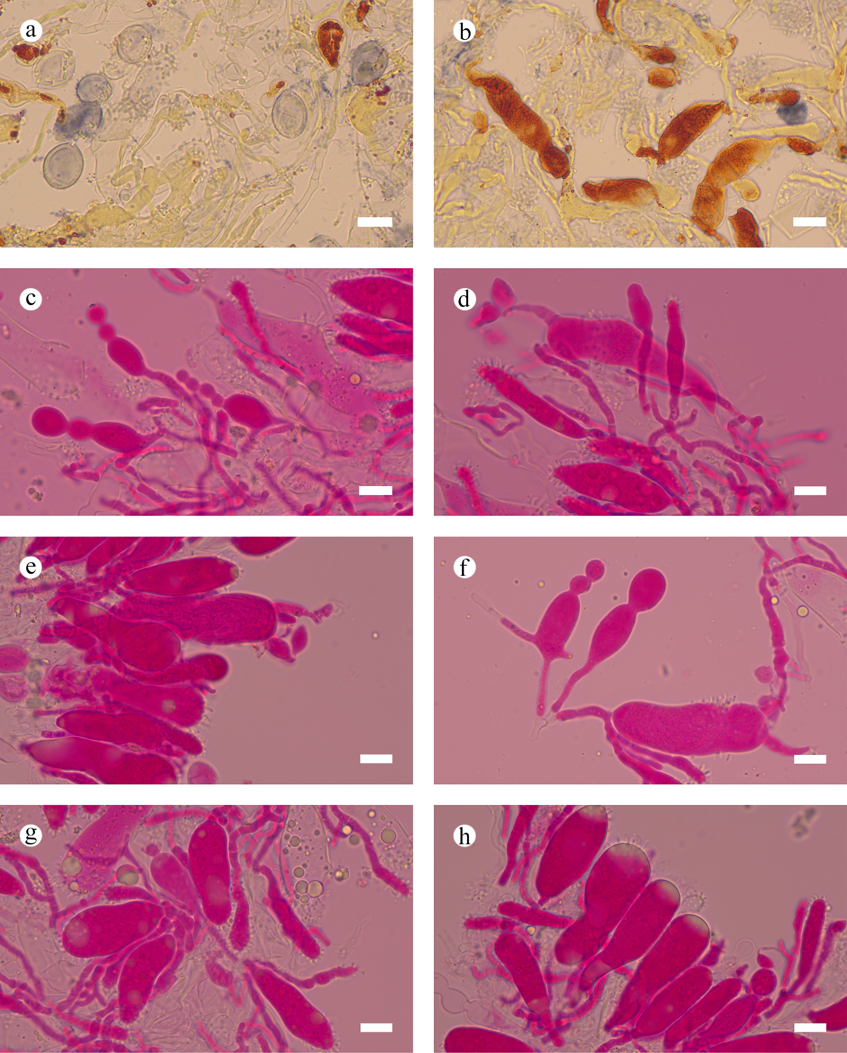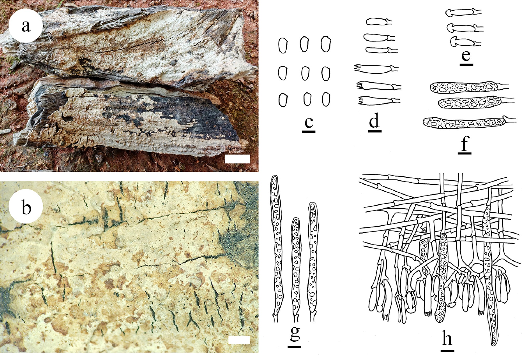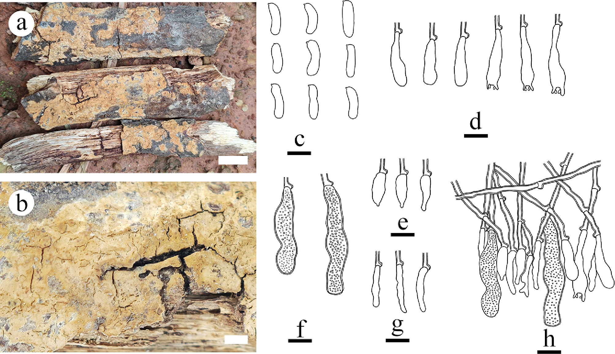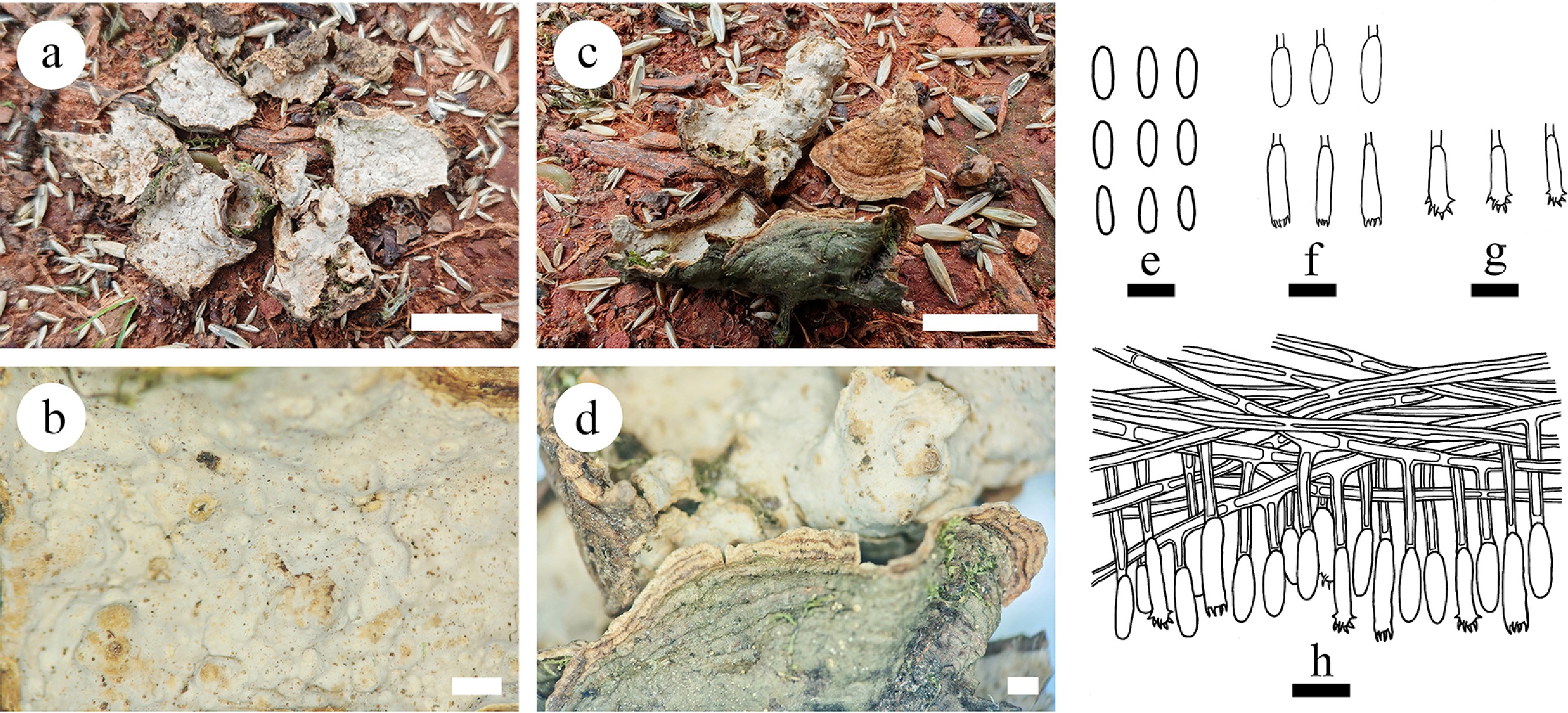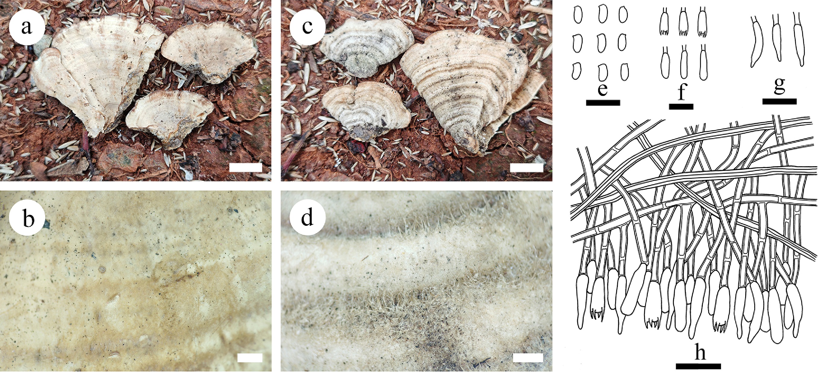 Basidiomata and microscopic structures of Stereum yunnanense (holotype). (a), (b) Section of hymenophore. (c), (d) The back of the basidiomata. (e) Basidiospores. (r) Basidia and basidioles. (g) Cystidia. (h) Section of hymenium. Scale bars: (a), (c) = 1 cm, (b), (d) = 1 mm, (e)–(h) = 10 µm.