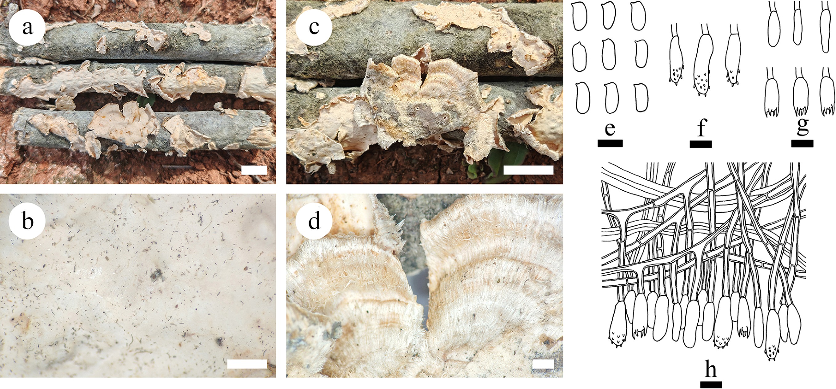 Basidiomata and microscopic structures of Stereum convolutomarginatum (holotype). (a), (c) Basidiomata on the natural substrates. (b), (d) A character hymenophore. (e) Basidiospores. (f) Acanthocystidia. (g) Basidia and basidioles. (h) Section of hymenium. Scale bars: (a), (c) = 1 cm, (b), (d) = 1 mm, (e)–(h) = 10 µm.