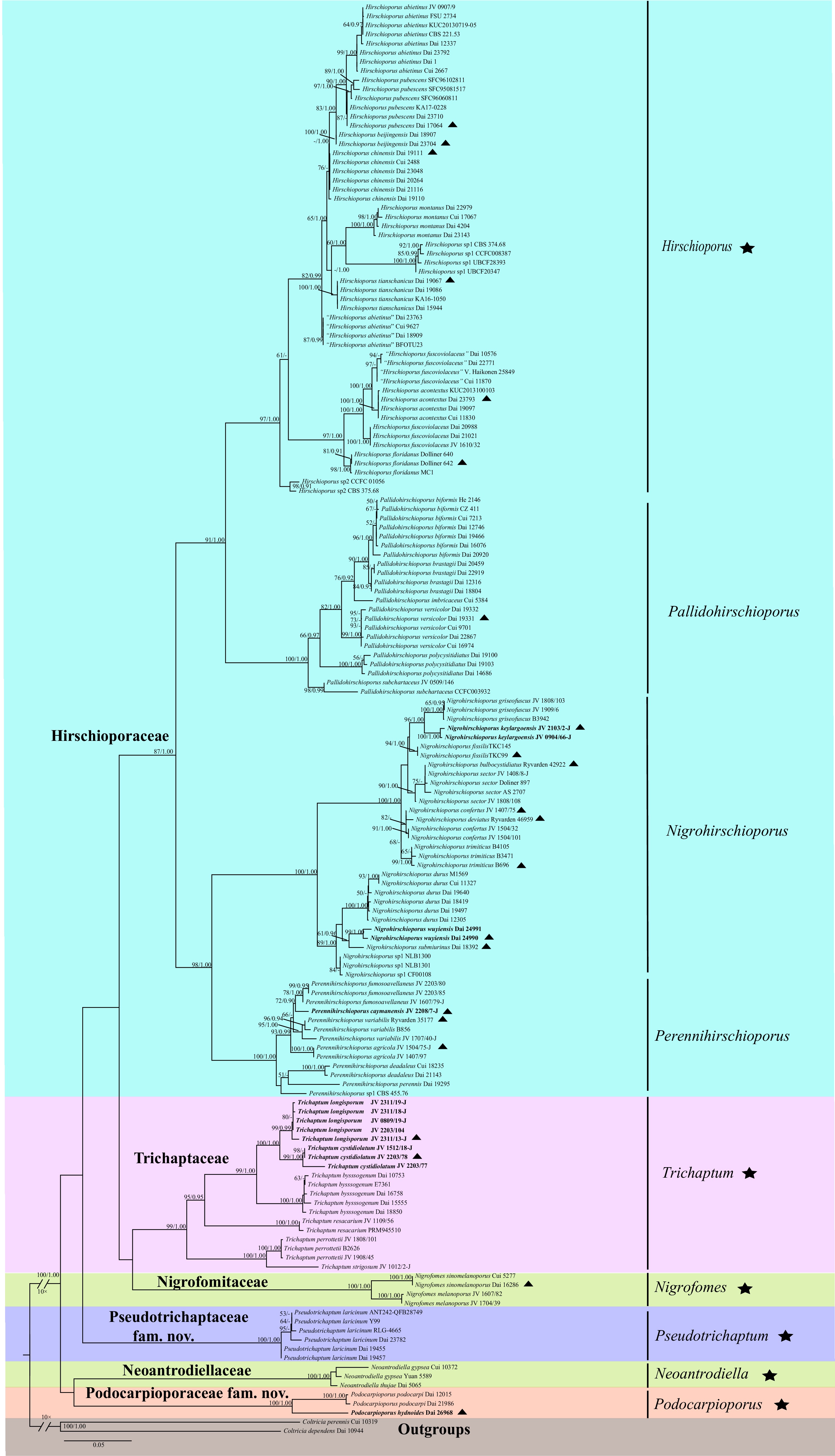 • Trichaptum s.l. was established in 1904, belonging to Hymenochaetales of Agaricomycetes within Basidiomycota, but its family-level classification has been controversial, and it has been considered a genus as incertae sedis[8186]. The establishment of Trichaptum s.l. as a complex comprising two families and seven genera resolved long-standing taxonomic uncertainties[39]. The family Hirschioporaceae consisted of four genera, including Hirschioporus, Nigrohirschioporus, Pallidohirschioporus, and Perennihirschioporus, and Trichaptaceae included a single genus Trichaptum. However, previous studies focused on Asia, and the two genera Podocarpioporus and Pseudotrichaptum have not clearly defined their family-level taxonomic status.