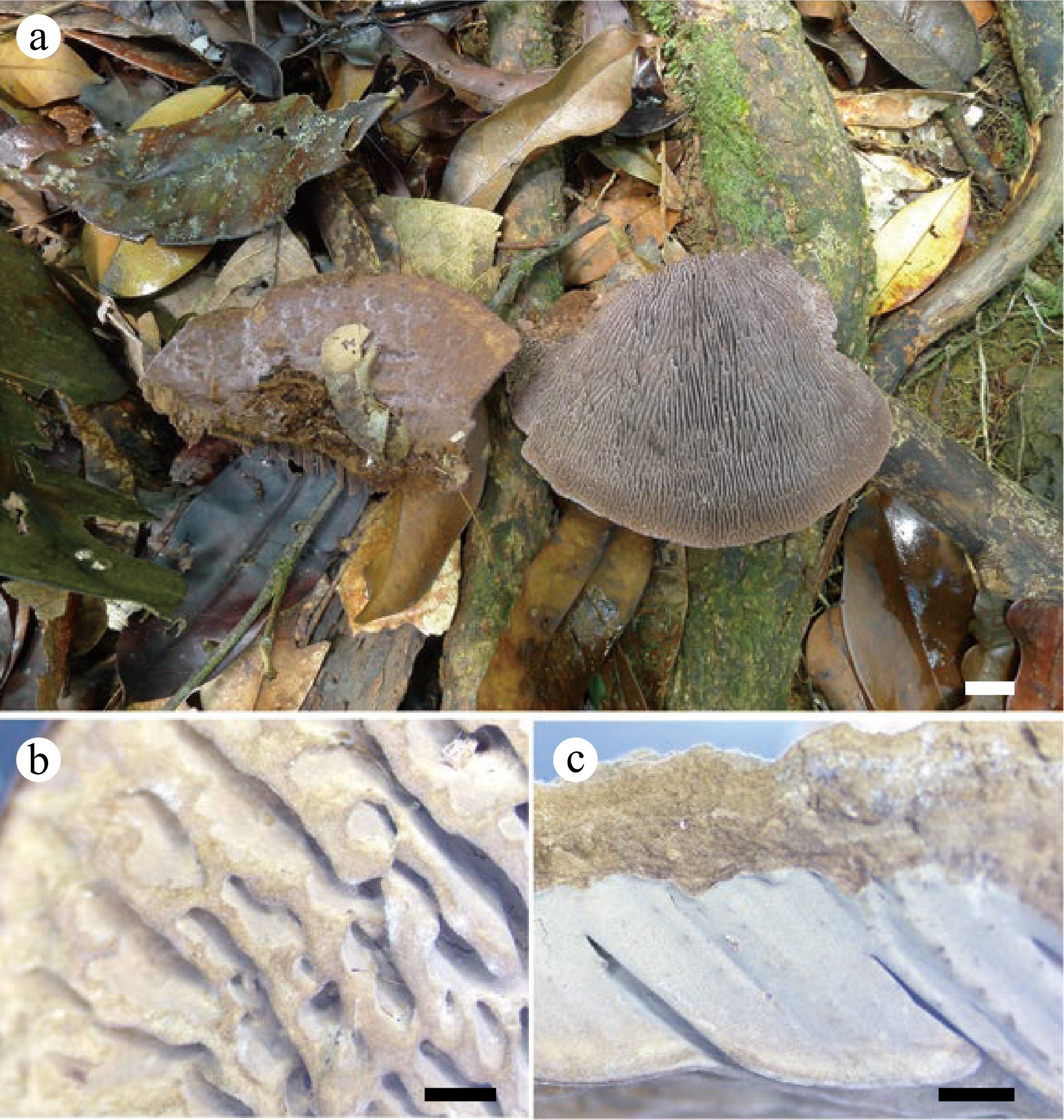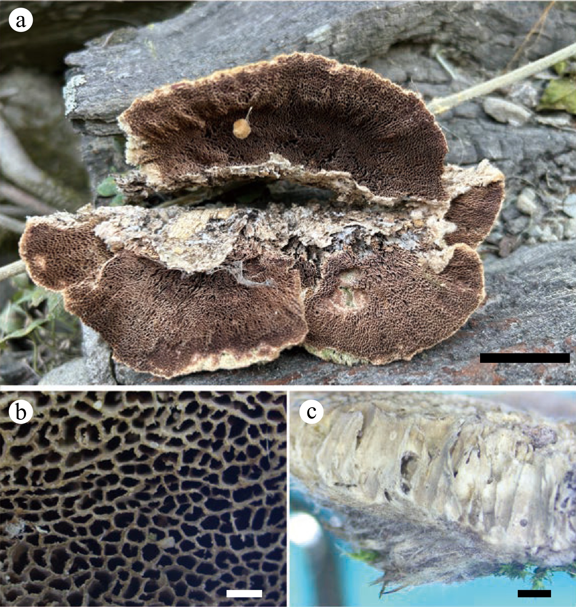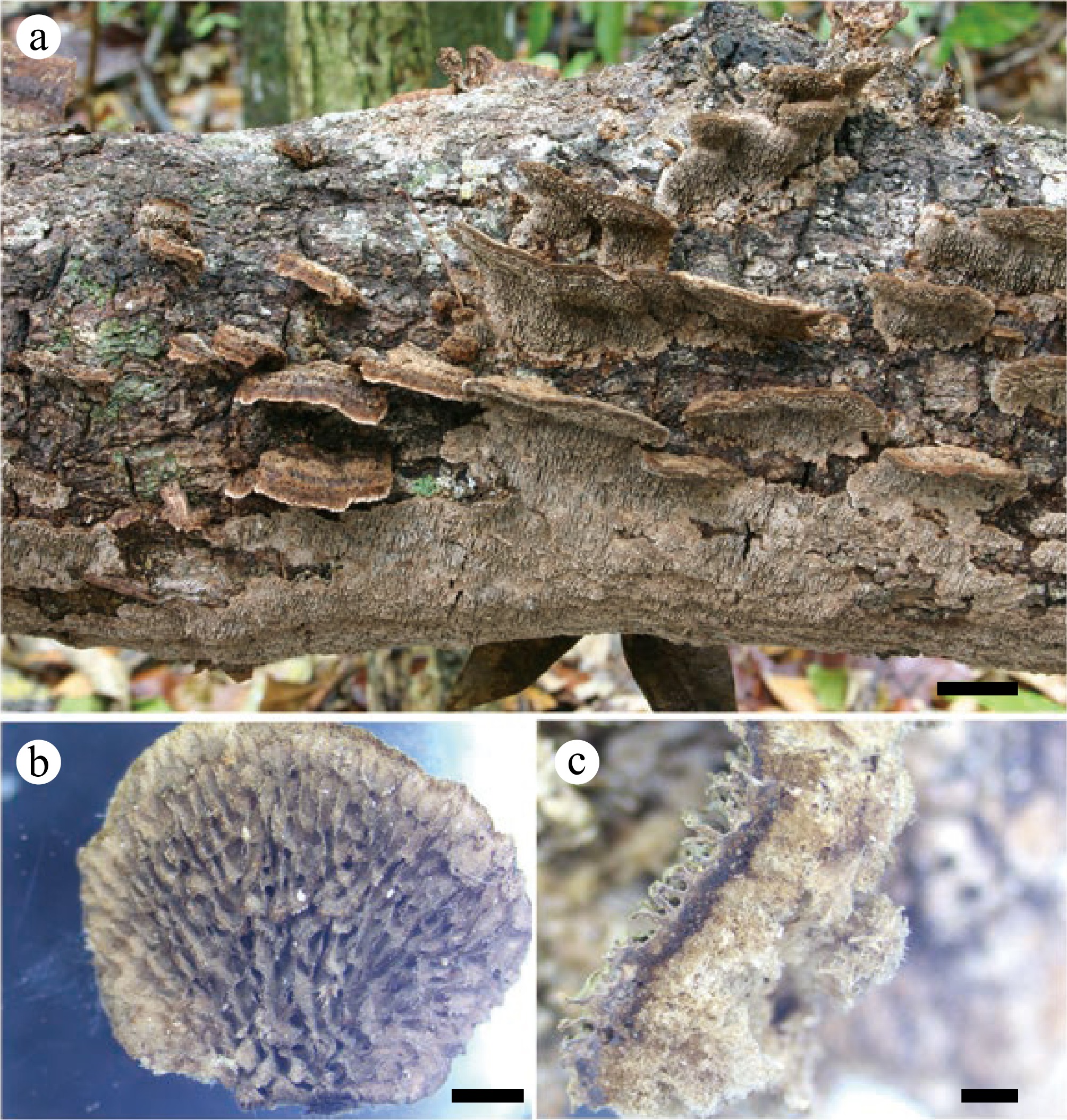 Phylogenetically, Perennihirschioporus caymanensis forms an independent lineage that is related to P. agricola, P. fumosoavellaneus, and P. variabilis. Perennihirschioporus variabilis was originally described from Venezuela[87], and later found in French Guiana (JV1909/4-J). It has sometimes similar pilei as P. caymanensis, with poroid, irpicoid to daedaleoid hymenophore, but never lamellate, and basidiospores are bigger in P. variabilis than in P. caymanensis (4.5–6 × 2.2–2.5 μm vs 3.5–4.3 × 2–2.7 μm). Perennihirschioporus agricola, P. fumosoavellaneus have poroid hymenophores that are readily distinguished from P. caymanensis. P. daedaleus may also be confused with P. caymanensis in its perennial, pileate hymenophores. However, P. daedaleus is distantly related to P. caymanensis phylogenetically and is only found in Malaysia, which is far away from P. caymanensis geographically. Morphologically, P. daedaleus differs from P. caymanensis in having typically triquetrous basidiomata, with daedaleoid to hydnoid hymenophore and thinner context (0.1 mm vs 4 mm).