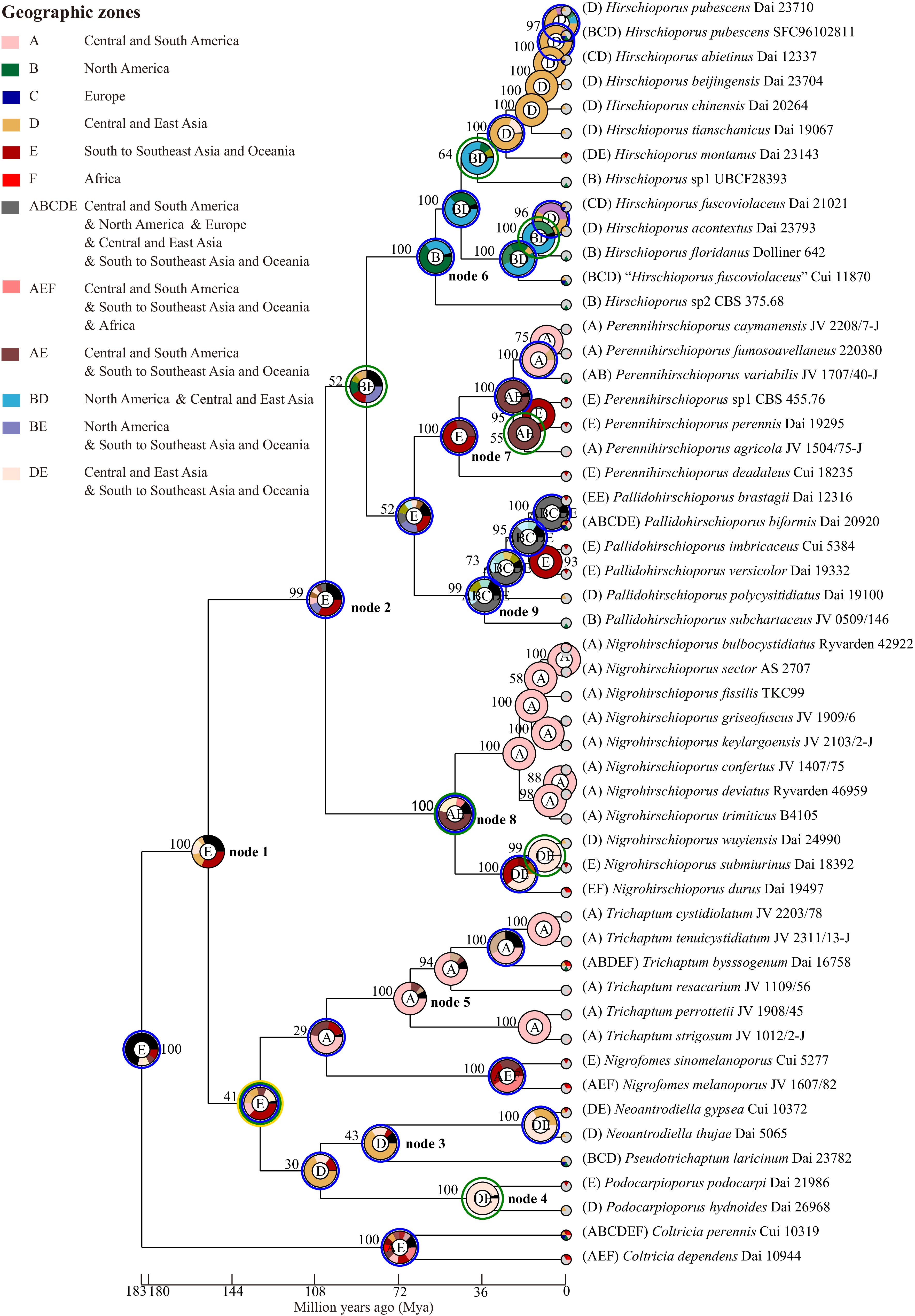 The integration of divergence time estimates with biogeography and morphology represents an important approach for reconstructing the origin and evolution of macrofungi, as demonstrated in previous studies[17,21,35]. The centers of origin of macrofungi appear to be complex, with some lineages likely originating in Eurasia, such as Onnia, Phaeolus, Porodaedalea, and Heterobasidion, while others may have originated in Africa or the Americas, such as ectomycorrhizal Russulaceae and Hirschioporaceae[21,32,35,9395]. In this study, the biogeographic reconstruction of Trichaptum s.l. revealed complex paleogeographic processes. Early divergences around 100–120 Mya coincide with the fragmentation of Gondwana, supporting possible African or South American origins for lineages such as Trichaptaceae[96]. In contrast, the wide distribution of Hirschioporaceae across the Northern Hemisphere may be associated with Laurasian connections and intercontinental dispersals facilitated by land bridges such as Beringia or the North Atlantic Land Bridge. This pattern has also been inferred for other macrofungi[16,33,9799]. These patterns highlight the interplay between continental drift and fungal evolution. In addition, Trichaptum s.l. species distributed in the mountain zones of Central and East Asia exhibit relatively recent divergence times, later than 24 Mya (Figs 2, 15, and 16), and the uplift of the Xizang Plateau may have played an important role in their speciation[100].