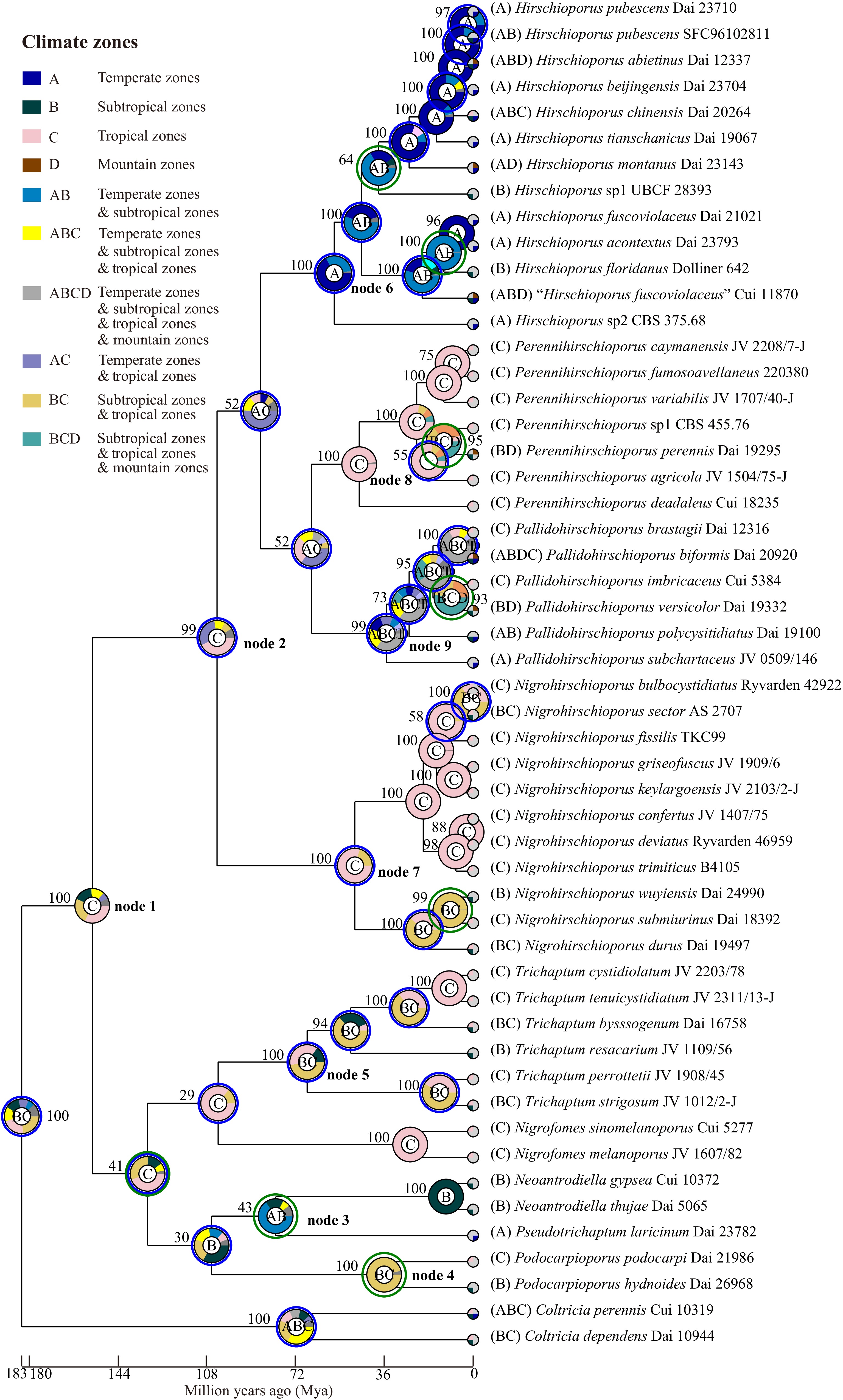 • Climatic adaptations further supported fungal evolutionary scenarios; some fungal groups may have originated in the tropical zone, such as ectomycorrhizal Russulaceae, and some possibly in the temperate zone, such as Hymenochaetales[21,35,92,99]. While Trichaptum s.l. species had a wide range of climate zones, from tropical to temperate, and mountain zones. Temperate-adapted clades from Hirschioporus and Pallidohirschioporus may have expanded during global cooling events of the Eocene–Oligocene transition (about 34 Mya), when temperate forests became widespread in the Northern Hemisphere[101].