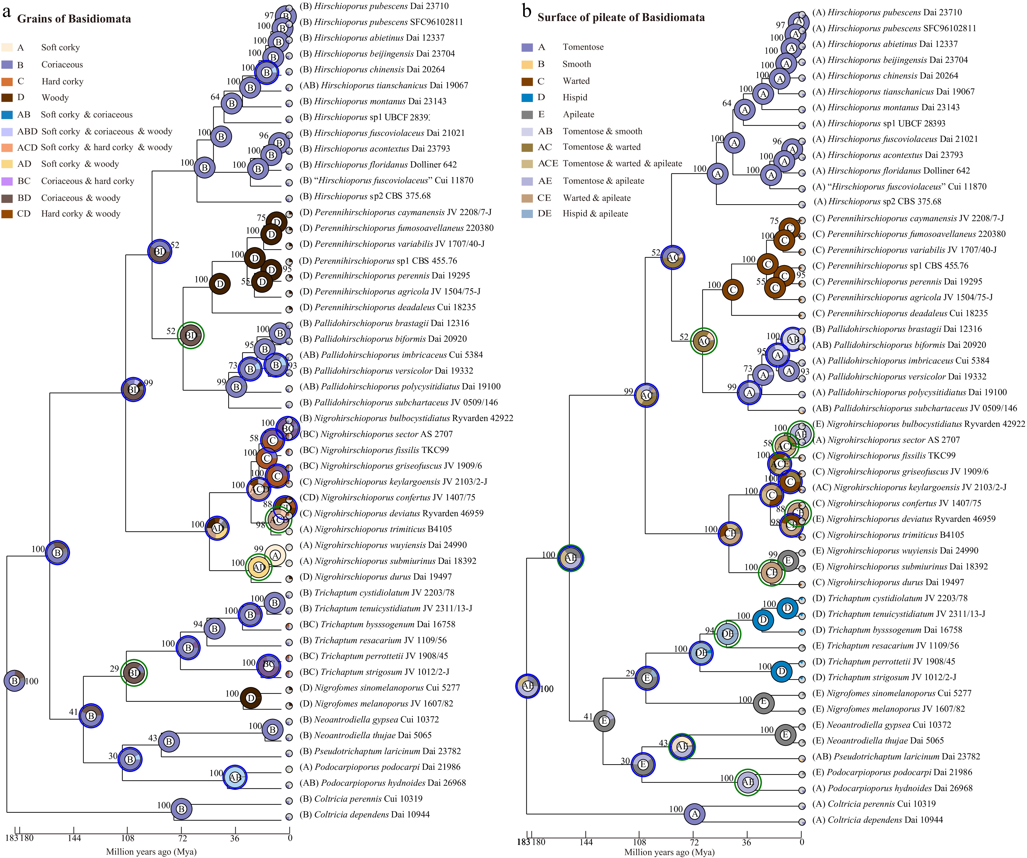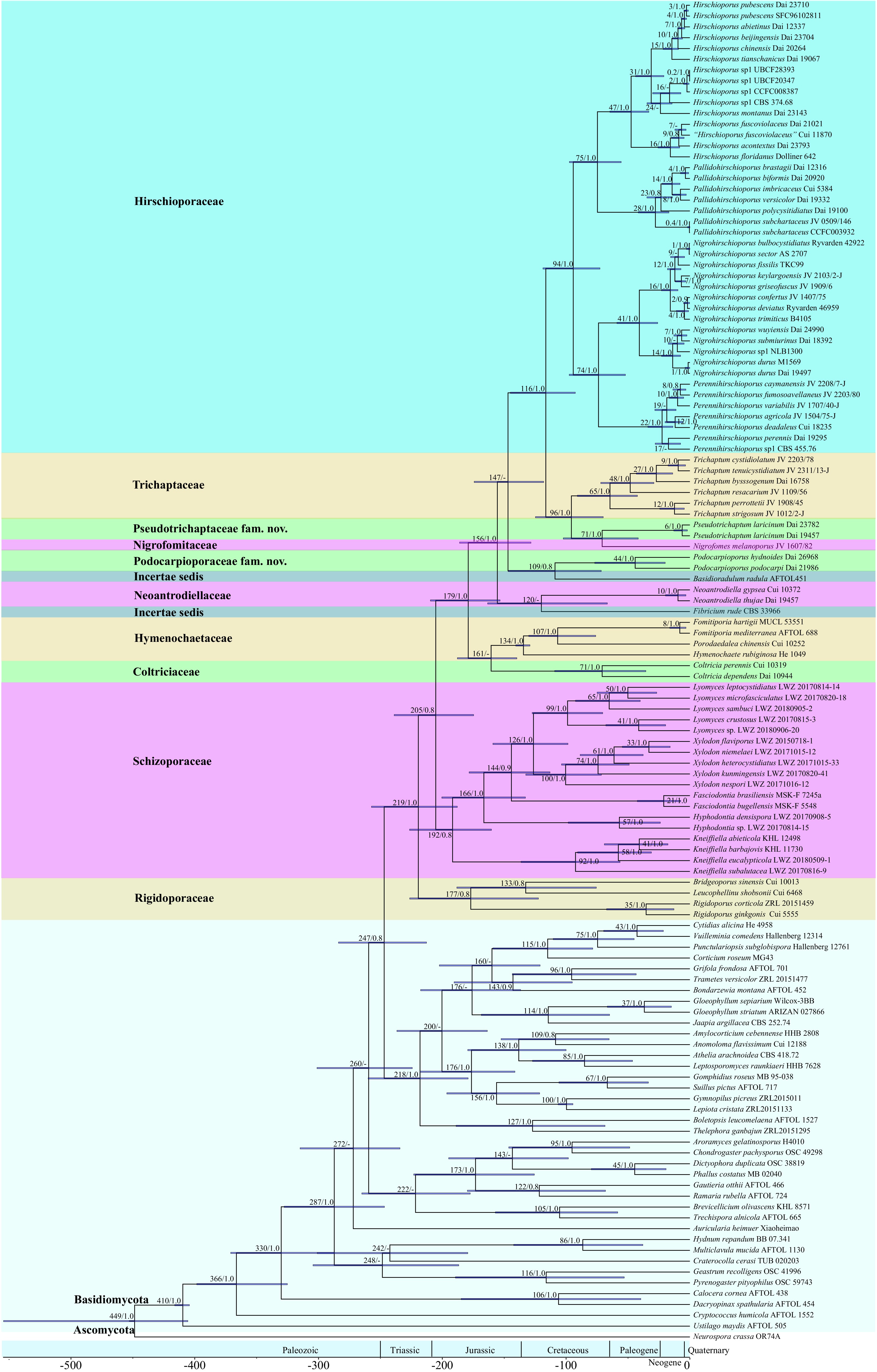 • Currently, phylogenetic and morphological analyses are the main criteria for fungal species identification, and clock-dating analysis has gradually become a key basis for defining higher taxonomic units in fungi due to its important role in inferring fungal divergence times[1719,21]. For example, He et al.[19] suggested that the divergence times within the phylum Basidiomycota for subphyla, classes, orders, and families are estimated to be 443–490 Mya, 312–412 Mya, 102–361 Mya, and 50–289 Mya, respectively. In recent years, the estimated divergence time of the order Hymenochaetales has been showed to range from 167 to 289 Mya[17,35,39,88]. Varga et al.[17] suggests that the rapid radiation of the orders within the class Agaricomycetes occurred during the Jurassic period. Additionally, Zhao et al. estimated that the divergence time of families within Hymenochaetales occurred between 123 and 163 Mya, corresponding to the Early Cretaceous to Late Jurassic periods[35]. These studies laid the foundation for estimating the divergence times of Trichaptum s.l. Zhou et al. estimated the mean stem ages of the families Hirschioporaceae and Trichaptaceae as 121 Mya and 103 Mya[39], respectively, which is in agreement with the results of this study. The mean stem ages of the four families within Trichaptum s.l. ranged from 71 Mya to 116 Mya, overlapping with results from previous studies[19,35,39,88] and supporting the legitimacy of the two newly proposed families. Meanwhile, the families in Trichaptum s.l. occurred during the Cretaceous, whereas individual species originated mainly during the Eocene to the Pleistocene, a period when the present-day continental configuration had largely taken shape. During this time, the global climate was warm and humid, and the diversity of both gymnosperms and angiosperms increased, providing favorable climatic conditions and abundant host trees that facilitated the rapid diversification of macrofungi[17,21,35,8992].