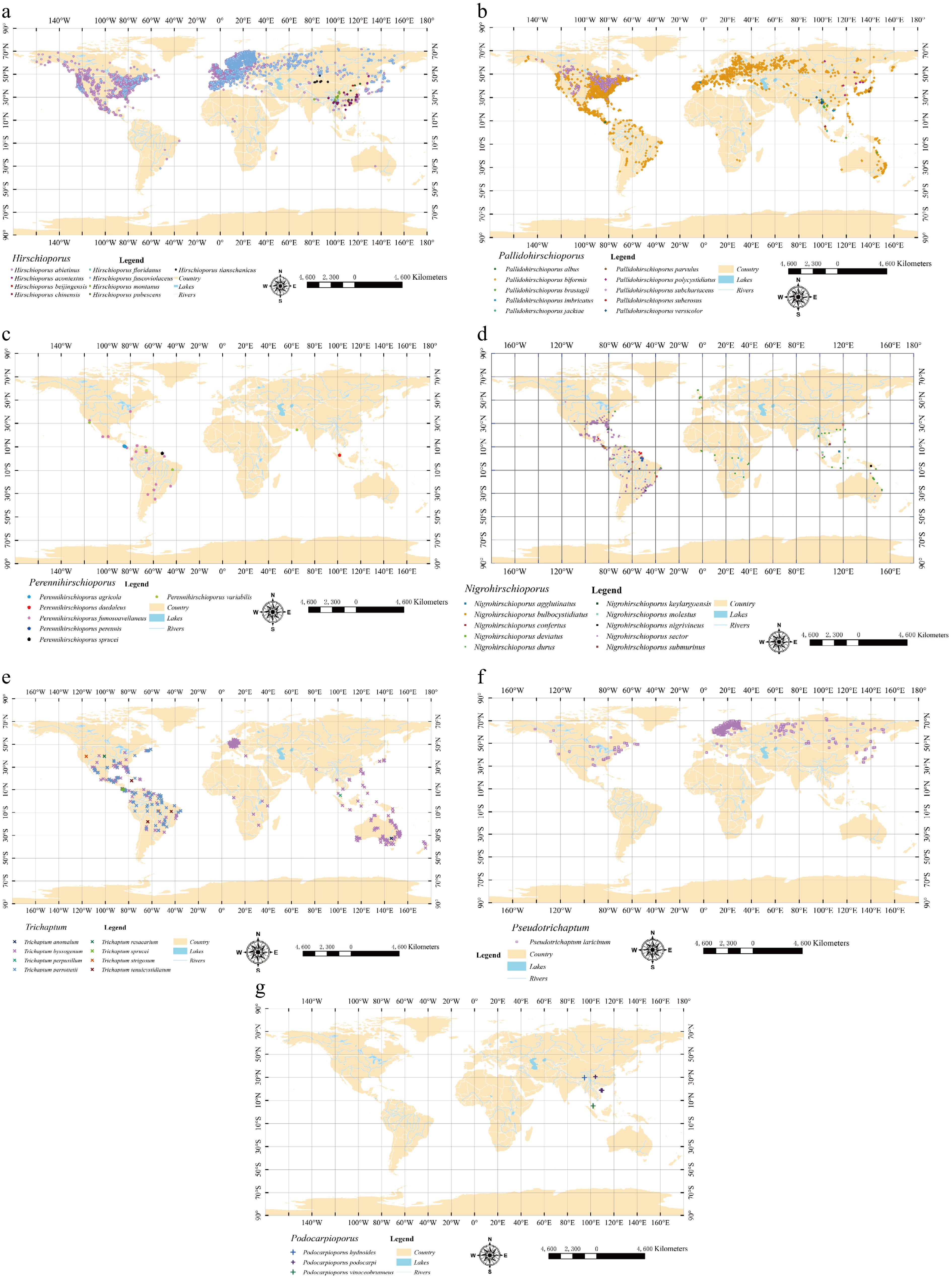• The genus Nigrohirschioporus, a group of poroid fungi colonizing angiosperm wood, exhibits a classic pantropical rainforest distribution pattern, which was concentrated in the world's three major tropical rainforest basins: the Amazon Basin in South America, the Congo Basin in Africa, and the Malesian region in Southeast Asia.