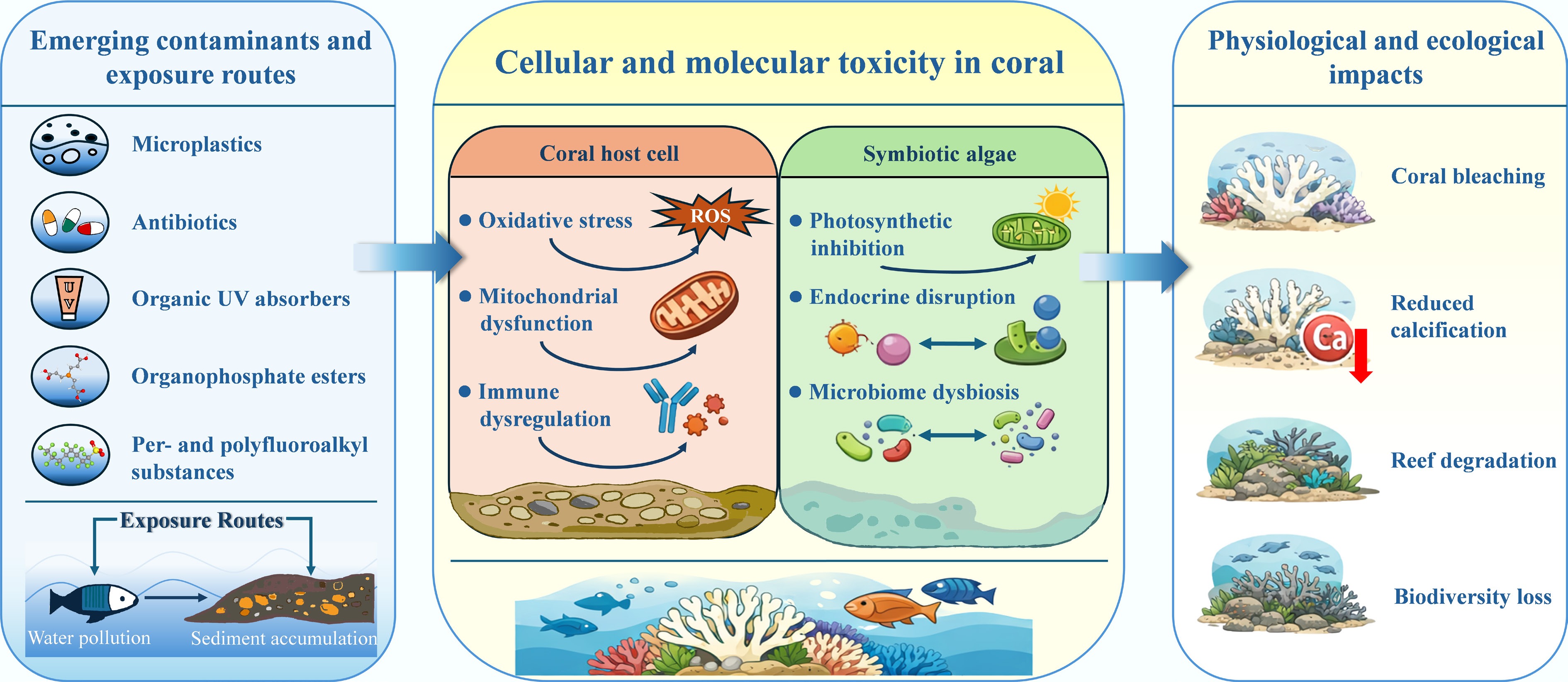 • Coral reefs are among the most biodiverse and ecologically valuable ecosystems on Earth. However, the increasing discharge of pollutants into marine environments from human activities, such as domestic sewage, industrial effluents, and agricultural runoff, has intensified stress on coral communities. These anthropogenic pollutants not only accelerate coral bleaching but also disrupt the ecological stability of reef-associated marine systems. In recent years, growing attention has been paid to the presence and impacts of emerging contaminants (ECs) in coral reef ecosystems. Major EC classes of concern include microplastics (MPs), antibiotics (ABs), organic UV absorbers (OUVAs), organophosphate esters (OPEs), and per- and polyfluoroalkyl substances (PFASs). This review systematically synthesizes current knowledge on the environmental occurrence, spatial distribution, and ecological risks of these five major EC classes in coral reef environments. Key knowledge gaps are highlighted, particularly with respect to mixture toxicity, chronic exposure, and interactions with climate-driven stressors. Finally, an integrated multi-stressor risk framework is proposed to support future monitoring, pollution management, and coral reef conservation under global environmental change.