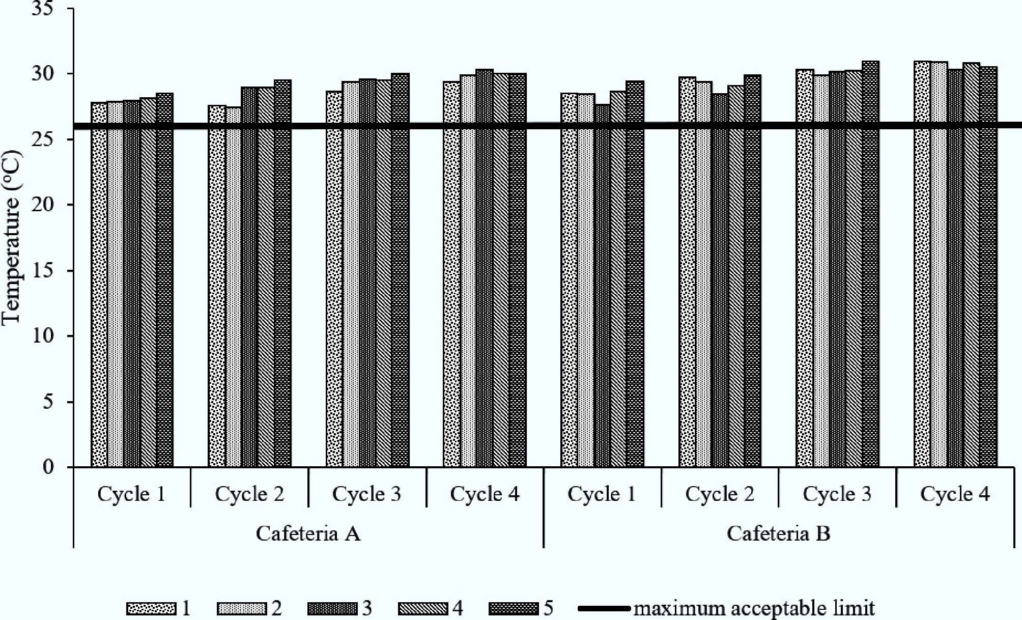 Temperature in cafeterias A and B for five sampling points across four cycles.