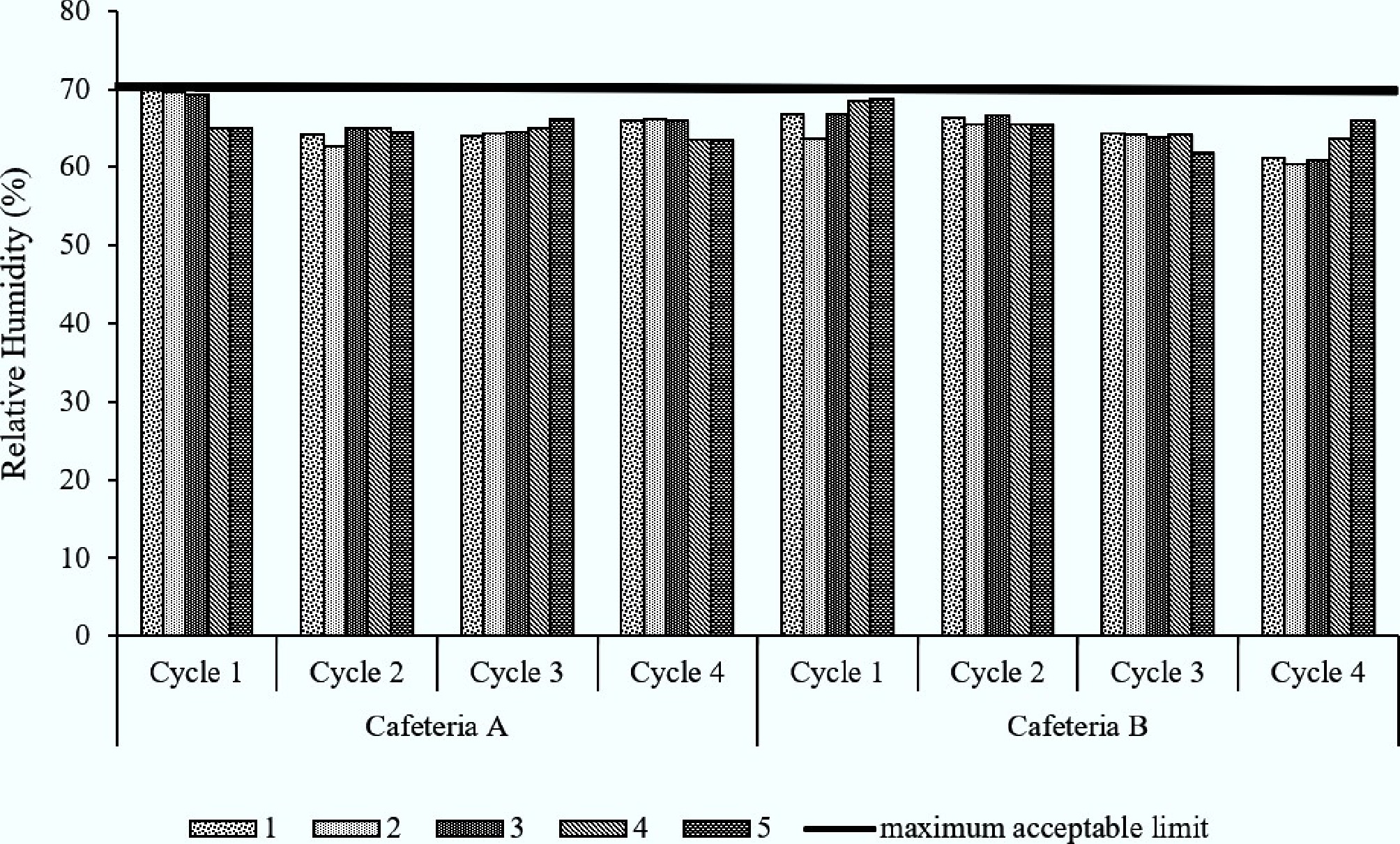 Relative humidity in cafeterias A and B at five sampling points across four cycles.