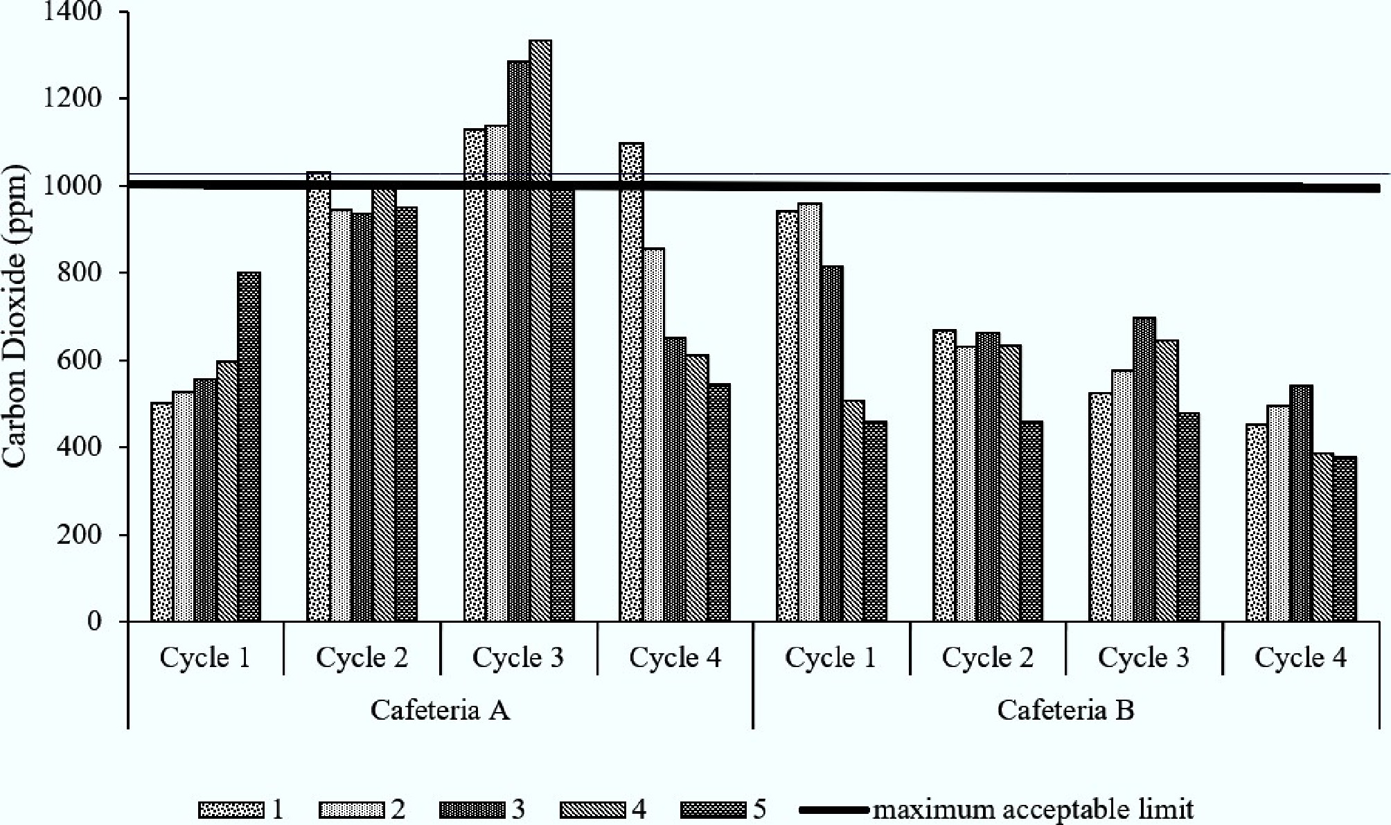 Carbon dioxide in cafeterias A and B at five sampling points across four cycles.