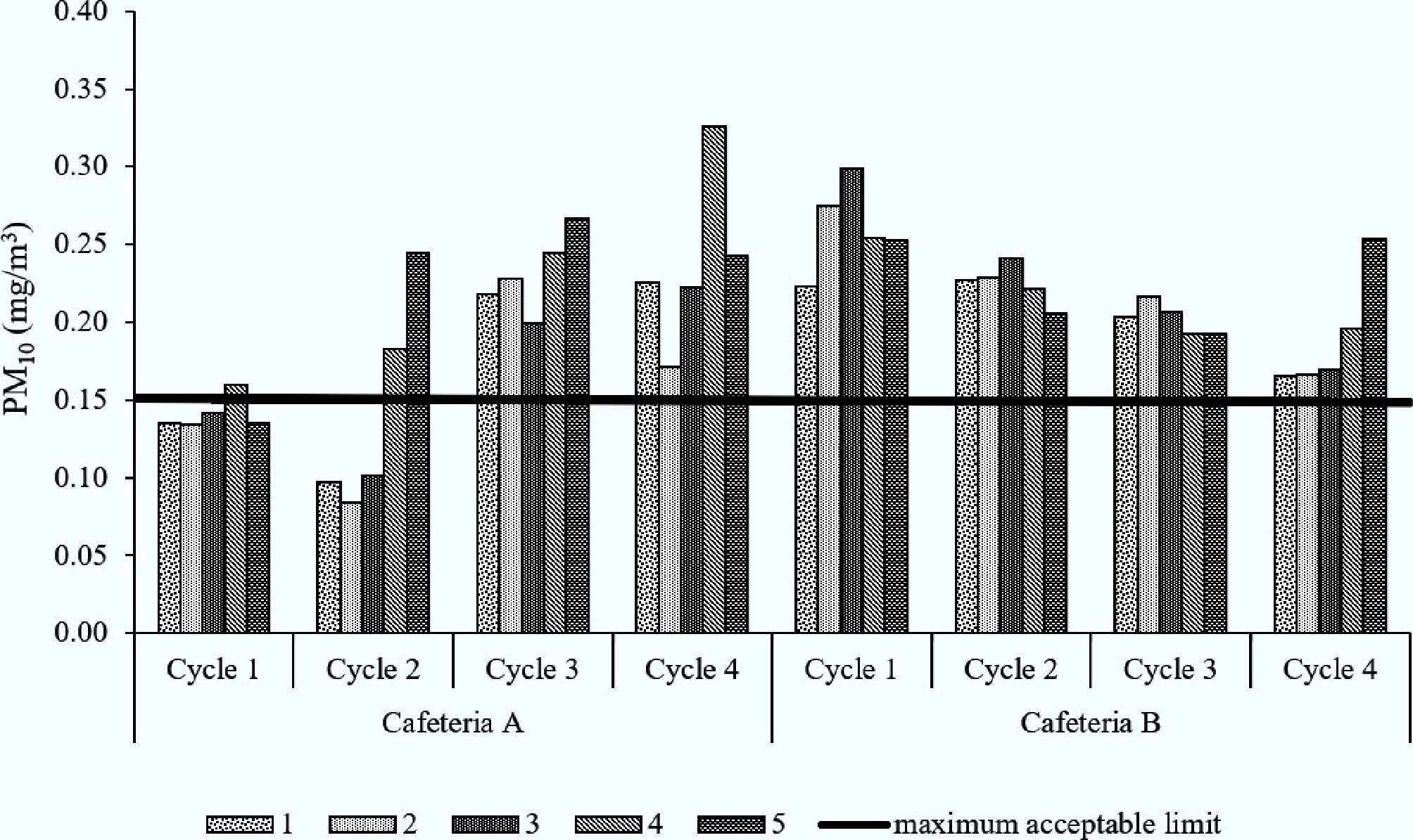 PM10 in cafeterias A and B at five sampling points across four cycles.