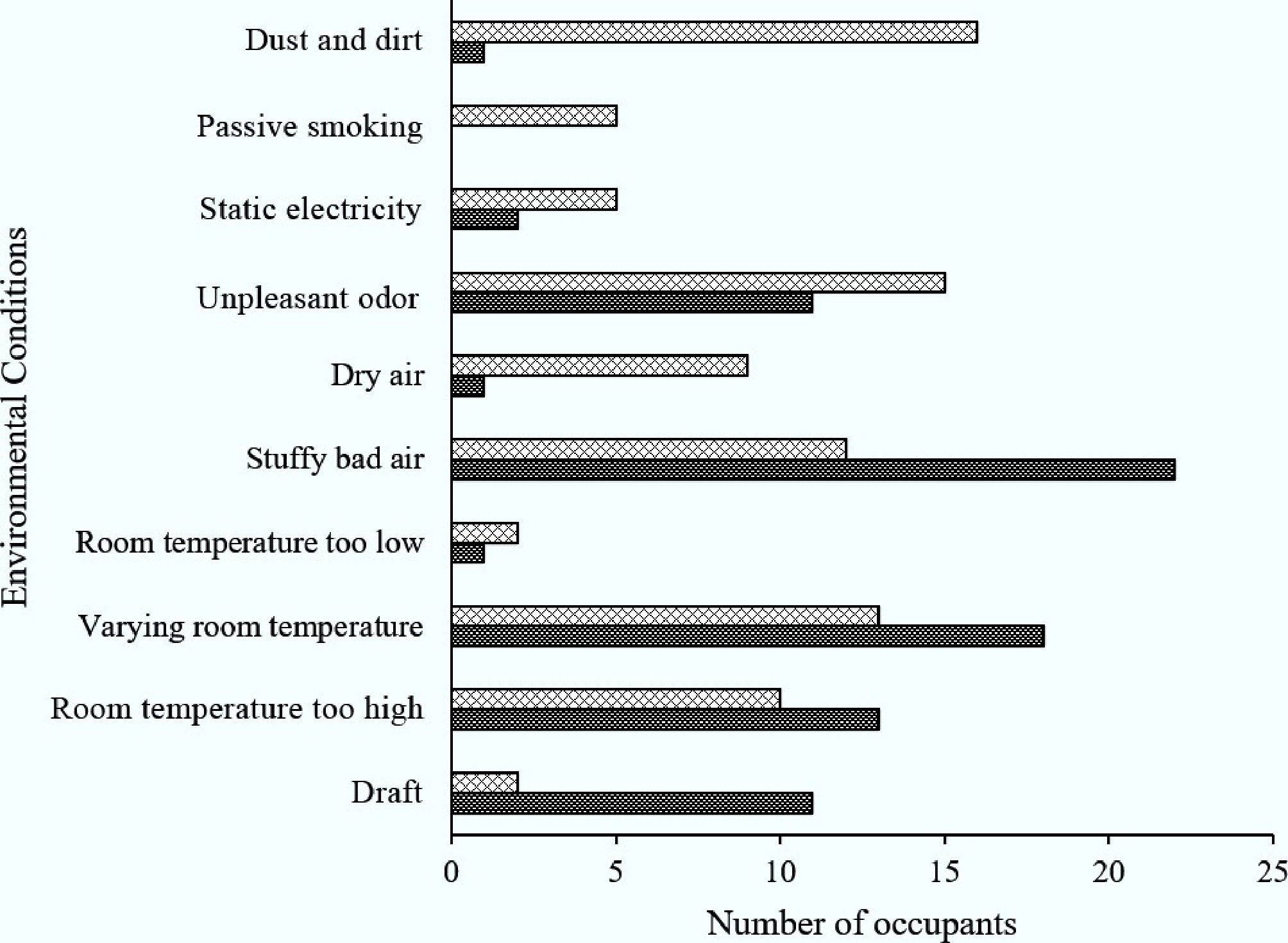 • Figure 6 displays present symptoms that often affect the occupants in cafeterias A and B. In cafeteria A, the major present symptoms were 18% dizziness, 16% cough, and 16% feeling heavy-headed. These health symptoms were associated with the high and uneven temperature in cafeteria A, especially high occupancy. In addition, PM10 irritated the pulmonary airways and caused coughing[40]. On the other hand, occupants experienced difficulties concentrating (19%), headache (10%), and drowsiness (10%) in cafeteria B. Besides the temperature issue, elevated concentrations of PM10 were associated with neurological disorders[41]. High total bacterial counts in cafeteria environments are strongly indicative of a quantifiable health risk, with recurrent headaches emerging as a prominent acute adverse health effect—one closely linked to exposure to ambient microbial byproducts, endotoxins, or volatile organic compounds released by proliferating bacteria[39].
