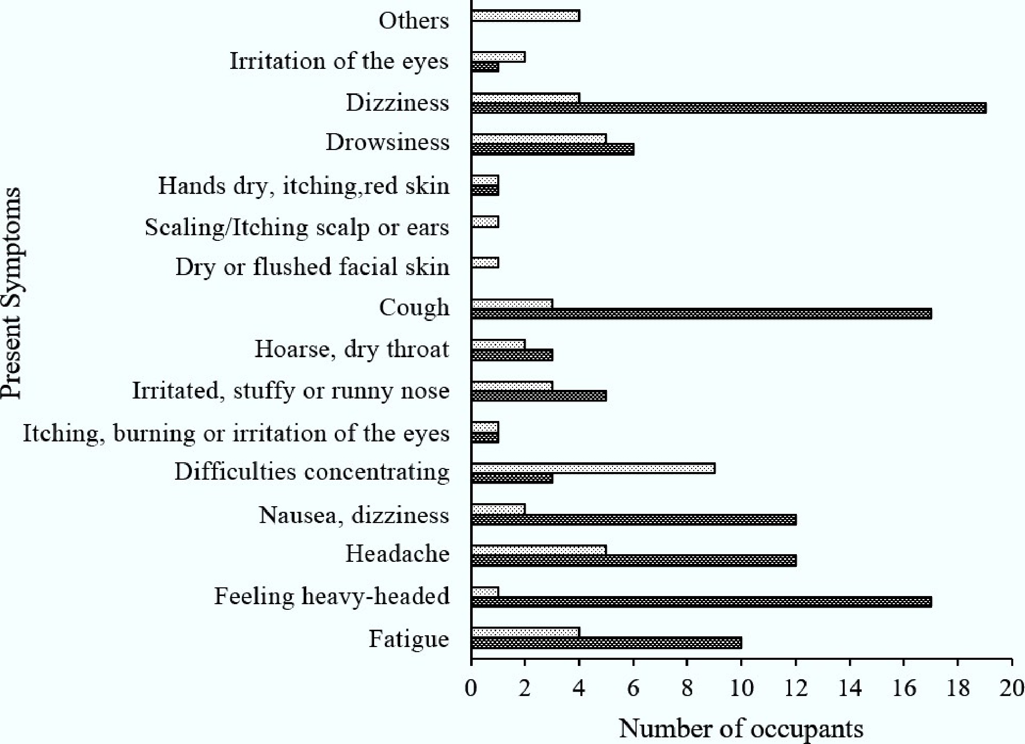Present symptoms of occupants in cafeterias A and B that often affect the occupants.