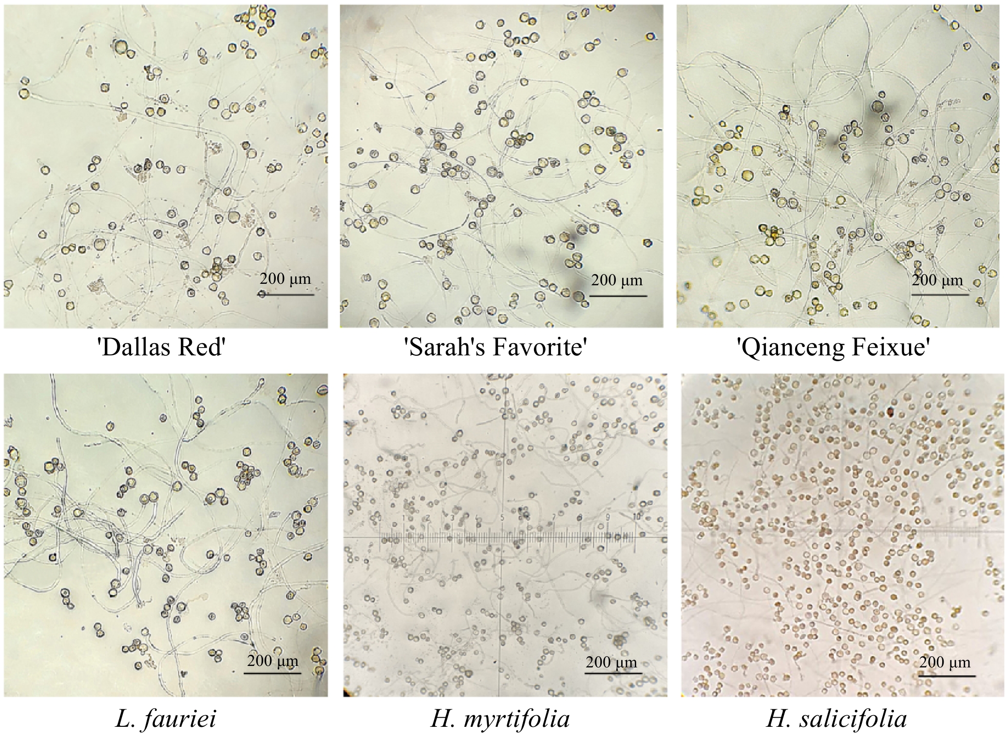 H. salicifoliaH. salicifolia × L. indica 'Sarah's Favorite' L. indica 'Catawba' × H. myrtifolia H. myrtifolia × L. indica 'Catawba' L. indica 'Catawba' × H. salicifolia H. salicifolia × L. indica 'Catawba' L. indica 'Qianceng Feixue' ×