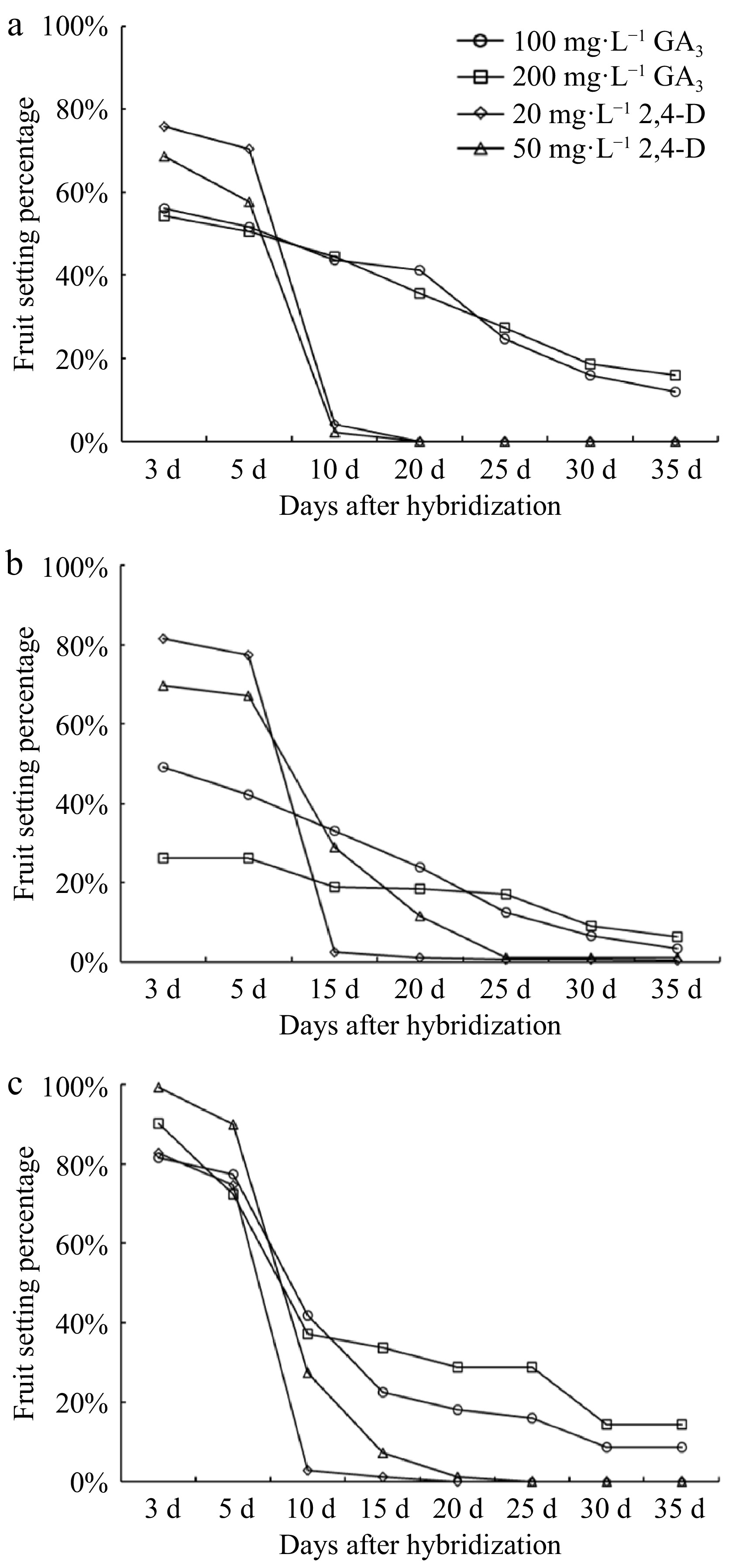 Fruiting rate of three pollination combinations with Lagerstroemia as female parent treated with GA3 and 2,4-D. (a) L. fauriei × H. salicifolia; (b) 'Sarah's Favorit' × H. salicifolia; (c) 'Qianceng Feixue' × H. myrtifolia.