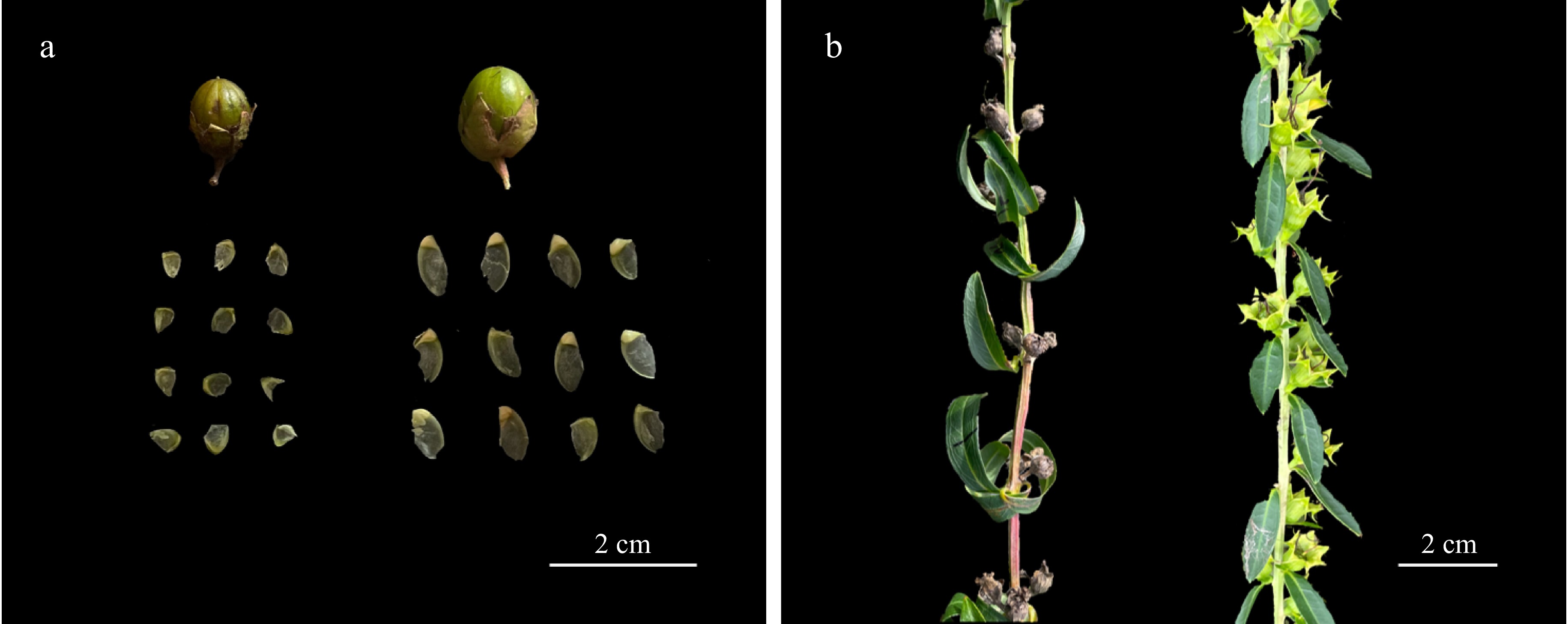 Fruit morphology after distant hybridization. (a) Fruit and seeds of 'Qianceng Feixue' × H. myrtifolia (left) and 'Qianceng Feixue' × 'Sarah's Favorite' (right) 35 d after pollination. (b) Hybrid fruits of H. salicifolia × 'Qianceng Feixue' (left), and H. salicifolia × H. salicifolia (right) 20 d after pollination.