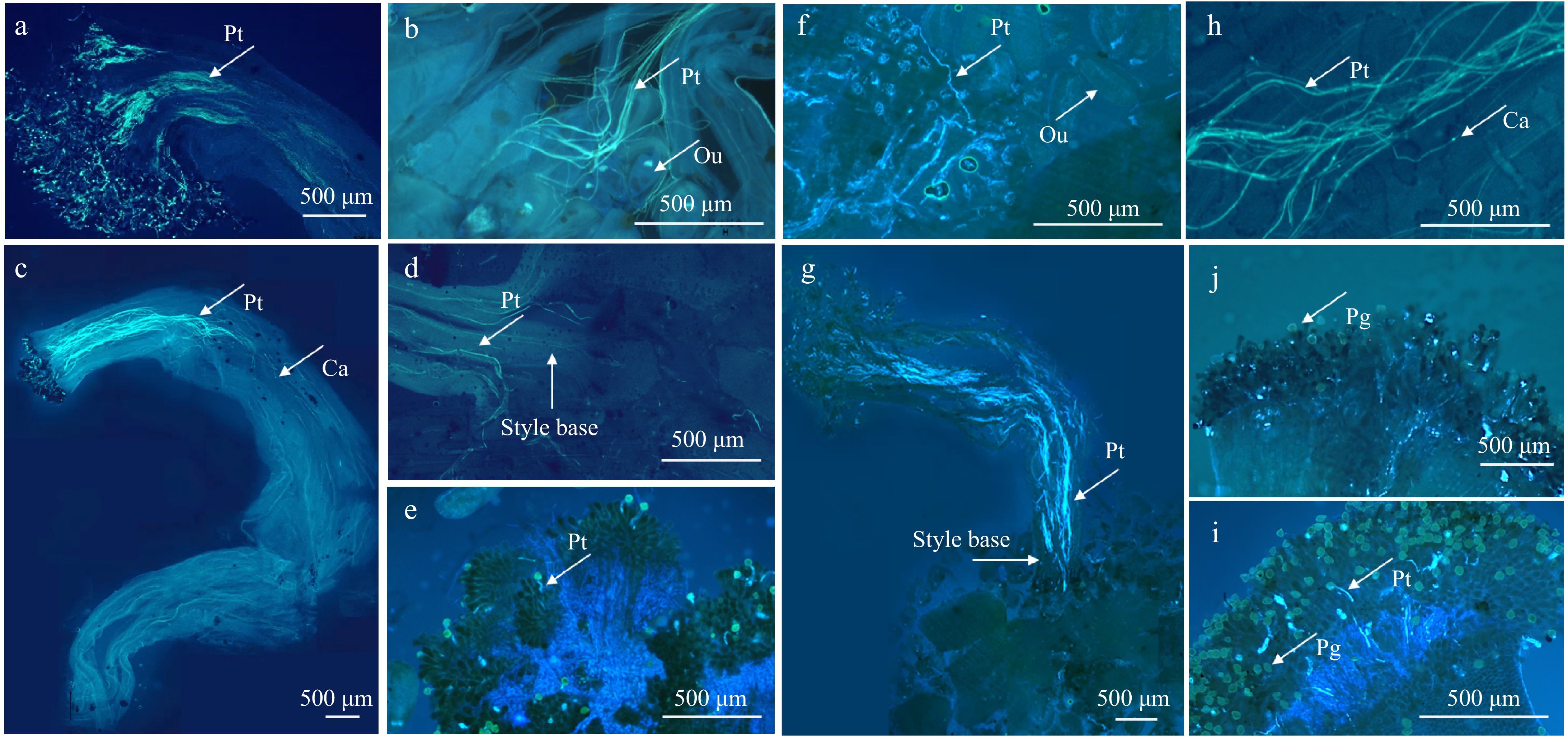 The behavior of pollen tubes in different cross combinations. (a) Pollen tubes elongated downward 12 h after pollination in 'Sarah's Favorite' × H. salicifolia. (b) Few pollen tubes extend into the ovary 48 h after pollination in 'Sarah's Favorite' × H. salicifolia. (c) Pollen tubes were mostly confined to about 1/4 of the stigma in L. fauriei × H. salicifolia. (d) Few pollen tubes reached the base of pistil in L. fauriei × H. salicifolia. (e) Pollen tubes stretched 2 h after pollination in H. salicifolia × 'Dallas Red'. (f) A few pollen tubes entered the ovary 48 h after pollination in H. salicifolia × L. fauriei. (g) The main obstacle occurred at the base of the pistil 72 h after pollination in H. myrtifolia × L. fauriei. (h) Callose were produced in the style 12 h after pollination in 'Sarah's Favorite' × H. salicifolia. (i) A few pollens germinated 4 h after pollination in H. salicifolia × 'Sarah's Favorite' without mentor pollens. (j) Pollen failed to germinate in 4 h after pollination in 'Sarah's Favorite' × H. salicifolia without mentor pollens. Pt: Pollen tube. Pg: Pollen grain. Ca: Callose. Ou: Ovule.