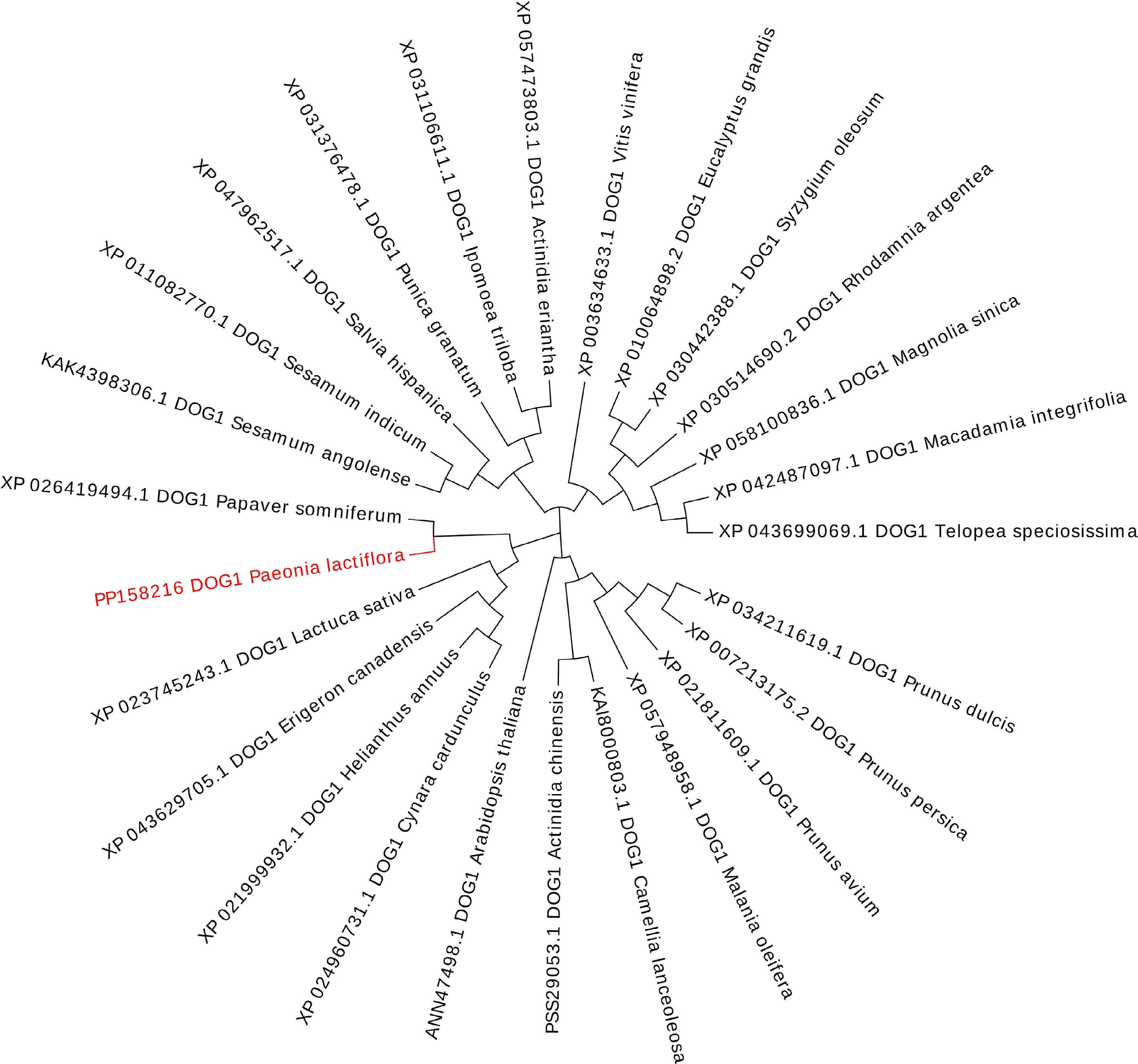 • The CDS of PlDOG1 was cloned and submitted to GenBank with the accession number PP158216. The PlDOG1 gene contains a 786 bp open reading frame (ORF), encoding a 261-amino acid protein with a predicted molecular weight of 29.72 kDa. Conserved domain analysis indicated that PlDOG1 contains a highly conserved DOG1 superfamily domain, commonly found in plants, indicating its high specificity and involvement in seed dormancy regulation (Supplementary Fig. S1). A phylogenetic tree was generated to analyze the evolutionary relationships of PlDOG1 with DOG1 proteins from diverse plant species, demonstrating a close evolutionary affinity between PlDOG1 and the DOG1 protein of Papaver somniferum (Fig. 1).