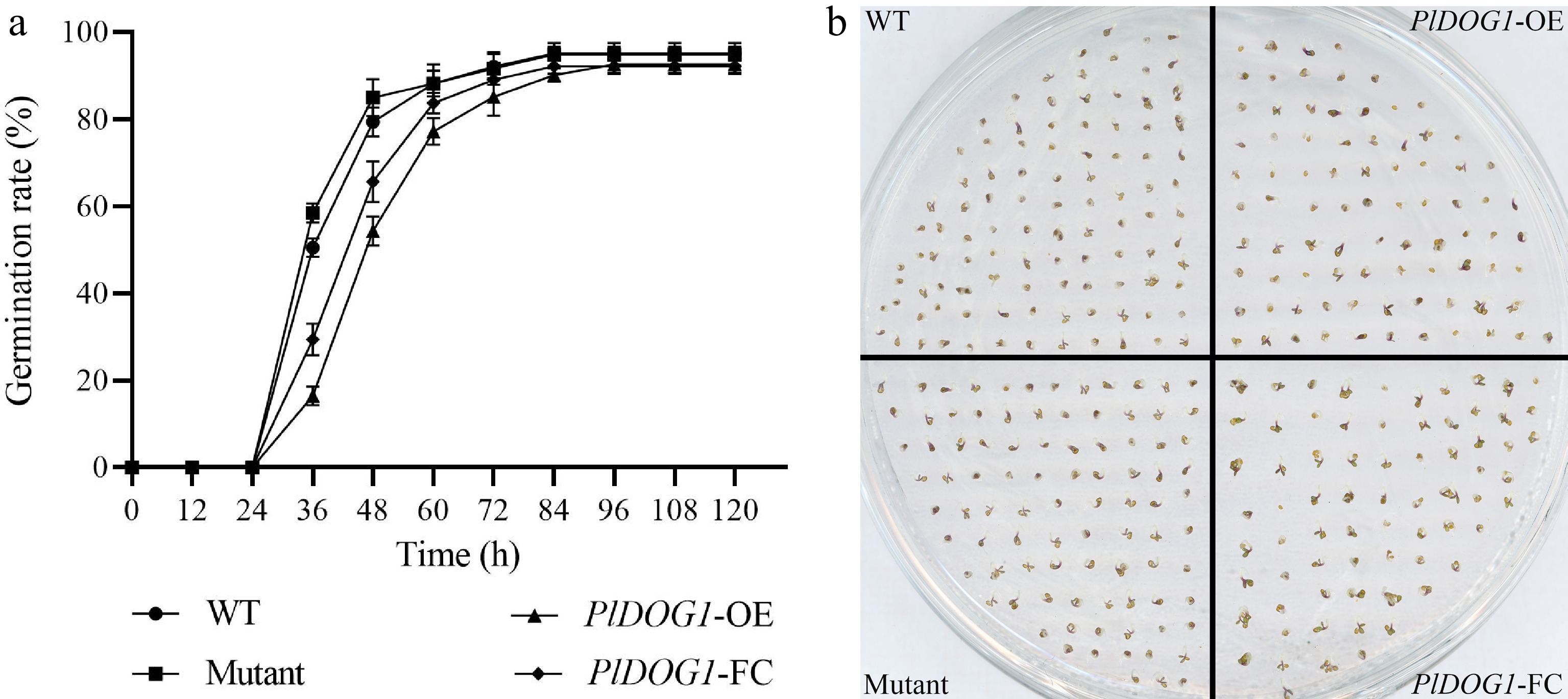 Germination analysis of wild type, PlDOG1 overexpression, PlDOG1 complement expression and PlDOG1 function deficient Arabidopsis seeds. (a) Germination rates statistical analysis of different A. thaliana seeds. (b) Germination phenotype at 60 h. WT, wild type; PlDOG1-OE, transgenic overexpression seeds; PlDOG1-FC, mutant plants with functional complementation expression; Mutant, DOG1 deficient mutant seeds. Three independent biological replicates were prepared. Data differences were analyzed for significance using one-way analysis of variance (ANOVA) followed by Duncan's test.
