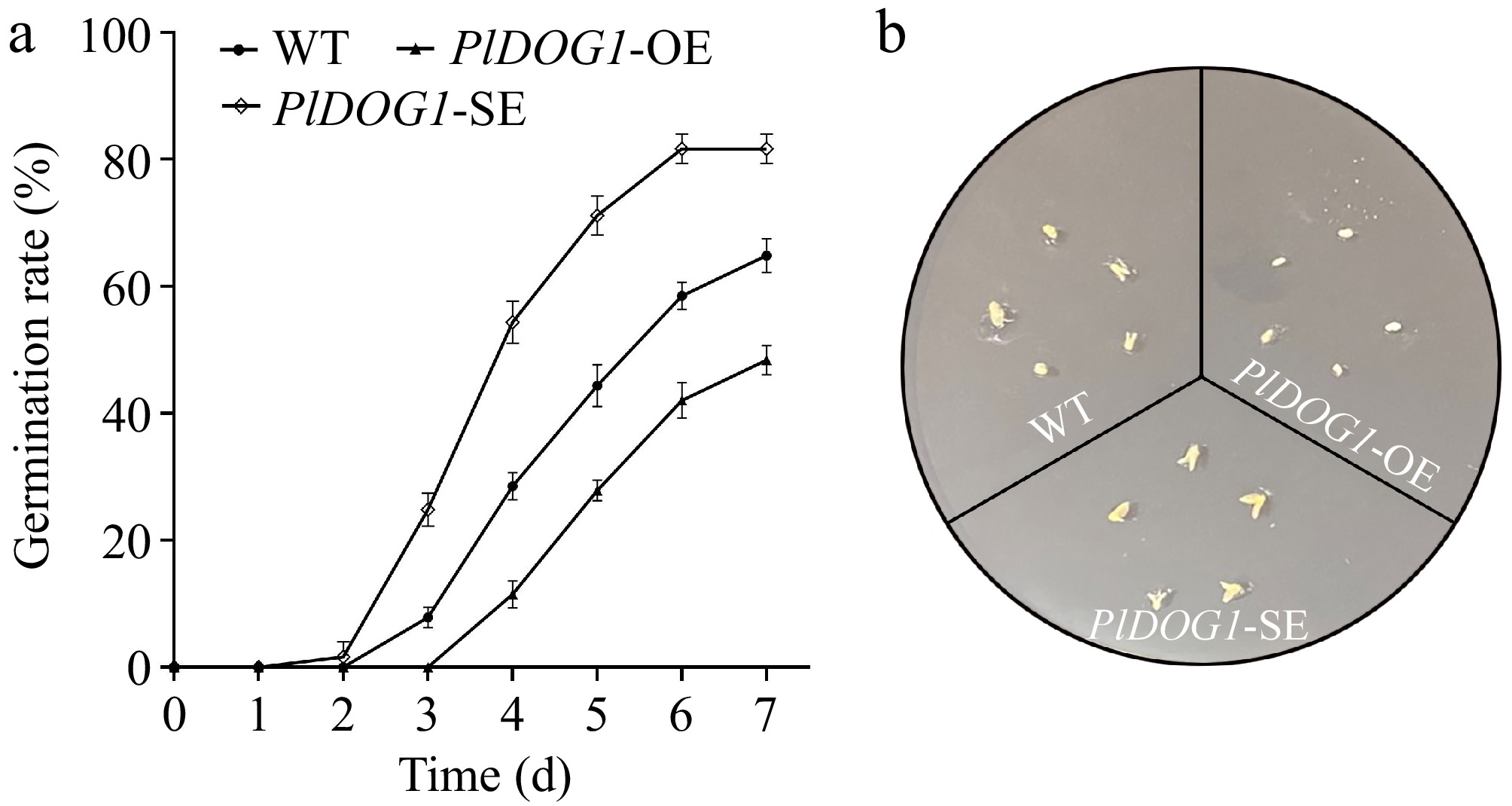 Phenotypic and statistics analysis of PlDOG1 transgenic P. lactiflora embryos. (a) Germination rates statistical analysis of different P. lactiflora embryos. (b) Embryos germination phenotype observed on MS medium containing 0.5 mg/L GA3 after 4-d cultivation. WT, ddH2O water-transformed embryos; PlDOG1-OE, PlDOG1 overexpressed embryos; PlDOG1-SE, PlDOG1 silenced embryos. Three independent biological replicates were prepared. Data differences were analyzed for significance using one-way analysis of variance (ANOVA) followed by Duncan's test.